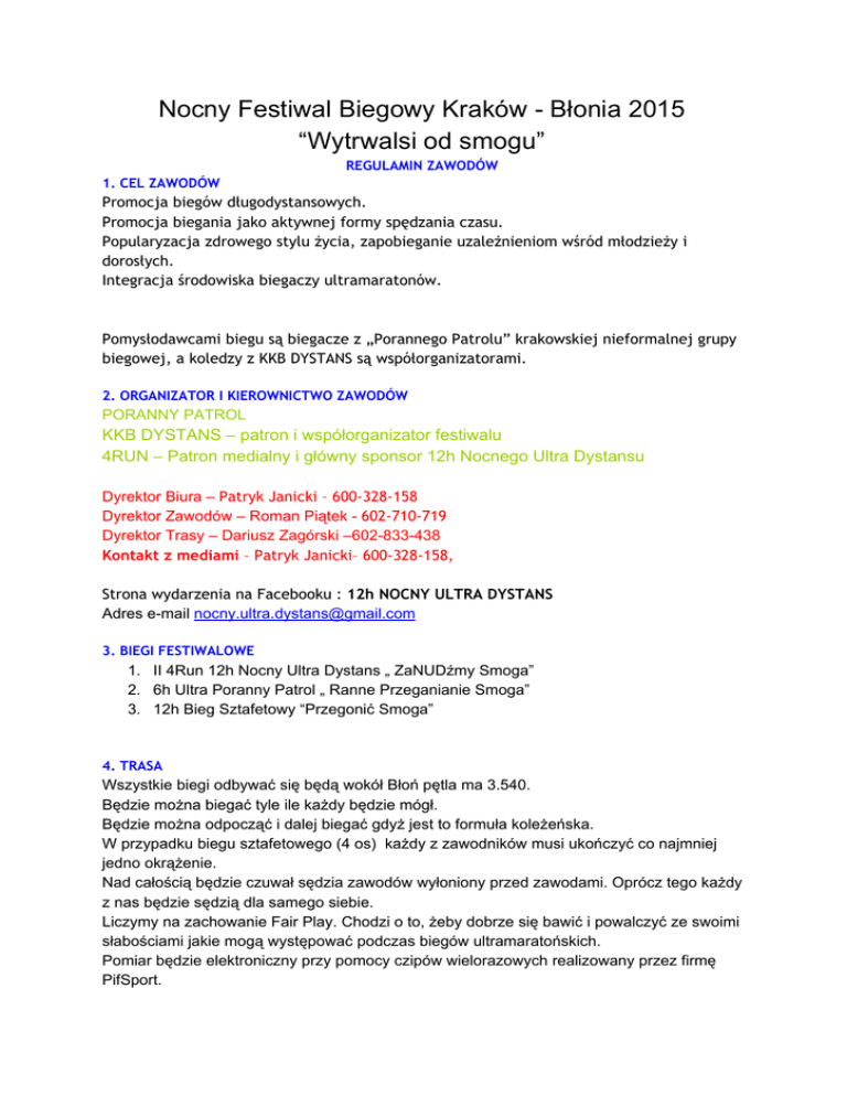Nocny Festiwal Biegowy Kraków Błonia 2015 “Wytrwalsi od smogu” REGULAMIN ZAWODÓW 1. CEL ZAWODÓW Promocja biegów długodystansowych. Promocja biegania jako aktywnej formy spędzania czasu. Popularyzacja zdrowego stylu życia, zapobieganie uzależnieniom wśród młodzieży i dorosłych. Integracja środowiska biegaczy ultramaratonów. Pomysłodawcami biegu są biegacze z „Porannego Patrolu” krakowskiej nieformalnej grupy biegowej, a koledzy z KKB DYSTANS są współorganizatorami. 2. ORGANIZATOR I KIEROWNICTWO ZAWODÓW PORANNY PATROL KKB DYSTANS – patron i współorganizator festiwalu 4RUN – Patron medialny i główny sponsor 12h Nocnego Ultra Dystansu Dyrektor Biura – Patryk Janicki – 600-328-158 Dyrektor Zawodów – Roman Piątek 602-710-719 Dyrektor Trasy – Dariusz Zagórski –602833438 Kontakt z mediami – Patryk Janicki– 600-328-158, Strona wydarzenia na Facebooku : 12h NOCNY ULTRA DYSTANS Adres email [email protected] 3. BIEGI FESTIWALOWE 1. II 4Run 12h Nocny Ultra Dystans „ ZaNUDźmy Smoga” 2. 6h Ultra Poranny Patrol „ Ranne Przeganianie Smoga” 3. 12h Bieg Sztafetowy “Przegonić Smoga” 4. TRASA Wszystkie biegi odbywać się będą wokół Błoń pętla ma 3.540. Będzie można biegać tyle ile każdy będzie mógł. Będzie można odpocząć i dalej biegać gdyż jest to formuła koleżeńska. W przypadku biegu sztafetowego (4 os) każdy z zawodników musi ukończyć co najmniej jedno okrążenie. Nad całością będzie czuwał sędzia zawodów wyłoniony przed zawodami. Oprócz tego każdy z nas będzie sędzią dla samego siebie. Liczymy na zachowanie Fair Play. Chodzi o to, żeby dobrze się bawić i powalczyć ze swoimi słabościami jakie mogą występować podczas biegów ultramaratońskich. Pomiar będzie elektroniczny przy pomocy czipów wielorazowych realizowany przez firmę PifSport. 5. TERMIN I MIEJSCE Termin startu: 1. 12h Nocny Ultra Dystans „ ZaNUDźmy Smoga” : Start Piątek, 31.07.2015 r., godz. 20.00, META w Sobotę 1.08.2015r godz.8.00. 2. 6h Ultra Poranny Patrol „ Ranne Przeganianie Smoga” : Start Sobota 01.08.2015 godz 2:00, META godz. 8:00 3. 12h Bieg Sztafetowy Przegonić smoga : Start Piątek, 31.07.2015 r., godz. 20.00, META w Sobotę 1.08.2015r godz.8.00. Biuro zawodów: KRAKÓW, UL. Na Błoniach 7 ( przy Hostelu Juvenia obok Krakowskich Błoń) 6. WARUNKI UCZESTNICTWA ● Uczestnikiem zawodów może być osoba, która najpóźniej w dniu startu ukończy 18 lat. ● Biegi będą miały charakter koleżeński, są organizowane przez biegaczy dla biegaczy. ● Organizowane wyłącznie z opłat startowych (tak jak na dotychczasowych naszych imprezach biegowych, które są organizowane na krótszych dystansach). ● W związku z tym, że jest to biegi koleżeńskie – kameralne jeżeli pojawią się jakieś niedociągnięcia lub zmiany w regulaminie prosimy o wyrozumiałość dla organizatorów. ● Zawodnicy zgłaszając się do biegu oświadczają, że startują na własną odpowiedzialność. Warunkiem dopuszczenia zawodnika do biegu będzie złożenie przez niego podpisu pod oświadczeniem o braku przeciwwskazań lekarskich do udziału w biegu ultramaratońskim. ● Zawodnicy przed startem muszą zostać zweryfikowani w Biurze Zawodów poprzez okazanie dowodu tożsamości. ● Sztafeta składa się z czterech osób dowolnej płci. 7. ZGŁOSZENIA Zgłoszenia przyjmowane są poprzez formularz dostępny na stronie internetowej: URUCHOMIONE ZAPISY NA STRONIE: http://goo.gl/forms/npEXmLAHMy Przewiduje się następujący limit startujących: 200 osób Organizator zastrzega sobie prawo zwiększenia limitu. Po zgłoszeniu należy dokonać opłaty startowej. Lista zgłoszonych zawodników będzie uaktualniana na bieżąco na stronie firmy obsługującej zapisy http://www.egepard.eu/pl/showcontest/60 8. WPISOWE 1. 12h Nocny Ultra Dystans „ ZaNUDźmy Smoga” 90zł do 25072015 2. 6h Ultra Poranny Patrol „ Ranne Przeganianie Smoga” 65zł do 25072015 3. 12h Bieg Sztafetowy “Przegonić smoga” 190zł/sztafetę do 25072015 Opłatę należy wnosić przelewem na konto bankowe Organizatora. Artur Susz MBANK Nr konta: 43 1140 2004 0000 3202 6763 5586 Tytuł wpłaty: nazwa biegu, imię i nazwisko, rok urodzenia. Nazwa biegu: NOCNY ULTRA DYSTANS ULTRA PORANNY PATROL lub w przypadku biegu sztafetowego Tytuł wpłaty: SZTAFETA nazwa_sztafety 9. WYPOSAŻENIE OBOWIĄZKOWE W trakcie trwania Zawodów każdy zawodnik musi posiadać przy sobie wyposażenie obowiązkowe.. W skład wyposażenia obowiązkowego wchodzi: numer startowy, elementy odblaskowe na odzieży, chip dostarczony przez organizatora 10. ŚWIADCZENIA STARTOWE W ramach wpisowego Organizator zapewnia zawodnikom: ● pakiet startowy ● gwarantujemy niezapomniany ból, niezapomnianą radość ● atmosferę rodzinną ● napoje i wyżywienie na trasie Zawodów (lokalizacja punktu odżywczego oraz jego wyposażenie w okolicy startmeta) ● ciepły posiłek w trakcie biegu lub zimny jak kto woli ● przekąski w trakcie trwania biegu ● napoje: herbata, kawa, izotoniki, woda ● dla smakoszy będzie też słynny rosół ● puchary i nagrody dla najlepszych oraz wyjątkowy medal dla każdego po ukończeniu biegu ● aby otrzymać medal i certyfikat ukończenia biegu trzeba wystartować i ukończyć bieg zgodnie z zasadami ujętymi w regulaminie. ● organizator dopuszcza rozszerzenie pakietu startowego oraz puli nagród w zależności od hojności sponsorów. Koleżanki i koledzy podczas biegu będzie nam pomagał nasz kolega fizjoterapeuta Grzegorz Roczniak z FizjoAktiva. Skurcze i inne dolegliwości już Was nie zatrzymają . 11. Zakończenie Zakończenie i rozdanie nagród rozpoczniemy około godziny 9:30 9.45 12. KLASYFIKACJA I NAGRODY 1. 12h Nocny Ultra Dystans „ ZaNUDźmy Smoga”: Będzie prowadzona osobna klasyfikacja OPEN Kobiet i Mężczyzn Nagrody w klasyfikacja OPEN kobiet i mężczyzn i. I miejsce nagrody o wartosci 400zł ii. II miejsce nagrody o wart