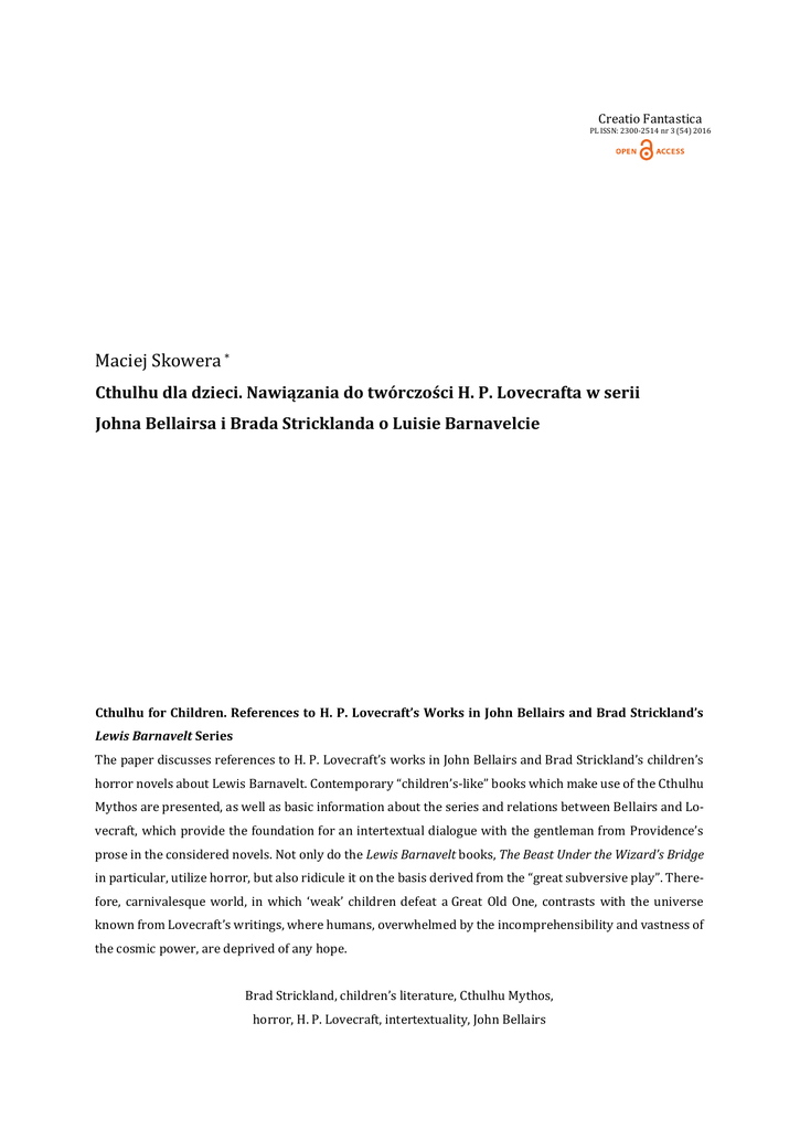 Creatio Fantastica PL ISSN: 2300-2514 nr 3 (54) 2016 Maciej Skowera * Cthulhu dla dzieci. Nawiązania do twórczości H. P. Lovecrafta w serii Johna Bellairsa i Brada Stricklanda o Luisie Barnavelcie Cthulhu for Children. References to H. P. Lovecraft’s Works in John Bellairs and Brad Strickland’s Lewis Barnavelt Series The paper discusses references to H. P. Lovecraft’s works in John Bellairs and Brad Strickland’s children’s horror novels about Lewis Barnavelt. Contemporary “children’s-like” books which make use of the Cthulhu Mythos are presented, as well as basic information about the series and relations between Bellairs and Lovecraft, which provide the foundation for an intertextual dialogue with the gentleman from Providence’s prose in the considered novels. Not only do the Lewis Barnavelt books, The Beast Under the Wizard’s Bridge in particular, utilize horror, but also ridicule it on the basis derived from the “great subversive play”. Therefore, carnivalesque world, in which ‘weak’ children defeat a Great Old One, contrasts with the universe known from Lovecraft’s writings, where humans, overwhelmed by the incomprehensibility and vastness of the cosmic power, are deprived of any hope. Brad Strickland, children’s literature, Cthulhu Mythos, horror, H. P. Lovecraft, intertextuality, John Bellairs * Ma c i ej Sk o w e ra — mgr; Zakład Literatury Popularnej, Dziecięcej i Młodzieżowej w Instytucie Literatury Polskiej Uniwersytetu Warszawskiego. Adres kontaktowy: [email protected] Lovecraft i literatura dziecięca Mroczna twórczość Howarda Phillipsa Lovecrafta jest żywo obecna w kulturze popularnej jako przedmiot intertekstualnych odniesień – mitologię Cthulhu i postać jej twórcy ukazuje się w przeróżnych konfiguracjach nie tylko na kartach utworów literackich oraz komiksów, lecz także w sztukach wizualnych, muzyce, filmach kinowych, programach telewizyjnych czy opowieściach transmedialnych1. Mogłoby się natomiast wydawać, że dzieł dżentelmena z Providence nijak nie da się powiązać ze światem literatury dziecięcej. Tymczasem hasło Horror w The Oxford Companion to Children’s Literature przynosi dość zaskakującą informację, że w ramach piśmiennictwa dla niedorosłych „istnieją liczne adaptacje i przeróbki tekstów przeznaczonych dla starszych odbiorców, np. autorstwa H. P. Lovecrafta […]”2. Wystarczy rzucić okiem na tytuły pojawiające się współcześnie na anglosaskim rynku wydawniczym, by w s t ę p n i e zgodzić się z przytoczonym stwierdzeniem. Najczęstsze są „udziecinnione”, ilustrowane adaptacje oryginałów3, nierzadko przyjmujące postać wariacji na temat znanych dzieł4, ale pojawiają się też książki służące nauce alfabetu5, a nawet Zob. Carl H. Sederholm, Jeffrey Andrew Weinstock, Introduction: Lovecraft Rising, w: The Age of Lovecraft, red. tychże, wstęp R. Campbell, posł. [wywiad z:] Ch. Miéville, Minneapolis–London: University of Minnesota Press 2016, s. 8–23. 2 Przekład własny za: „There are multiple adaptations and reworkings of texts intended for and older audience, e.g. H. P. Lovecraft […]”. Daniel Hahn, Horror, w: The Oxford Companion to Children’s Literature, wstęp M. Morpurgo, Oxford: Oxford University Press 2015, s. 290. 3 Zob. np. Tro Rex, Eyona Bella, The Call of Cthulhu, Redmond: Esoteric Order of Publishing 2013 (i dalsze tomy serii Littlest Lovecraft). 4 Zob. np. Kenneth Hite, Where the Deep Ones Are, Saint Paul: Atlas Books 2009; tegoż, The Antarctic Express, Saint Paul: Atlas Books 2009; tegoż, Cliffourd the Big Red God, Saint Paul: Atlas Books 2011. Zilustrowane przez Andy’ego Hoppa i Christinę Rodriguez książki tworzą serię wydawniczą Mini Mythos. Nawiązują one do popularnych utworów Maurice’a Sendaka (zob. tegoż, Where the Wild Things Are, New York: Harper & Row 1963), Normana Bridwella (zob. tegoż, Clifford the Big Red Dog, New York: Scholastic 1963) oraz Chrisa Van Allsburga (zob. tegoż, The Polar Express, Boston: Houghton Mifflin 1985). Do słynnej książki Erica Carle’a (zob. tegoż, The Very Hungry Caterpillar, New York: Putnam & Grosset 1969) odwołuje się zaś praca Bena Munda (zob. tegoż, The Very Hungry Cthulhupillar, Roswell: Signal Fire Studios 2015). 5 Zob. np. Jason Ciaramella, C is for Cthulhu: The Lovecraft Alphabet Book, Newburyport: ComixTribe 2014. Książkę zilustrował Greg Murphy. 1 18 Maciej Skowera kolorowanki6. Po dokładniejszym przyjrzeniu się tym publikacjom nietrudno jednak dojść do wniosku, że to raczej – mniej lub bardziej udane – parodie zarówno określonych utworów czy całych gatunków twórczości dziecięcej, jak i tekstów samego Lovecrafta; parodie skierowane w pierwszym rzędzie do dorosłych. Ciekawsze wydają się rzeczywiste dzieła literatury dziecięcej odwołujące się do prozy tego pisarza – choćby powieści Charlesa Gilmana o Gimnazjum Lovecrafta [Lovecraft Middle School]7 czy utwór Billy Lovecraft Saves the World8, napisany rzekomo przez tytułowego Billy’go – dwunastolatka przewodzącego Brygadzie Detektywistycznej Cthulhu [Cthulhu Detective Squad]. Warto dodać, że nawiązania do mitologii stworzonej przez amerykańskiego autora są tylko jedną z części składowych tych tekstów, splecioną z elementami narracji szkolnych czy detektywistycznych. Wspomniane utwory nie zostały dotychczas przetłumaczone na język polski. Niniejszy artykuł dotyczy natomiast jedynych (do niedawna9) wydanych na naszym rynku wydawniczym tekstów dla niedorosłych odbiorców, które odwołują się do twórczości Lovecrafta: dziecięcych powieści grozy10 wchodzących w skład serii o Luisie Barnavelcie11, zapoczątkowanej w 1973 roku przez Johna Bellairsa12. Przed swoją śmiercią w 1991 roku wspomniany twórca opublikował trzy utwory zaliczające się do tego cyklu. Dzieło kontynuował Brad Strickland, który na podstawie manuskryptów i notatek pozostawio