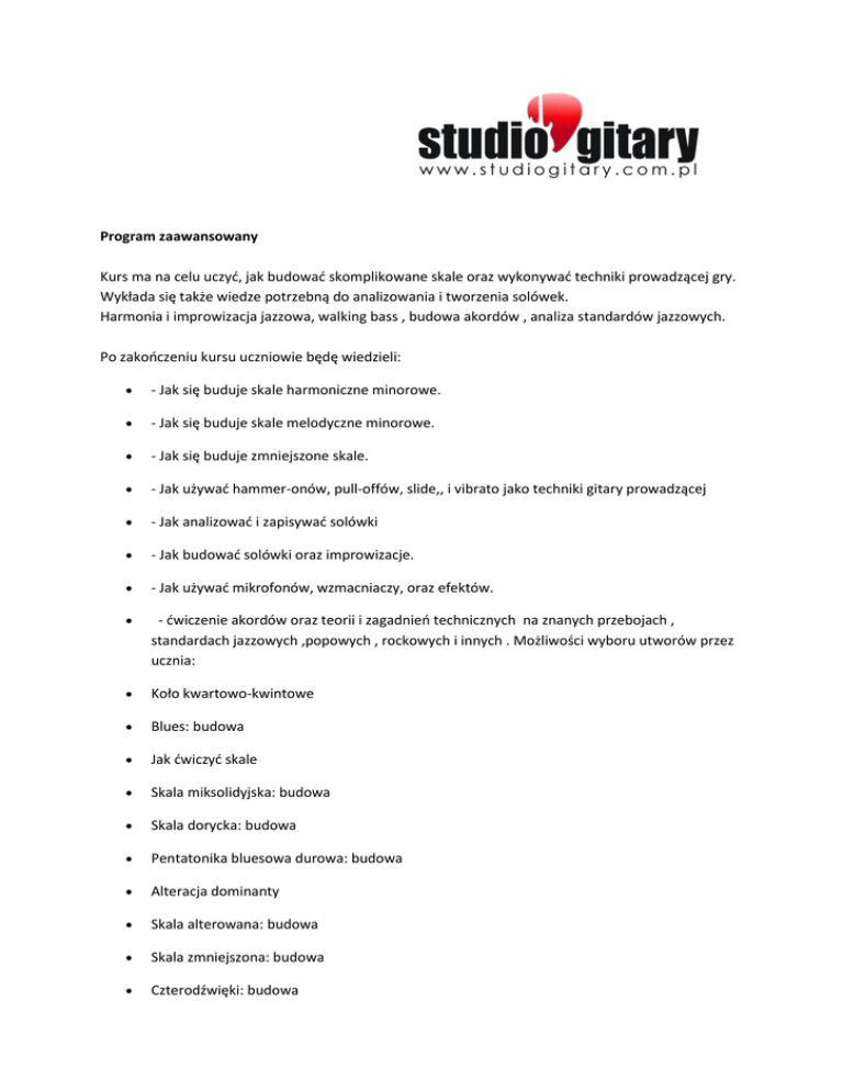 Program zaawansowany Kurs ma na celu uczyd, jak budowad skomplikowane skale oraz wykonywad techniki prowadzącej gry. Wykłada się także wiedze potrzebną do analizowania i tworzenia solówek. Harmonia i improwizacja jazzowa, walking bass , budowa akordów , analiza standardów jazzowych. Po zakooczeniu kursu uczniowie będę wiedzieli: - Jak się buduje skale harmoniczne minorowe. - Jak się buduje skale melodyczne minorowe. - Jak się buduje zmniejszone skale. - Jak używad hammer-onów, pull-offów, slide,, i vibrato jako techniki gitary prowadzącej - Jak analizowad i zapisywad solówki - Jak budowad solówki oraz improwizacje. - Jak używad mikrofonów, wzmacniaczy, oraz efektów. - dwiczenie akordów oraz teorii i zagadnieo technicznych na znanych przebojach , standardach jazzowych ,popowych , rockowych i innych . Możliwości wyboru utworów przez ucznia: Koło kwartowo-kwintowe Blues: budowa Jak dwiczyd skale Skala miksolidyjska: budowa Skala dorycka: budowa Pentatonika bluesowa durowa: budowa Alteracja dominanty Skala alterowana: budowa Skala zmniejszona: budowa Czterodźwięki: budowa Położenie czterodźwięków na stopniach skali Improwizacja w oparciu o dźwięki akordowe: zasady Kształcenie słuchu: dwiczenia Dominanta druga Substytut trytonowy Akord zmniejszony: budowa i zastosowanie Budowa akordu – system „drop 2” Budowa akordu – system „drop 3” Przewroty interwałów Wysokości nutowe Czytanie nut a vista
