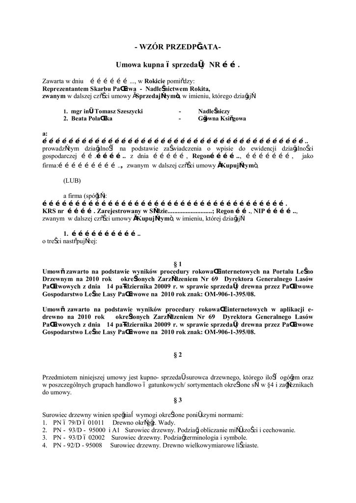 - WZÓR PRZEDPŁATAUmowa kupna – sprzedaży NR ……. Zawarta w dniu ………………..., w Rokicie pomiędzy: Reprezentantem Skarbu Państwa - Nadleśnictwem Rokita, zwanym w dalszej części umowy „Sprzedającym”, w imieniu, którego działają: 1. mgr inż. Tomasz Szeszycki 2. Beata Polańska - Nadleśniczy Główna Księgowa a: ………………………………………………………………………………………………………….. prowadzącym działalność na podstawie zaświadczenia o wpisie do ewidencji działalności gospodarczej …….………….. z dnia ……………, Regon………….., …………………, jako firma:……………………….., zwanym w dalszej części umowy „Kupującym”, (LUB) a firma (spółką): …………………………………………………………………………………………………. KRS nr …………. Zarejestrowany w Sądzie...........................; Regon ……., NIP ………….., zwanym w dalszej części umowy „Kupującym”, w imieniu, której działają: 1. ………………………….. o treści następującej: §1 Umowę zawarto na podstawie wyników procedury rokowań internetowych na Portalu Leśno Drzewnym na 2010 rok określonych Zarządzeniem Nr 69 Dyrektora Generalnego Lasów Państwowych z dnia 14 października 20009 r. w sprawie sprzedaży drewna przez Państwowe Gospodarstwo Leśne Lasy Państwowe na 2010 rok znak: OM-906-1-395/08. Umowę zawarto na podstawie wyników procedury rokowań internetowych w aplikacji edrewno na 2010 rok określonych Zarządzeniem Nr 69 Dyrektora Generalnego Lasów Państwowych z dnia 14 października 20009 r. w sprawie sprzedaży drewna przez Państwowe Gospodarstwo Leśne Lasy Państwowe na 2010 rok znak: OM-906-1-395/08. §2 Przedmiotem niniejszej umowy jest kupno- sprzedaż surowca drzewnego, którego ilość ogółem oraz w poszczególnych grupach handlowo – gatunkowych/ sortymentach określone są w §4 i załącznikach do umowy. §3 Surowiec drzewny winien spełniać wymogi określone poniższymi normami: 1. PN – 79/D – 01011 Drewno okrągłe. Wady. 2. PN - 93/D - 95000 i A1 Surowiec drzewny. Podział, obliczanie miąższości i cechowanie. 3. PN - 93/D – 02002 Surowiec drzewny. Podział terminologia i symbole. 4. PN - 92/D - 95008 Surowiec drzewny. Drewno wielkowymiarowe liściaste. 5. Warunki techniczne - Drewno wielkowymiarowe iglaste. Określone w załączniku nr 1 do zarządzenia nr 47 DGLP z dnia 31.05.2002 r. 6. PN-91/D-95018 Surowiec drzewny. Drewno średniowymiarowe. Wspólne wymagania i badania. 7. Ramowe warunki techniczne. Drewno średniowymiarowe opakowaniowe iglaste. Określone w załączniku nr 1 do zarządzenia nr 48 DGLP z dnia 31.05.2002r. 8. Na daną grupę handlowo – gatunkową w jednostce realizującej sprzedaż obowiązują jednolite normy/warunki techniczne. Żądanie przez Kupującego podwyższenia lub obniżenia jakości lub wymiarów w stosunku do norm/warunków technicznych określonych przez jednostkę na Portalu Leśno – drzewnym (drewno z wyborem) będzie skutkowało zmiana cen surowca drzewnego. Zmiana taka będzie następstwem negocjacji cenowej, przeprowadzonej pomiędzy „Sprzedającym”(jednostką realizującą sprzedaż) i „Kupującym”. W przypadku żądania przez „Kupującego” zmiany warunków technicznych/norm w trakcie realizowania umowy zmiana taka może wejść w życie po przeprowadzonych negocjacjach cenowych i spisania stosownego aneksu do umowy. W sytuacji obniżenia ceny w stosunku do ustalonej na Portalu Leśno- Drzewnym wymagana jest akceptacja Dyrektora RDLP. §4 1. „Sprzedający” sprzeda, a „Kupujący” zakupi w okresie od dnia ………..2010 r., do dnia ………. 2010 r., surowiec drzewny w łącznej wielkości…….m3. 2. Grupy handlowo – gatunkowe, ilości i ceny w sortymentach i klasach jakościowo – wymiarowych wymienione są w Załączniku nr 1 do niniejszej umowy. 3. Załącznik, o których mowa w pkt 1 dotyczą ilości surowca drzewnego zakupionych przetargu ograniczonym na Portalu Leśno - Drzewnym. w I 4. W drewnie wielkowymiarowym strony umowy uznają ze masą rozliczeniową jest suma mas wymienionych w załączniku przy poszczególnych klasach jakościowo wymiarowych danego gatunku w grupie handlowej wymienionej w załączniku (P L-D). Masy wymienione przy klasach jakościowo wymiarowych są jedynie wielkościami informacyjnymi i wynikają z szacunków brakarskich dla całej masy danego gatunku na wszystkich powierzchniach planu cięć danego Nadleśnictwa przewidzianych do pozyskania w 2010 roku. 5. ,W drewnie średniowymiarowym iglastym za zgodą „Kupującego” dopuszcza się sprzedaż, w ramach masy i na warunkach cenowych danej grupy handlowej, niewielkich ilości surowca w gatunkach innych niż wymienione w umowie. 6. W przypadku wystąpienia sytuacji wymienionych w punkcie 4 powykonawczo po I półroczu sporządzony zostanie stosowny aneks do umowy. 7. Sprzedaż będzie realizowana w oparciu o ustalony na piśmie harmonogram, stanowiący Załącznik nr 2 do niniejszej umowy. §5 1. Surowiec będzie wydawany zgodnie z harmonogramami ustalonymi przez strony umowy. 2. Zmiany do ustalonego harmonogramu wymagają formy pisemnej i są możliwe do wprowadzenia za zgodą stron. 3. Rozliczenie harmonogramów następuje w okresach kwartalnych. .( w okresach półrocznych dla Ol W0, Ol S2) 4. Strony dopuszczają możliwość odchylenia w realizacji sprzedaży lub zakupu w stosunku do wielkości ustalonych w harmonogramie w ilości ±5%. 5. W przypadku przekroczenia określonych w ust.4 odchyleń w realizacji sprzedaży lub zakupu w stosunku do ustalonych harmonogramem ilości „Sprzedający” lub „Kupujący” zapłaci karę umowną w wysokości 5% wartości nie odebranego lub nie przygotowanego do sprzedaży surowca drzewnego. Do wyliczenia wysokości kary przyjęta zostanie cena uzyskana przez „Sprzedającego” w trakcie re