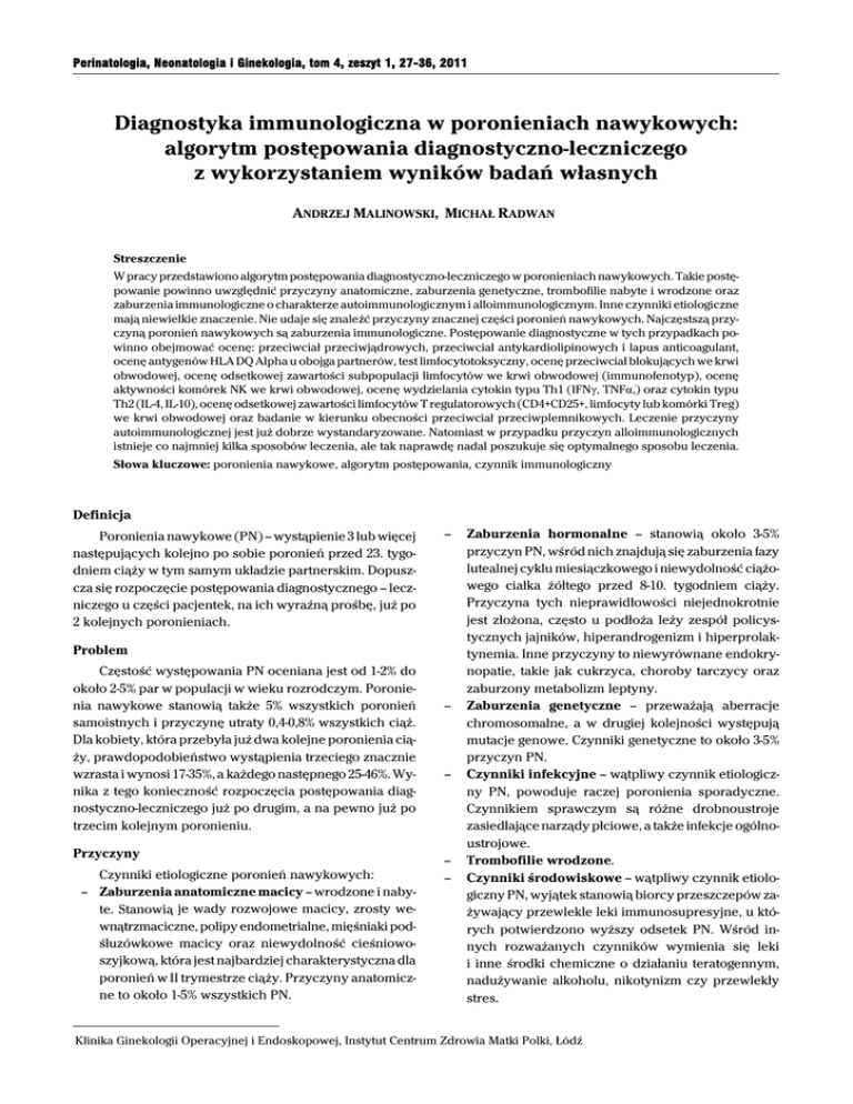 Perinatologia, Neonatologia i Ginekologia, tom 4, zeszyt 1, 27-36, 2011 Diagnostyka immunologiczna w poronieniach nawykowych: algorytm postępowania diagnostyczno-leczniczego z wykorzystaniem wyników badań własnych ANDRZEJ MALINOWSKI, MICHAŁ RADWAN Streszczenie W pracy przedstawiono algorytm postępowania diagnostyczno-leczniczego w poronieniach nawykowych. Takie postępowanie powinno uwzględnić przyczyny anatomiczne, zaburzenia genetyczne, trombofilie nabyte i wrodzone oraz zaburzenia immunologiczne o charakterze autoimmunologicznym i alloimmunologicznym. Inne czynniki etiologiczne mają niewielkie znaczenie. Nie udaje się znaleźć przyczyny znacznej części poronień nawykowych. Najczęstszą przyczyną poronień nawykowych są zaburzenia immunologiczne. Postępowanie diagnostyczne w tych przypadkach powinno obejmować ocenę: przeciwciał przeciwjądrowych, przeciwciał antykardiolipinowych i lapus anticoagulant, ocenę antygenów HLA DQ Alpha u obojga partnerów, test limfocytotoksyczny, ocenę przeciwciał blokujących we krwi obwodowej, ocenę odsetkowej zawartości subpopulacji limfocytów we krwi obwodowej (immunofenotyp), ocenę aktywności komórek NK we krwi obwodowej, ocenę wydzielania cytokin typu Th1 (IFNγ, TNFα,) oraz cytokin typu Th2 (IL-4, IL-10), ocenę odsetkowej zawartości limfocytów T regulatorowych (CD4+CD25+, limfocyty lub komórki Treg) we krwi obwodowej oraz badanie w kierunku obecności przeciwciał przeciwplemnikowych. Leczenie przyczyny autoimmunologicznej jest już dobrze wystandaryzowane. Natomiast w przypadku przyczyn alloimmunologicznych istnieje co najmniej kilka sposobów leczenia, ale tak naprawdę nadal poszukuje się optymalnego sposobu leczenia. Słowa kluczowe: poronienia nawykowe, algorytm postępowania, czynnik immunologiczny Definicja Poronienia nawykowe (PN) – wystąpienie 3 lub więcej następujących kolejno po sobie poronień przed 23. tygodniem ciąży w tym samym układzie partnerskim. Dopuszcza się rozpoczęcie postępowania diagnostycznego – leczniczego u części pacjentek, na ich wyraźną prośbę, już po 2 kolejnych poronieniach. – Problem Częstość występowania PN oceniana jest od 1-2% do około 2-5% par w populacji w wieku rozrodczym. Poronienia nawykowe stanowią także 5% wszystkich poronień samoistnych i przyczynę utraty 0,4-0,8% wszystkich ciąż. Dla kobiety, która przebyła już dwa kolejne poronienia ciąży, prawdopodobieństwo wystąpienia trzeciego znacznie wzrasta i wynosi 17-35%, a każdego następnego 25-46%. Wynika z tego konieczność rozpoczęcia postępowania diagnostyczno-leczniczego już po drugim, a na pewno już po trzecim kolejnym poronieniu. Przyczyny Czynniki etiologiczne poronień nawykowych: – Zaburzenia anatomiczne macicy – wrodzone i nabyte. Stanowią je wady rozwojowe macicy, zrosty wewnątrzmaciczne, polipy endometrialne, mięśniaki podśluzówkowe macicy oraz niewydolność cieśniowoszyjkową, która jest najbardziej charakterystyczna dla poronień w II trymestrze ciąży. Przyczyny anatomiczne to około 1-5% wszystkich PN. – – – – Zaburzenia hormonalne – stanowią około 3-5% przyczyn PN, wśród nich znajdują się zaburzenia fazy lutealnej cyklu miesiączkowego i niewydolność ciążowego ciałka żółtego przed 8-10. tygodniem ciąży. Przyczyna tych nieprawidłowości niejednokrotnie jest złożona, często u podłoża leży zespół policystycznych jajników, hiperandrogenizm i hiperprolaktynemia. Inne przyczyny to niewyrównane endokrynopatie, takie jak cukrzyca, choroby tarczycy oraz zaburzony metabolizm leptyny. Zaburzenia genetyczne – przeważają aberracje chromosomalne, a w drugiej kolejności występują mutacje genowe. Czynniki genetyczne to około 3-5% przyczyn PN. Czynniki infekcyjne – wątpliwy czynnik etiologiczny PN, powoduje raczej poronienia sporadyczne. Czynnikiem sprawczym są różne drobnoustroje zasiedlające narządy płciowe, a także infekcje ogólnoustrojowe. Trombofilie wrodzone. Czynniki środowiskowe – wątpliwy czynnik etiologiczny PN, wyjątek stanowią biorcy przeszczepów zażywający przewlekle leki immunosupresyjne, u których potwierdzono wyższy odsetek PN. Wśród innych rozważanych czynników wymienia się leki i inne środki chemiczne o działaniu teratogennym, nadużywanie alkoholu, nikotynizm czy przewlekły stres. Klinika Ginekologii Operacyjnej i Endoskopowej, Instytut Centrum Zdrowia Matki Polki, Łódź 28 A. Malinowski, M. Radwan – Czynniki immunologiczne – najczęstsza przyczyna PN. Przypuszcza się, że zaburzenia immunologiczne są odpowiedzialne za około 65-70% strat ciąż u kobiet z PN. W grupie tej występują czynniki o podłożu autoimmunologicznym i alloimmunologicznym. Diagnostyka Postępowanie diagnostyczne czynników anatomicznych, hormonalnych, genetycznych, infekcyjnych powinno być kompleksowe i zawierać badania w kierunku wykrycia bądź wykluczenia któregoś z tych czynników. Równolegle lub po wykluczeniu w/w przyczyn PN należy przeprowadzić diagnostykę w kierunku trombofilii wrodzonej oraz czynników immunologicznych. Diagnostyka zaburzeń anatomicznych Ocena jamy macicy powinna być przeprowadzona, nawet jeśli wcześniej wykluczona została wada macicy. Zwłaszcza dotyczy to kobiet, u których łyżeczkowano jamę macicy. Powstałe w następstwie łyżeczkowania zrosty wewnątrzmaciczne mogą być wtórną przyczyną kolejnej straty ciąży pomimo wykrycia i leczenia pierwotnej przyczyny PN. 1) Rozpoznanie nieprawidłowości budowy macicy opiera się na badaniu ginekologicznym, badaniach obrazowych, histeroskopii i laparoskopii. 2) Badanie ultrasonograficzne (USG) i histerosalpingografia (HSG) są podstawowymi badaniami obrazowymi w diagnostyce anatomicznych zaburzeń macicy. 3) W przypadku wątpliwego wyniku badań USG i HSG powinno się wykonać histeroskopię. 4) W wybranych przypadkach, gdy podejrzewana jest wada pod postacią macicy dwurożnej lub podwójnej obow