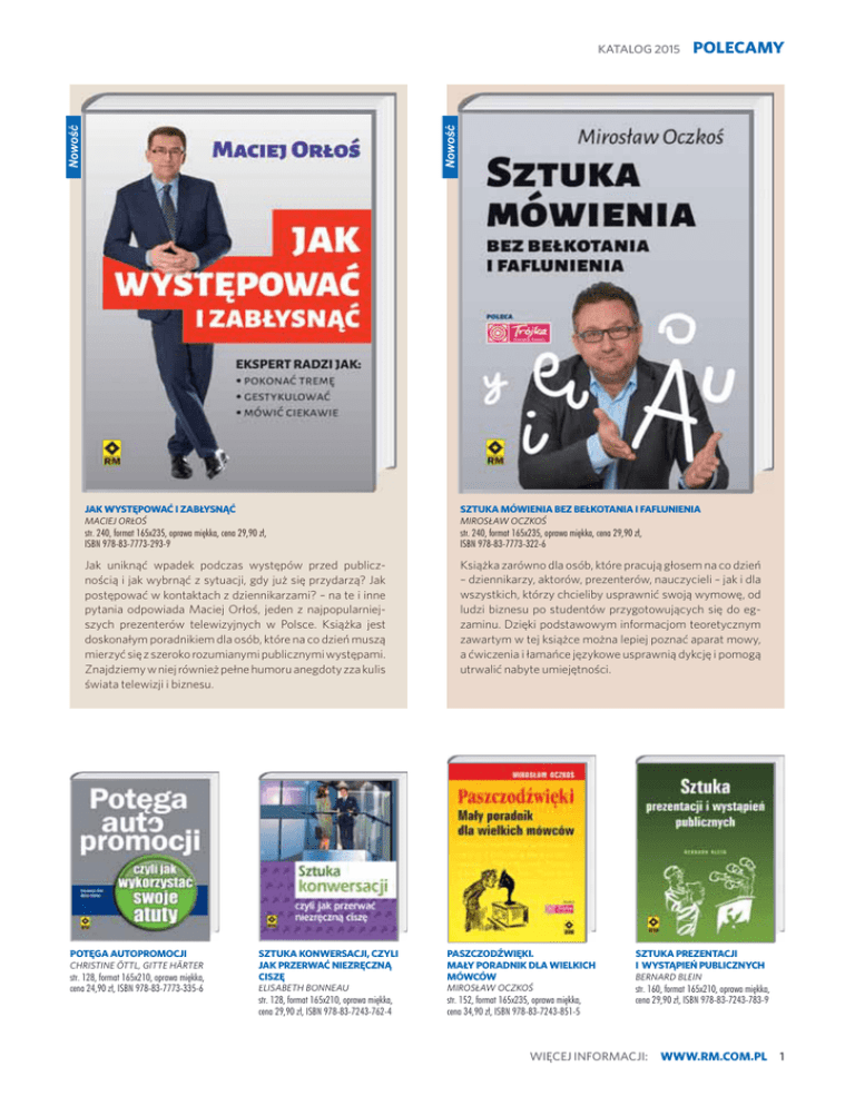 Nowość Nowość KATALOG 2015POLECAMY JAK WYSTĘPOWAĆ I ZABŁYSNĄĆ MACIEJ ORŁOŚ str. 240, format 165x235, oprawa miękka, cena 29,90 zł, ISBN 978-83-7773-293-9 SZTUKA MÓWIENIA BEZ BEŁKOTANIA I FAFLUNIENIA MIROSŁAW OCZKOŚ str. 240, format 165x235, oprawa miękka, cena 29,90 zł, ISBN 978-83-7773-322-6 Jak uniknąć wpadek podczas występów przed publicznością i jak wybrnąć z sytuacji, gdy już się przydarzą? Jak postępować w kontaktach z dziennikarzami? – na te i inne pytania odpowiada Maciej Orłoś, jeden z najpopularniejszych prezenterów telewizyjnych w Polsce. Książka jest doskonałym poradnikiem dla osób, które na co dzień muszą mierzyć się z szeroko rozumianymi publicznymi występami. Znajdziemy w niej również pełne humoru anegdoty zza kulis świata telewizji i biznesu. Książka zarówno dla osób, które pracują głosem na co dzień – dziennikarzy, aktorów, prezenterów, nauczycieli – jak i dla wszystkich, którzy chcieliby usprawnić swoją wymowę, od ludzi biznesu po studentów przygotowujących się do egzaminu. Dzięki podstawowym informacjom teoretycznym zawartym w tej książce można lepiej poznać aparat mowy, a ćwiczenia i łamańce językowe usprawnią dykcję i pomogą utrwalić nabyte umiejętności. POTĘGA AUTOPROMOCJI CHRISTINE ÖTTL, GITTE HÄRTER str. 128, format 165x210, oprawa miękka, cena 24,90 zł, ISBN 978-83-7773-335-6 SZTUKA KONWERSACJI, CZYLI JAK PRZERWAĆ NIEZRĘCZNĄ CISZĘ ELISABETH BONNEAU str. 128, format 165x210, oprawa miękka, cena 29,90 zł, ISBN 978-83-7243-762-4 PASZCZODŹWIĘKI. MAŁY PORADNIK DLA WIELKICH MÓWCÓW MIROSŁAW OCZKOŚ str. 152, format 165x235, oprawa miękka, cena 34,90 zł, ISBN 978-83-7243-851-5 SZTUKA PREZENTACJI I WYSTĄPIEŃ PUBLICZNYCH BERNARD BLEIN str. 160, format 165x210, oprawa miękka, cena 29,90 zł, ISBN 978-83-7243-783-9 WIĘCEJ INFORMACJI:WWW.RM.COM.PL 1 HISTORIAKATALOG 2015 Seria SEKRETY HISTORII Nowość Wkrótce W archiwach dotyczących drugiej wojny światowej i czasów powojennych wciąż można znaleźć informacje rzucające nowe światło na znane historie. Intrygi szpiegowskie, wojny wywiadów, pojedynki snajperów, tajemnice skrywane przez władze – to wszystko czytelnicy znajdą w książkach z tej serii. W ostatnich dniach wojny, w obawie przed aresztowaniem i przejęciem majątku przez aliantów, liczni oficerowie SS ruszali w stronę austriackich Alp... i znikali, razem z bogactwami, które udało im się zrabować podczas działań wojennych. Mimo intensywnych wysiłków i wielu akcji zachodnich służb, udało się odzyskać zaledwie cząstkę nazistowskiego złota. Co stało się z resztą bogactw? Autorzy książki podejmują własne śledztwo... SEKRETY HISTORII. HITLERJUGEND. DZIECI HITLERA MICHAEL H. KATER str. 320, format 158x213, oprawa miękka, cena 39,90 zł, ISBN 978-83-7773-098-0 2 Nowość SEKRETY HISTORII. SKARBY NAZISTÓW KENNETH A. ALFORD, THEODORE P. SAVAS str. ok. 360, format 158x213, oprawa miękka, ISBN 978-83-7773-266-3 SEKRETY HISTORII. DYWIZJON 303. WALKA I CODZIENNOŚĆ WYD. 2 RICHARD KING str. 432, format 158x213, oprawa miękka, cena 39,90 zł, ISBN 978-83-7773-324-0 SEKRETY HISTORII. U-BOOTY. PODWODNA ARMIA HITLERA PHILIP KAPLAN str. 272, format 158x213, oprawa miękka, cena 34,90 zł, ISBN 978-83-7773-298-4 Książka opisuje życie na pokładzie U-Bootów, odtworzone na podstawie listów, dzienników i wspomnień żołnierzy. Przedstawia obraz codziennej egzystencji załóg niemieckich okrętów podwodnych, a także dramatyczne wydarzenia, które były ich udziałem. Znajdziemy tu barwne, obrazowe opisy emocji, jakich doznawali marynarze z U-Bootów, począwszy od kapitana, a na mechaniku skończywszy. To pasjonujący i zarazem brutalnie realistyczny zbiorowy portret ludzi, którzy walczyli i ginęli w wodach Atlantyku w jednej z najważniejszych batalii drugiej wojny światowej. SEKRETY HISTORII. MAFIA NA WOJNIE. NIEZNANY SOJUSZNIK ALIANTÓW TIM NEWARK str. 344, format 158x213, oprawa miękka, cena 39,90 zł, ISBN 978-83-7773-290-8 Czy cel może uświęcać środki? Mafia, której działalność we Włoszech poważnie utrudniał Mussolini, z powodzeniem kontrolowała w tym czasie wiele sfer życia gospodarczego w Stanach Zjednoczonych. Podczas drugiej wojny światowej amerykańskie władze zdały sobie sprawę, iż bez wsparcia jej przywódców nie zapewnią bezpieczeństwa własnemu krajowi. Na mocy tajnego układu członkowie tej organizacji przestępczej własnymi metodami mieli zwalczać amerykańskich nazistów oraz agentów nasyłanych z Trzeciej Rzeszy. Książka odsłania kulisy współpracy aliantów z amerykańsko-sycylijską mafią podczas drugiej wojny światowej. SEKRETY HISTORII. SNAJPERZY DRUGIEJ WOJNY ŚWIATOWEJ PRACA ZBIOROWA str. 224, format 158x213, oprawa miękka, cena 34,90 zł, ISBN 978-83-7773-046-1 SEKRETY HISTORII. 1945. POLOWANIE NA NIEMIECKICH NAUKOWCÓW SEAN LONGDEN str. 390, format 158x213, oprawa miękka, cena 39,90 zł, ISBN 978-83-7773-099-7 WIĘCEJ INFORMACJI:WWW.RM.COM.PL KATALOG 2015HISTORIA SEKRETY HISTORII. PROCES NORYMBERSKI JOE J. HEYDECKER, JOHANNES LEEB str. ok. 550, format 158x213, oprawa miękka, ISBN 978-83-7773-336-3 SEKRETY HISTORII. INŻYNIEROWIE – TAJNA ARMIA HITLERA. WYD. 2 BLAINE TAYLOR str. 392, format 158x213, oprawa miękka, cena 39,90 zł, ISBN 978-83-7773-323-3 Wkrótce Wkrótce Wkrótce Mogłoby się wydawać, że pół wieku po głównym procesie hitlerowskich zbrodniarzy wojennych powinna być możliwa – zważywszy na dystans historyczny – lepsza ocena tamtego wydarzenia. Tak jednak nie jest. Fakty zasługują na to, by uwolnić je od propagandowej otoczki i pokusić się o pogłębienie ich we współczesnej świadomości. Taki jest sens i cel nowego wydania książki, która po raz pierwszy ukazała się w 1958 roku, gdy wciąż świeża była pamięć procesu. Przeszłości nie możemy zmienić, ale przyszłość owszem. Tego próbowano w Norymberdze. SEKRETY HI