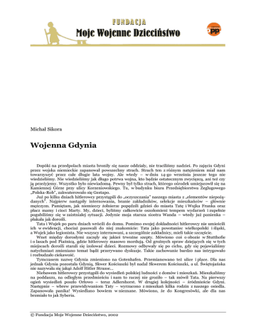 Michał Sikora Wojenna Gdynia Dopóki na przedpolach miasta broniły się nasze oddziały, nie traciliśmy nadziei. Po zajęciu Gdyni przez wojska niemieckie zapanował powszechny strach. Strach ten z różnym natężeniem miał nam towarzyszyć przez całe długie lata wojny. Ale wtedy – w dniu 14-go września jeszcze tego nie wiedzieliśmy. Nie wiedzieliśmy jak długo potrwa wojna, kto będzie ostatecznym zwycięzcą, ani też czy ją przeżyjemy. Wszystko było niewiadomą. Pewny był tylko strach, którego ośrodek umiejscowił się na Kamiennej Górze przy ulicy Korzeniowskiego. Tu, w budynku biura Przedsiębiorstwa Żeglugowego „Polska-Rob”, zakwaterowało się Gestapo. Już po kilku dniach hitlerowcy przystąpili do „oczyszczania” naszego miasta z „elementów niepożądanych”. Najpierw nastąpiły internowania, branie zakładników, selekcje mieszkańców – głównie mężczyzn. Pamiętam, jak niemieccy żołnierze popędzili gdzieś do miasta Tatę i Wujka Franka oraz płacz mamy i cioci Marty. My, dzieci, byliśmy całkowicie oszołomieni tempem wydarzeń i zupełnie pogubiliśmy się w zaistniałej sytuacji. Jedynie moja starsza siostra Wanda – wtedy już panienka – płakała jak dorośli. Tata i Wujek po paru dniach wrócili do domu. Pomimo swojej dokładności hitlerowcy nie umieścili ich w ewidencji, chociaż pasowali do niej znakomicie: Tata jako powstaniec wielkopolski i śląski, a Wujek jako legionista. Nie wszyscy internowani, a szczególnie zakładnicy, mieli takie szczęście. Wnet między dorosłymi zaczęły się jakieś trwożne szepty. Mówiono coś o obozie w Stutthofie i o lasach pod Piaśnicą, gdzie hitlerowcy masowo mordują. Od groźnych spraw dziejących się w tych miejscach dorośli starali się izolować dzieci. Rozmowy odbywały się po cichu, gdy się pojawialiśmy natychmiast zmieniano temat bądź przerywano dyskusje. Takie zachowanie bardzo nas intrygowało i rozbudzało ciekawość. Tymczasem nazwę Gdynia zmieniono na Gotenhafen. Przemianowano też ulice i place. Dla nas jednak Gdynia pozostała Gdynią, Skwer Kościuszki był nadal Skwerem Kościuszki, a ul. Świętojańska nie nazywała się jakąś Adolf Hitler Strasse... Niebawem hitlerowcy przystąpili do wysiedleń polskiej ludności z domów i mieszkań. Mieszkaliśmy na poddaszu, na odległym przedmieściu i nam to raczej nie groziło – tak mówił Tata. Na pierwszy ogień wysiedleń poszło Orłowo – teraz Adlershorst. W drugiej kolejności – śródmieście Gdyni. Następnie – wbrew przewidywaniom Taty – wyrzucono z mieszkań kilka rodzin z naszego osiedla. Zapanowała panika! Wysiedlano bowiem w nieznane. Mówiono, że do Kongresówki, ale dla nas brzmiało to jak Syberia. © Fundacja Moje Wojenne Dzieciństwo, 2002 Micha Sikora, Wojenna Gdynia 2 Pewnej nocy opuścili swój dom nasi sąsiedzi. Wyrzucono ich „przez płot” – jak mówiła mama. Sąsiad był mechanikiem okrętowym i wybudował zgrabny, chociaż nieduży domek. Teraz zajął go niemiecki Feldfebel nazwiskiem Schulz. Później okazało się, że był całkiem porządnym Niemcem i nikogo się nie czepiał. Z pobliskiego gospodarstwa rolnego – bo takie jeszcze w tym czasie istniały na przedmieściu Gdyni – usunięto całą kaszubską rodzinę, mieszkającą tu od wieków. Jej miejsce zajął Niemiec – Treuhandler. Mama mówiła, że to taki hitlerowski powiernik. Dlaczego wybrano właśnie to gospodarstwo na wysiedlenie – pozostało dla nas tajemnicą. W okolicy były przecież ładniejsze i bogatsze majątki. A może dlatego, że położone było nad potokiem, a nowy „pan” pragnął hodować kaczki i gęsi, które jak wiadomo lubią wodę...? Nigdy nie było wiadomo, co Niemcom może „strzelić do głowy”. Na wszelki wypadek, niejako na zapas, baliśmy się tego wysiedlenia. Wieczorem, gdy Tata wracał z pracy, odbywały się szeptane, rodzinno-sąsiedzkie narady. Dzielono się nowymi wiadomościami. Padały nazwiska kolejnych znajomych, których zmuszono do wyjazdu. Niektórym rodzinom dawano na spakowanie niezbędnych rzeczy tylko kilkanaście minut, przy czym nie wolno było zabierać żadnych mebli, a bagaż musiał mieć odpowiednio małą wagę. Nadeszła pierwsza wojenna zima – straszna, głodna i bardzo mroźna! W tym czasie często chorowałem. Mama mówiła, że jestem zbyt wrażliwy i nerwowy. Chyba to była prawda. Obawiałem się wysiedlenia, głodu, że zabraknie nam opału, o Tatę – że go Niemcy wykończą. Chorując często przebywałem w łóżku, kryłem się więc pod pierzyną przed wszystkimi tymi strachami i niepokojami. Nie na wiele się to zdało, bo wpełzały wraz ze mną pod pierzynę i nie było sposobu, aby się ich pozbyć. Najbardziej ze wszystkiego bałem się Gestapo. Była to dla mnie tajemnicza, przeraźliwa i niezrozumiała nazwa – gorsza od diabła i śmierci. Najdziwniejszy w tym wszystkim był fakt, że jak dotąd nie widziałem żadnego gestapowca. Spotykałem tylko (mówię o pierwszych miesiącach wojny i okupacji) niemieckich żołnierzy, czyli Wehrmacht, marynarzy – tych w Gdyni było najwięcej, policjantów w śmiesznych hełmach (nazywali się szupo i mieścili się niedaleko Cioci na ul. Portowej). Widywałem też SS-manów w czarnych i SAmanów w brunatnych mundurach. Ze swoich strachów i wątpliwości zwierzałem się Tacie. Ten uspokoił mnie nieco, a przede wszystkim wyjaśnił tę dziwną nazwę „Gestapo”. Słowo to oznacza policjanta tajnego – czyli „gecheim” – tłumaczył mi. Gestapo jest dlatego takie dla Polaków niebezpieczne, bo jest tajne – działa w ukryciu. Nigdy nie wiadomo, gdzie się taki tajniak kryje, kogo podgląda i podsłuchuje. Po tym wyjaśnieniu zacząłem rozumieć, dlaczego dorośli tak często mówią szeptem. Widocznie boją się podsłuchu! Ale od tego też czasu strach bardziej rozbudzał moją wyobraźnię. Widziałem gestapowca za każdym drzewem, krzakami, płotem, a n