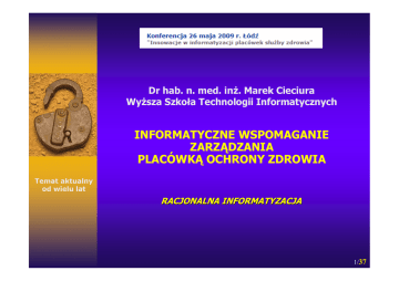 Dr hab. n. med. inŜ. Marek Cieciura WyŜsza Szkoła Technologii Informatycznych INFORMATYCZNE WSPOMAGANIE ZARZĄDZANIA PLACÓWKĄ OCHRONY ZDROWIA Temat aktualny od wielu lat RACJONALNA INFORMATYZACJA 1/37 Układ wystąpienia 1. Podstawowa terminologia 2. Informatyzacja placówek słuŜby zdrowia 3. Skuteczna informatyzacja 4. Informatyczne wspomaganie zarządzania 5. Podsumowanie 2/37 SłuŜba zdrowia – mercedes nie dla kaŜdego, Rzeczpospolita, 23 grudnia 2008 r. PODSTAWOWA TERMINOLOGIA 3/37 Komputeryzacja i informatyzacja KOMPUTERYZACJA Zainstalowanie komputerów i opracowanie komputerowych metod przetwarzania informacji INFORMATYZACJA WdroŜenie i wykorzystywanie komputerowych metod przetwarzania informacji Aspekt narzędziowy Aspekt wynikowy Pojęcia te stosowane są takŜe zamiennie • Informatyzacja polega na racjonalnym wykorzystaniu uprzednio wprowadzonych juŜ danych do systemów informatycznych. • Warunkiem efektywnego wdroŜenia takich rozwiązań jest stosowanie sprawdzonych metodyk i traktowanie informatyzacji w kategoriach złoŜonego przedsięwzięcia, tzn. dysponującego opracowanym budŜetem, harmonogramem oraz strukturami realizacyjnymi. 4/37 Podstawowe rodzaje systemów ♦ System informacyjny – wielopoziomowa struktura pozwalająca na zbieranie i przechowywanie informacji oraz ich przetwarzanie i udostępnianie. ♦ System informatyczny - część systemu informacyjnego, która realizuje przetwarzanie informacji z wykorzystaniem komputerów. System informatyczny System informacyjny 5/37 Zarządzanie ♦ Zarządzanie - ogół działań zmierzających do efektywnego wykorzystania zespołów ludzkich i środków materialnych, podejmowanych w celu osiągnięcia wcześniej sformułowanych celów. ♦ Funkcje zarządzania: planowanie, organizowanie, przekazywanie poleceń /zarządzanie realizacją, koordynacja, kontrolowanie. ♦ Obszary zarządzania: personelem (zasobami ludzkimi), wyposaŜeniem, marketingiem (zarządzanie marketingowe). ♦ Horyzont czasowy i rodzaje decyzji: operacyjne (bieŜące), strategiczne. Sztuka rządzenia polega na umiejętności przystosowania się do warunków – Jarosław Iwaszkiewicz 6/37 INFORMATYZACJA PLACÓWEK SŁUśBY ZDROWIA 7/37 Podstawowe cele informatyzacji szpitala • Wspomaganie planowania i organizacji • Wspomaganie codziennego funkcjonowania • Wspomaganie zarządzania • Wspomaganie procesu naukowego i dydaktycznego Cel bez planu działania jest tylko poboŜnym Ŝyczeniem – Antoine de Saint-Exupery 8/37 Konieczność zredukowania pracy administracyjnej Czas pracy pielęgniarek 11% 26% 18% Dokumentowanie Obsługa pacjentów Komunikowanie Inne czynności Administrowanie 20% 25% Lekarze – około 50% czasu na czynności administracyjne i dokumentowanie Zmniejszanie pracy administracyjnej poprzez automatyzację: • Generowanie zawartości dokumentów medycznych na podstawie wcześniej wprowadzonych danych. • Automatyzacja wyznaczania terminów badań diagnostycznych. • Samodzielne zapisywanie się pacjentów na wizyty w przychodni. • … 9/37 Konsolidacja danych finansowych z danymi medycznymi PODSYSTEM MEDYCZNY Dane ilościowe dotyczące wykonań poszczególnych procedur, zuŜytych materiałów, leków PODSYSTEM KSIĘGOWOKOSZTOWY Koszt osobodnia, koszty procedur, koszty leków i materiałów. Medyczna Karta Pacjenta 10/37 Analizy Raporty Struktura zminimalizowanego systemu szpitalnego OPROGRAMOWANIE DO ZBIERANIA INFORMACJI KOSZTOWYCH I SPRAWOZDAWCZYCH PODSYSTEM ADMINISTRACYJNY 11/37 MODUŁY: SPRAWOZDAWCZY I ZARZĄDCZY Moduł sprawozdawczy • Rozliczenie hospitalizacji z wykonanych usług - produktów medycznych, zgodnie z wprowadzonymi danymi o zawartych kontraktach z NFZ i kontraktowych katalogach produktów medycznych. • Generowanie sprawozdań do NFZ i PZH w postaci elektronicznej. Moduł zarządczy • Wspomaga zarządzanie szpitalem poprzez generowanie standardowych zestawień i raportów na potrzeby zarządzania. • MoŜliwość uzyskiwania dowolnych raportów z wprowadzonych danych. • Funkcjonalność modułu obejmuje wczesne ostrzeganie w zakresie finansowym, kadrowym, sprzętowym itp. SKUTECZNA INFORMATYZACJA 12/37 Wolnoamerykanka w informatyzacji Nieznajomość istoty informatyzacji jest rajem dla firm dostarczających oprogramowanie. Dyrektorzy boją się komputerów, a firmy informatyczne potrafią sprzedać szpitalowi kaŜdy, nawet najmniej przydatny, czy najbardziej bezuŜyteczny program – październik 2005r. Erwin Strzesak, Wolnoamerykanka, http://termedia.pl/showpdf.php?article_id=3783&filename=Wolnoamerykanka.pdf&priority=1 13/37 Zamiar informatyzacji 1. Z jakiego powodu (po co?) chcecie Państwo uruchomić ten projekt? 2. Jaki problem chcecie Państwo rozwiązać? 3. Co Państwu dokucza? 14/37 Zamiar informatyzacji 1. Czy potrzebny jest nowy system, z czego wynika taka potrzeba, jakie mają być jego zadania oraz czy nie wystarczy tylko zmodernizowanie starego systemu? 2. Czy są opracowane niesprzeczne i wyczerpujące przepisy, na podstawie których ma funkcjonować nowy system? 3. Jaka ma być struktura systemu i jaka moŜe być zastosowana technologia przetwarzania? 4. Czy jest zapewniona wymagana infrastruktura teleinformatyczna, czy teŜ naleŜy dokonać jej modernizacji i rozbudowy? 5. Jaki jest wymagany czas opracowania i wdroŜenia systemu oraz czy jest on realny? 6. Czy moŜliwe jest opracowanie systemu własnymi siłami, czy teŜ naleŜy powierzyć jego wykonanie wykonawcom zewnętrznym? 7. Jaki jest koszt realizacji przedsięwzięcia i czy są w dyspozycji takie środki finansowe, czy teŜ sposoby ich uzyskania? 15/37 Podstawowe przesłanki inwestowania w technologie informatyczne ♦ Usprawnienie procesów podejmowania decyzji (szybkość, dokładność, uwzględnienie wielu czynników) ♦ Sprostanie rosnącym oczekiwaniom klientów ♦ Lepsza koordynacja pracy grup pracowniczych ♦ MoŜliwość sprostania wymogom sprawozdawczości ♦ Lepsza kontrola wydatków oraz per