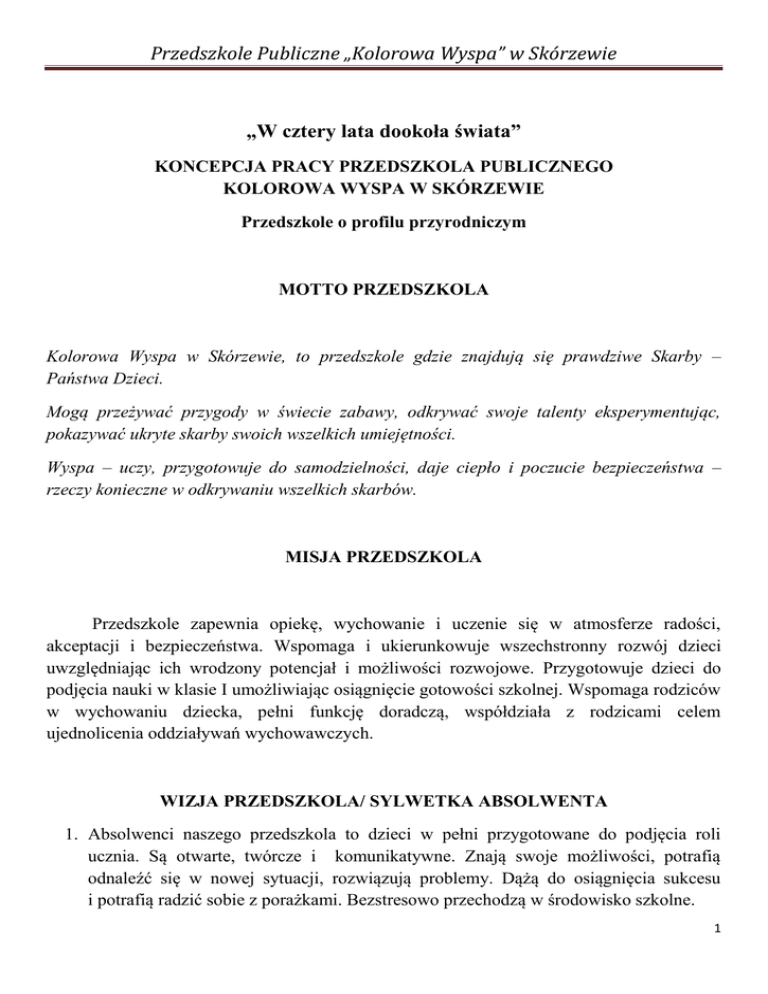 Przedszkole Publiczne „Kolorowa Wyspa” w Skórzewie „W cztery lata dookoła świata” KONCEPCJA PRACY PRZEDSZKOLA PUBLICZNEGO KOLOROWA WYSPA W SKÓRZEWIE Przedszkole o profilu przyrodniczym MOTTO PRZEDSZKOLA Kolorowa Wyspa w Skórzewie, to przedszkole gdzie znajdują się prawdziwe Skarby – Państwa Dzieci. Mogą przeżywać przygody w świecie zabawy, odkrywać swoje talenty eksperymentując, pokazywać ukryte skarby swoich wszelkich umiejętności. Wyspa – uczy, przygotowuje do samodzielności, daje ciepło i poczucie bezpieczeństwa – rzeczy konieczne w odkrywaniu wszelkich skarbów. MISJA PRZEDSZKOLA Przedszkole zapewnia opiekę, wychowanie i uczenie się w atmosferze radości, akceptacji i bezpieczeństwa. Wspomaga i ukierunkowuje wszechstronny rozwój dzieci uwzględniając ich wrodzony potencjał i możliwości rozwojowe. Przygotowuje dzieci do podjęcia nauki w klasie I umożliwiając osiągnięcie gotowości szkolnej. Wspomaga rodziców w wychowaniu dziecka, pełni funkcję doradczą, współdziała z rodzicami celem ujednolicenia oddziaływań wychowawczych. WIZJA PRZEDSZKOLA/ SYLWETKA ABSOLWENTA 1. Absolwenci naszego przedszkola to dzieci w pełni przygotowane do podjęcia roli ucznia. Są otwarte, twórcze i komunikatywne. Znają swoje możliwości, potrafią odnaleźć się w nowej sytuacji, rozwiązują problemy. Dążą do osiągnięcia sukcesu i potrafią radzić sobie z porażkami. Bezstresowo przechodzą w środowisko szkolne. 1 Przedszkole Publiczne „Kolorowa Wyspa” w Skórzewie 2. Przedszkole pracuje w oparciu o wybrany i przyjęty do realizacji program wychowania przedszkolnego oraz własne programy adaptacji dzieci do środowiska przedszkolnego i szkolnego, dotyczące treści w zakresie bezpieczeństwa, ekologii, edukacji regionalnej, patriotycznej i europejskiej, a także programy profilaktyki zdrowotnej. 3. W przedszkolu zapewnia się dziecku atrakcyjny, twórczy i aktywny sposób osiągania sukcesów rozwojowych. Stosowane metody i formy pracy są nowoczesne, a nauczyciele dobrze przygotowani merytorycznie i metodycznie. Poszukują innowacyjnych rozwiązań , doskonalą swoje kwalifikacje i kompetencje zgodnie z celami założonymi do realizacji. 4. Przedszkole rozwija osobowość dzieci w oparciu o uznany system wartości. Funkcjonuje tu program wychowawczy akceptowany przez rodziców. Przestrzega się praw dziecka. 5. Wychowankowie przedszkola uczą się zachowań przyjaznych przyrodzie. Poznają przyrodę, uczą się ją rozumieć, kochać i szanować, a także korzystać z jej zasobów dla własnego zdrowia i zaspokojenia potrzeb. 6. W przedszkolu kształci się tożsamość narodową i regionalną wychowanków oraz przybliża się kultury europejskie. 7. Dzieci stają się świadomymi odbiorcami i twórcami sztuki. Przedszkole rozwija wrażliwość estetyczną, wyobraźnię, ekspresję plastyczną, muzyczną, ruchową. 8. Placówka posiada zorganizowany system udzielania dzieciom pomocy psychologiczno-pedagogicznej. 9. Przedszkole ściśle współpracuje z rodzicami, uwzględnia ich potrzeby i oczekiwania, dąży do ujednolicenia oddziaływań wychowawczych. Rodzice angażują się w prace na rzecz przedszkola, współdziałają z nauczycielami i specjalistami w celu zapewnienia dzieciom optymalnych warunków dla osiągania postępów. 10. Baza i wyposażenie przedszkola podlega ciągłej modernizacji gwarantując właściwą realizację zadań placówki. 11.Placówka promuje swoje osiągnięcia i cieszy się dobrą opinią w środowiska. KIERUNKI DZIAŁANIA Cele ogólne: 1. Stwarzanie warunków i podejmowanie działań w celu coraz lepszego przygotowania dzieci do dalszego etapu kształcenia. 2. Zapobieganie agresji oraz planowe kształtowanie norm moralnych. 3. Kształtowanie tożsamości narodowej przy jednoczesnym otwarciu się na inne kultury. 2 Przedszkole Publiczne „Kolorowa Wyspa” w Skórzewie 4. Dbanie o zdrowie, prawidłowy rozwój fizyczny, społeczny i emocjonalny wychowanków, 5. Kształcenie postaw i zachowań przyjaznych przyrodzie. 6. Stworzenie w placówce systemu kompleksowej pomocy psychologicznopedagogicznej. 7. Kształtowanie u dzieci umiejętności odbioru i tworzenia sztuki. 8. Włączenie do działań edukacyjnych placówki metod aktywizujących i terapeutycznych. 9. Dostosowanie bazy i wyposażenia przedszkola do właściwej realizacji zadań przedszkola. 10.Wzmocnienie odrębności placówki poprzez stworzenie i kultywowanie własnych tradycji oraz dynamiczne zmiany jakościowe. 11.Wzmocnienie współpracy z rodzicami i środowiskiem lokalnym w celu zapewnienia dzieciom optymalnych warunków do indywidualnego, wszechstronnego rozwoju. ZADANIA SKUPIAJĄCE SIĘ WOKÓŁ PROFILU PRZYRODNICZEGO I Dom i okolica Dla naszego przedszkola dom, rodzina i najbliższe środowisko stanowią priorytety. Przez cztery lata kolorowej podróży zawsze będziemy wracać do domu, jego tradycji i wartości. W tym celu zbudowaliśmy prawdziwy domek dla przedszkolaków, do którego można wejść, posprzątać, ugotować, usiąść i porozmawiać, odpocząć. Do domu zapraszamy naszych bliskich i znajomych, wspólnie biesiadujemy, omawiamy historię i tradycje. Przez cały rok przygotowujemy uroczystości i festyny integrujące całe rodziny. W domu rozpoczynamy każdą życiową podróż, w domu czujemy się bezpiecznie, uczymy się relacji z innymi. Dom uczy nas odpowiedzialności, szacunku, dbania o potrzeby innych: naszych dziadków, rodziców, przyjaciół, zwierząt… Biorąc udział w akcjach charytatywnych uwrażliwiamy się na potrzeby innych. Wyznaczając reguły i zasady postępowania ustalamy i przestrzegamy kodeksu grupowego. W ten sposób uczymy się zachowań społecznych. Wychodząc z domu poznajemy najbliższą okolicę, otaczającą nas przyrodę; uczymy się i przestrzegamy zasad bezpieczeństwa i poruszania na drogach – do tego celu służą: - własnoręcznie przygotowana makieta drogi ze znakami drogowymi, - za