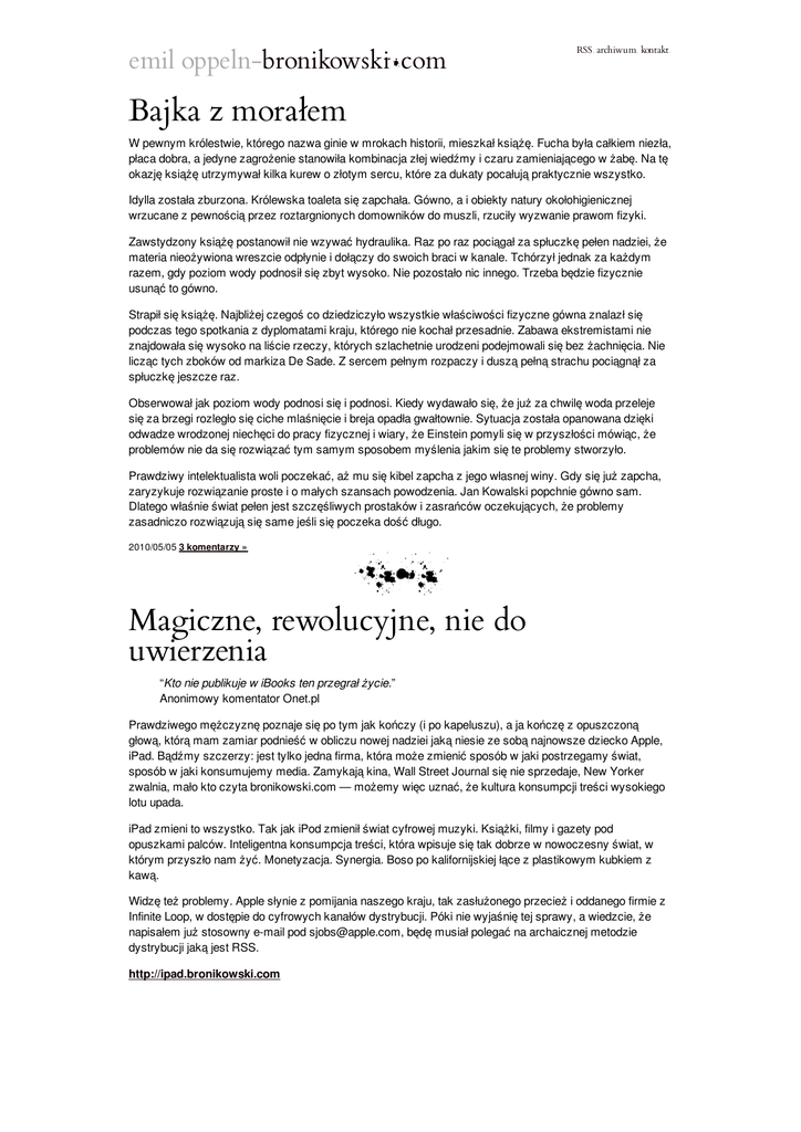 emil oppeln-bronikowski.com RSS, archiwum, kontakt. Bajka z morałem W pewnym królestwie, którego nazwa ginie w mrokach historii, mieszkał książę. Fucha była całkiem niezła, płaca dobra, a jedyne zagrożenie stanowiła kombinacja złej wiedźmy i czaru zamieniającego w żabę. Na tę okazję książę utrzymywał kilka kurew o złotym sercu, które za dukaty pocałują praktycznie wszystko. Idylla została zburzona. Królewska toaleta się zapchała. Gówno, a i obiekty natury okołohigienicznej wrzucane z pewnością przez roztargnionych domowników do muszli, rzuciły wyzwanie prawom fizyki. Zawstydzony książę postanowił nie wzywać hydraulika. Raz po raz pociągał za spłuczkę pełen nadziei, że materia nieożywiona wreszcie odpłynie i dołączy do swoich braci w kanale. Tchórzył jednak za każdym razem, gdy poziom wody podnosił się zbyt wysoko. Nie pozostało nic innego. Trzeba będzie fizycznie usunąć to gówno. Strapił się książę. Najbliżej czegoś co dziedziczyło wszystkie właściwości fizyczne gówna znalazł się podczas tego spotkania z dyplomatami kraju, którego nie kochał przesadnie. Zabawa ekstremistami nie znajdowała się wysoko na liście rzeczy, których szlachetnie urodzeni podejmowali się bez żachnięcia. Nie licząc tych zboków od markiza De Sade. Z sercem pełnym rozpaczy i duszą pełną strachu pociągnął za spłuczkę jeszcze raz. Obserwował jak poziom wody podnosi się i podnosi. Kiedy wydawało się, że już za chwilę woda przeleje się za brzegi rozległo się ciche mlaśnięcie i breja opadła gwałtownie. Sytuacja została opanowana dzięki odwadze wrodzonej niechęci do pracy fizycznej i wiary, że Einstein pomyli się w przyszłości mówiąc, że problemów nie da się rozwiązać tym samym sposobem myślenia jakim się te problemy stworzyło. Prawdziwy intelektualista woli poczekać, aż mu się kibel zapcha z jego własnej winy. Gdy się już zapcha, zaryzykuje rozwiązanie proste i o małych szansach powodzenia. Jan Kowalski popchnie gówno sam. Dlatego właśnie świat pełen jest szczęśliwych prostaków i zasrańców oczekujących, że problemy zasadniczo rozwiązują się same jeśli się poczeka dość długo. 2010/05/05 3 komentarzy » 1979 Magiczne, rewolucyjne, nie do uwierzenia “Kto nie publikuje w iBooks ten przegrał życie.” Anonimowy komentator Onet.pl Prawdziwego mężczyznę poznaje się po tym jak kończy (i po kapeluszu), a ja kończę z opuszczoną głową, którą mam zamiar podnieść w obliczu nowej nadziei jaką niesie ze sobą najnowsze dziecko Apple, iPad. Bądźmy szczerzy: jest tylko jedna firma, która może zmienić sposób w jaki postrzegamy świat, sposób w jaki konsumujemy media. Zamykają kina, Wall Street Journal się nie sprzedaje, New Yorker zwalnia, mało kto czyta bronikowski.com — możemy więc uznać, że kultura konsumpcji treści wysokiego lotu upada. iPad zmieni to wszystko. Tak jak iPod zmienił świat cyfrowej muzyki. Książki, filmy i gazety pod opuszkami palców. Inteligentna konsumpcja treści, która wpisuje się tak dobrze w nowoczesny świat, w którym przyszło nam żyć. Monetyzacja. Synergia. Boso po kalifornijskiej łące z plastikowym kubkiem z kawą. Widzę też problemy. Apple słynie z pomijania naszego kraju, tak zasłużonego przecież i oddanego firmie z Infinite Loop, w dostępie do cyfrowych kanałów dystrybucji. Póki nie wyjaśnię tej sprawy, a wiedzcie, że napisałem już stosowny e-mail pod [email protected], będę musiał polegać na archaicznej metodzie dystrybucji jaką jest RSS. http://ipad.bronikowski.com W przyszłości mam zamiar przenieść całego bloga do iTunes Store, jedna notka za dziewięćdziesiąt dziewięć eurocentów. Myślę, że cena jest fair. Zwykły tekst kosztuje mnie 2*Guinness i paczkę fajek. 2010/04/01 4 komentarzy » 1979 Wyłącznik zmierzchowy Stałem na przystanku i właśnie wtedy bóg zamrugał do mnie oczami miasta. Na rozkaz niesłyszalnego głosu uliczne lampy otworzyły swoje brudne klosze z sodowymi źrenicami. Stałem tak, zdziwiony jak dziecko, podziwiając ten akt tworzenia. I stała się jasność. Krwiobiegiem ulic popłynęły tramwaje. Wczorajsze kałuże zatrzymały się na chwilę zdjęte chłodem. Zimowe ulice strząsnęły z siebie ostatnich spacerowiczów. Oparty o wiatę przystanku podziwiałem swój oddech w powietrzu i dumałem nad smutnym faktem: coraz rzadziej rozważam, co by było gdyby. Gdybanie jest świetną rozrywką dla osoby, której zestaw problemów ogranicza się do następnej butelki wina, następnego blanta i wahań na rynku zupek gotowych do spożycia po zalaniu wrzątkiem. Ostatnio problemy ścięły włosy, założyły garnitury i wydoroślały. Siedzą gdzieś na brunchu debatując o najnowszych trendach we wnoszeniu opłat za farmę serwerów i paradygmatach w konsumpcji kredytów odnawialnych. Co by było, gdyby wyłączyli oświetlenie w mieście? Zapytałem kiedyś o to w parku Zdrowie, nocą, patrząc w utopione świetlnym smogiem niebo. Wszyscy zgodzili się, że byłoby całkiem super. Sekundy później horyzont zgasł. Gdzieś w elektrowni musiał wyskoczyć bardzo duży bezpiecznik. Przyduszony narkotycznym dymem wysapałem z siebie monosylabę zdziwienia i ekscytacji. Na niebo wciągnięto planszę “przepraszamy za usterki”, razem z białymi kropkami gwiazd. Co by było, gdyby wyłączyli oświetlenie w mieście? Pewnie by nam obrobili biuro. Dlatego nie zadaję sobie już tych pytań, rzeczywistość jest męcząca. Gdyby baba miała wąsy, to z pewnością stałaby się rzecznikiem jakiejś firmy oferującej laserowy zabieg usuwania nadmiernego owłosienia, razem z kampanią wirusową i fanpage. 2010/03/18 Jeden komentarz » 1979 Bohdan Bohdan sypiał w krzakach jałowca. Nie od początku do końca swojego życia, ale przez kilka dni, które spędziliśmy nad wodą. Bohdan miał sweter, skołtunioną brodę, potargane włosy i oddech pijaka. T