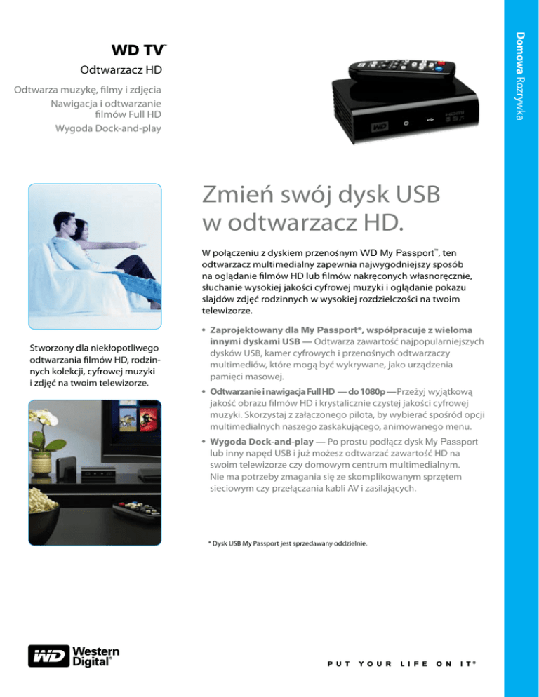 Domowa Rozrywka WD TV ™ Odtwarzacz HD Odtwarza muzykę, filmy i zdjęcia Nawigacja i odtwarzanie filmów Full HD Wygoda Dock-and-play Zmień swój dysk USB w odtwarzacz HD. W połączeniu z dyskiem przenośnym WD My Passport™, ten odtwarzacz multimedialny zapewnia najwygodniejszy sposób na oglądanie filmów HD lub filmów nakręconych własnoręcznie, słuchanie wysokiej jakości cyfrowej muzyki i oglądanie pokazu slajdów zdjęć rodzinnych w wysokiej rozdzielczości na twoim telewizorze. Stworzony dla niekłopotliwego odtwarzania filmów HD, rodzinnych kolekcji, cyfrowej muzyki i zdjęć na twoim telewizorze. • Zaprojektowany dla My Passport*, współpracuje z wieloma innymi dyskami USB — Odtwarza zawartość najpopularniejszych dysków USB, kamer cyfrowych i przenośnych odtwarzaczy multimediów, które mogą być wykrywane, jako urządzenia pamięci masowej. • Odtwarzanie i nawigacja Full HD — do 1080p —Przeżyj wyjątkową jakość obrazu filmów HD i krystalicznie czystej jakości cyfrowej muzyki. Skorzystaj z załączonego pilota, by wybierać spośród opcji multimedialnych naszego zaskakującego, animowanego menu. • Wygoda Dock-and-play — Po prostu podłącz dysk My Passport lub inny napęd USB i już możesz odtwarzać zawartość HD na swoim telewizorze czy domowym centrum multimedialnym. Nie ma potrzeby zmagania się ze skomplikowanym sprzętem sieciowym czy przełączania kabli AV i zasilających. * Dysk USB My Passport jest sprzedawany oddzielnie. Wymiary Wysokość: Głębokość: Szerokość: Waga: 40 mm (1,57 cala) 100 mm (3,94 cala) 125 mm (4,92 cala) 302,5 g (0,67lb) Domowa Rozrywka WD TV Odtwarzacz HD Oznaczenie Modelu WDAVN00xx Ograniczona gwarancja PanAm APAC EMEA 1 rok 1 rok 2 lata Zawartość zestawu Odtwarzaj HD w 3 prostych krokach: 1 2 Przenieś 3 Podłącz Odtwarzaj HDMI do TV Dysk USB My Passport jest sprzedawany oddzielnie. Odtwarzacz HD Pilot z bateriami Oprogramowanie do konwersji mediów (tylko dla Windows®) Uniwersalny kabel AV Zasilacz Skrócona instrukcja obsługi Stojak na dysk My Passport Specyfikacja Produktu Temperatura pracy: Temperatura przechowywania: 5°C do 35°C 41°F do 95°F -40°C do 65°C -40°1F do 149°F Format Mediów MPEG1/2/4, WMV9, AVI (MPEG4, Xvid, AVC), H.264, MKV, MOV (MPEG4, H.264) JPEG, GIF, TIF/TIFF, BMP, PNG MP3, WMA, OGG, WAV/PCM/LPCM, AAC, FLAC, Dolby Digital, AIF/AIFF, MKA Listy odtwarzania Napisy PLS, M3U, WPL SRT (UTF-8) MPEG2/4, H.264 i WMV9 obsługuje rozdzielczości do 1920x1080p 24fps, 1920x1080i 30fps, 1280x720p 60fps. Wymagane jest odpowiednie urządzenie audio w celu odtwarzania dźwięku "surround". AAC/Dolby Digital odtwarza tylko dźwięk dwukanałowy. Format JPEG obsługuje wyłącznie skompresowane pliki RGB. Format BMP obsługuje jedynie pliki nieskompresowane. TIFF obsługuje wyłącznie pliki jednowarstwowe. Brak wsparcia dla zabezpieczonej zawartości, w tym filmów i muzyki ściągniętych z iTunes® Store, Cinema Now, Movielink®, Amazon Unbox™ i Vongo®. Western Digital, WD, logo WD i Put Your Life On It i My Book są zarejestrowanymi znakami handlowymi w USA i pozostałych krajach, a WD TV i My Passport są znakami handlowymi należącymi do Western Digital Technologies. W dokumencie mogą być użyte inne znaki należące do firm trzecich. Przedstawione zdjęcia mogą się różnić od faktycznych produktów. Nie wszystkie produkty mogą być dostępne w danym regionie świata. Wszystkie specyfikacje dotyczące produktów i opakowania mogą ulec zmianie bez powiadomienia. Warunki gwarancji zależą od kraju, w którym produkt był zakupiony. Aby zapoznać się ze szczegółowymi warunkami ograniczonej gwarancji, należy odwiedzić witrynę sieci Web pod adresem: support.wdc.com/warranty. © 2008 Western Digital Technologies, Inc. Wszelkie prawa zastrzeżone. Sprzęt TV i nośnik USB są wymagane w celu odtwarzania multimediów (nie załączone). Wykonano na licencji Dolby Laboratories. “Dolby” i symbol podwójnego D są znakami handlowymi Dolby Laboratories. 4178-705027-L02 Nov 2008