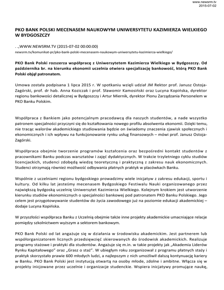 www.newsrm.tv 2015-07-02 PKO BANK POLSKI MECENASEM NAUKOWYM UNIWERSYTETU KAZIMIERZA WIELKIEGO W BYDGOSZCZY . .,WWW.NEWSRM.TV (2015-07-02 00:00:00) newsrm.tv/komunikat-pr/pko-bank-polski-mecenasem-naukowym-uniwersytetu-kazimierza-wielkiego/ PKO Bank Polski rozszerza współpracę z Uniwersytetem Kazimierza Wielkiego w Bydgoszczy. Od października br. na kierunku ekonomii uczelnia otwiera specjalizację bankowość, którą PKO Bank Polski objął patronatem. Umowa została podpisana 1 lipca 2015 r. W spotkaniu wzięli udział JM Rektor prof. Janusz OstojaZagórski, prof. dr hab. Anna Koziczak i prof. Sławomir Kamosiński oraz Lucyna Kopińska, dyrektor regionu bankowości detalicznej w Bydgoszczy i Artur Miernik, dyrektor Pionu Zarządzania Personelem w PKO Banku Polskim. Współpraca z Bankiem jako potencjalnym pracodawcą dla naszych studentów, a nade wszystko patronem specjalności przyczyni się do kształtowania nowego profilu absolwenta ekonomii. Dzięki temu, nie tracąc walorów akademickiego studiowania będzie on świadomy znaczenia zjawisk społecznych i ekonomicznych i ich wpływu na funkcjonowanie rynku usług finansowych – mówi prof. Janusz OstojaZagórski. Współpraca obejmie tworzenie programów kształcenia oraz bezpośredni kontakt studentów z pracownikami Banku podczas warsztatów i zajęć dydaktycznych. W trakcie trzyletniego cyklu studiów licencjackich, studenci zdobędą wiedzę teoretyczną i praktyczną z zakresu nauk ekonomicznych. Studenci otrzymają również możliwość odbywania płatnych praktyk w placówkach Banku. Wspólnie z uczelniami regionu bydgoskiego prowadzimy wiele inicjatyw z zakresu edukacji, sportu i kultury. Od kilku lat jesteśmy mecenasem Bydgoskiego Festiwalu Nauki organizowanego przez największą bydgoską uczelnię Uniwersytet Kazimierza Wielkiego. Kolejnym krokiem jest utworzenie kierunku studiów ekonomicznych o specjalności bankowej pod patronatem PKO Banku Polskiego. Jego celem jest przygotowywanie studentów do życia zawodowego już na poziomie edukacji akademickiej – dodaje Lucyna Kopińska. W przyszłości współpraca Banku z Uczelnią obejmie także inne projekty akademickie umacniające relacje pomiędzy szkolnictwem wyższym a sektorem bankowym. PKO Bank Polski od lat angażuje się w działania w środowisku akademickim. Jest partnerem lub współorganizatorem licznych przedsięwzięć skierowanych do środowisk akademickich. Realizuje programy stażowe i praktyki dla studentów. Angażuje się m.in. w takie projekty jak „Akademia Liderów Rynku Kapitałowego” oraz „Grasz o staż”. W ubiegłym roku zorganizował z programu płatnych staży i praktyk skorzystało prawie 600 młodych ludzi, a najlepszym z nich umożliwił dalszą kontynuację kariery w Banku. PKO Bank Polski jest instytucją otwartą na osoby młode, zdolne i ambitne. Włącza się w projekty inicjowane przez uczelnie i organizacje studenckie. Wspiera inicjatywy promujące naukę, www.newsrm.tv 2015-07-02 popularyzujące zdobywanie wiedzy i pobudzanie kreatywności. Od kilku lat jest partnerem Olimpiady Wiedzy o Polsce i Świecie Współczesnym i sponsorem stypendiów dla najlepszych jej uczestników. PKO Bank Polski jest liderem polskiego sektora bankowego. Skonsolidowany zysk netto w I kwartale 2015 roku wyniósł 647 mln zł. Został uhonorowany nagrodą „Bank of the Year in Poland” przyznaną przez miesięcznik „The Banker” należący do „Financial Times”. PKO Bank Polski zajął pierwsze miejsce w rankingu Najlepszy Bank dla Firm miesięcznika „Forbes”, uzyskując sześć gwiazdek w ogólnej klasyfikacji. Bank uplasował się także w ścisłej czołówce, zajmując 3. pozycję w rankingu Jakość na Bank 2013, przygotowanym przez TNS Polska oraz „Puls Biznesu”. Contact Center Banku po raz siódmy zwyciężył w cyklicznym badaniu infolinii bankowych, przeprowadzanym przez ARC Rynek i Opinia. Bank kolejny rok z rzędu zwyciężył w rankingu 50 największych banków w Polsce miesięcznika finansowego „Bank”. W tegorocznej edycji rankingu zwyciężył w kategorii Banki finansujące nieruchomości, a wśród banków oferujących kredyty konsumenckie Consumer finance zajął 3. miejsce. W XII edycji konkursu Lider Informatyki Instytucji Finansowych 2013 „Gazety Bankowej” PKO Bank Polski otrzymał nagrodę w kategorii Bankowość elektroniczna i e-finanse, którą kapituła konkursu przyznała PKO Bankowi Polskiemu za wdrożenie aplikacji IKO. Bank wygrał również w kategorii Systemy back office za wdrożenie Centrum Innowacji. O tytuł Lidera walczyło kilkanaście instytucji finansowych, przede wszystkim z sektora bankowego i ubezpieczeniowego. Kapituła Konkursu VIII Kongresu Gospodarki Elektronicznej nagrodziła PKO Junior w kategorii Projekt Roku. PKO Bank Polski jest również najsilniejszym wizerunkowo bankiem w kraju. Pozostaje najbardziej wartościową marką polskiej bankowości według magazynu „The Banker”, który wycenił wartość marki PKO Banku Polskiego na 1,25 mld dolarów. W Rankingu Najcenniejszych Polskich Marek 2014 „Rzeczpospolitej” marka PKO Banku Polskiego pozostała najcenniejsza w kategorii finanse – jej wartość wyceniono na 3,6 mld złotych. Kapituła Konkursu Liderów Świata Bankowości, organizowanego w ramach Polskiego Kongresu Gospodarczego, przyznała PKO Bankowi Polskiemu nagrody w kategoriach Najlepszy Bank oraz Najbardziej Innowacyjny Bank w 2012 roku za nową ofertę Szkolnych Kas Oszczędności. Bank znalazł się w gronie najlepszych pracodawców w rankingach przygotowanych w oparciu o opinie studentów. Wysoką pozycję Banku potwierdzają badania międzynarodowej firmy Universum Global i stowarzyszenia AIESEC, przeprowadzane wśród studentów najlepszych uczelni w kraju. PKO Bank Polski jest także laureatem plebiscytu Złoty Bankier 2013 w kategorii Najlepszy kredyt hipoteczny i Innowacja Finansowa za aplikację IKO.