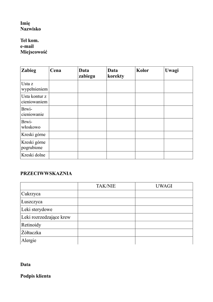 Imię Nazwisko Tel kom. e-mail Miejscowość Zabieg Cena Data zabiegu Data korekty Kolor Uwagi Usta z wypełnieniem Usta kontur z cieniowaniem Brwicieniowanie Brwiwłoskowo Kreski górne Kreski górne pogrubione Kreski dolne PRZECIWWSKAZNIA TAK/NIE Cukrzyca Łuszczyca Leki sterydowe Leki rozrzedzające krew Retinoidy Żółtaczka Alergie Data Podpis klienta UWAGI Podpis linergistki Oświadczam, że udzielone przeze mnie odpowiedzi są zgodne z prawdą i zawierają wszystkie prawdziwe informacje, które mogą być istotne dla zabiegu. INFORMACJE PRZED ZABIEGIEM Po wykonaniu zabiegu makijażu permanentnego konieczne jest zachowanie środków ostrożności w procesie regeneracji. Efekt końcowy jest uzależniony przede wszystkim od rodzaju skóry oraz jej stanu w dniu zabiegu. Po wykonaniu pigmentacji- makijaż sprawia wrażenie bardzo intensywnego i przerysowanego. Czas gojenia uzależniony jest od pigmentowanej okolicy (3-8 dni). Ostatecznie efekt jest widoczny po około miesiącu i wtedy należy wykonać korektę. Kolor końcowy makijażu uzależniony jest od naturalnego koloru skóry. Z każdym rokiem makijaż staje się coraz jaśniejszy, dlatego powinien być odświeżany. PODCZAS GOJENIA: – skora nie może mieć kontaktu z wodą i mydłem przez okres ok. 3 dnipigmentowaną okolicę utrzymujemy suchą – w pigmentowanej strefie nie wolno stosować toników alkoholowych i preparatów na bazie kwasów – w pigmentowanej okolicy nie wolno skubać, drapać, trzeć, usuwać strupków ani złuszczać – świeżego makijażu nie wystawiamy na promieniowanie UV – nie powinniśmy korzystać z basenu, sauny w okresie 10-14 dni po zabiegu – przy makijażu ust- w pierwszym dniu zaleca się pić przez słomkę, a po każdym posiłku usuwać resztki soli i kwasów z ust, następnie aplikować krem ochronny – nie powinno stosować się dotychczasowych produktów do ust, gdyż mogą być zakażone wirusem opryszczki – przy makijażu oczu- nie zaleca się zakładania soczewek przez okres 3- 5 dni ani wykonywania makijażu celem uniknięcia infekcji Na 24h przed i po zabiegu zabrania się spożywania alkoholu i Aspiryny. O wszystkich innych lekach spożywanych w ciągu ostatnich tygodni należy poinformować linergistkę (szczególnie sterydy i leki z grupy retinoidów). Oświadczam, iż zapoznałem się z materiałem informacyjnymi dotyczącymi zabiegu, przygotowania i przeciwwskazań do zabiegu makijażu permanentnego, a także z instrukcją dotyczącą postępowania po pigmentacji. Zostałem poinformowany o konieczności wykonania zabiegu uzupełniającego w okresie do 2 miesięcy. W pełni akceptuję produkty, formę, kształt, oraz rodzaj pigmentu dobranego przez linergistkę. Poinformowano mnie również o zastosowaniu jednorazowego modułu do pigmentacji, który jest otwierany bezpośrednio przed zabiegiem zapewniając w ten sposób sterylność i higienę. Wyrażam zgodę na wykonanie zabiegu w Salonie INOI oraz z zastosowaniem znieczulenia. Data Podpis Klienta Podpis Linergistki