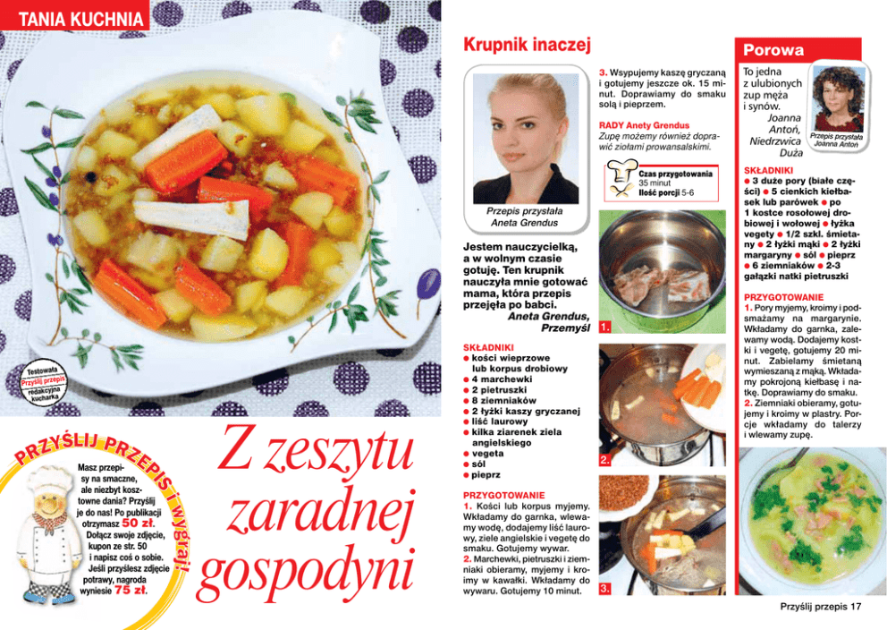 TANIA KUCHNIA Krupnik inaczej Porowa 3. Wsypujemy kaszę gryczaną i gotujemy jeszcze ok. 15 minut. Doprawiamy do smaku solą i pieprzem. RADY Anety Grendus Zupę możemy również doprawić ziołami prowansalskimi. Czas przygotowania 35 minut Ilość porcji 5-6 Przepis przysłała Aneta Grendus Jestem nauczycielką, a w wolnym czasie gotuję. Ten krupnik nauczyła mnie gotować mama, która przepis przejęła po babci. Aneta Grendus, Przemyśl 1. Testowała pis Przyślij prze redakcyjna kucharka Masz pprzepisy na smaczne, ale nieezbyt kosztowne dania? Przyślij je do nnas! Po publikacji otrzym masz 50 zł. Dołąącz swoje zdjęcie, kuppon ze str. 50 i naapisz coś o sobie. Jeśśli przyślesz zdjęcie potraawy, nagroda wynieesie 75 zł. Z zeszytu zaradnej gospodyni SKŁADNIKI ● kości wieprzowe lub korpus drobiowy ● 4 marchewki ● 2 pietruszki ● 8 ziemniaków ● 2 łyżki kaszy gryczanej ● liść laurowy ● kilka ziarenek ziela angielskiego ● vegeta ● sól ● pieprz PRZYGOTOWANIE 1. Kości lub korpus myjemy. Wkładamy do garnka, wlewamy wodę, dodajemy liść laurowy, ziele angielskie i vegetę do smaku. Gotujemy wywar. 2. Marchewki, pietruszki i ziemniaki obieramy, myjemy i kroimy w kawałki. Wkładamy do wywaru. Gotujemy 10 minut. To jedna z ulubionych zup męża i synów. Joanna Antoń, Niedrzwica Duża Przepis przysłała Joanna Antoń SKŁADNIKI ● 3 duże pory (białe części) ● 5 cienkich kiełbasek lub parówek ● po 1 kostce rosołowej drobiowej i wołowej ● łyżka vegety ● 1/2 szkl. śmietany ● 2 łyżki mąki ● 2 łyżki margaryny ● sól ● pieprz ● 6 ziemniaków ● 2-3 gałązki natki pietruszki PRZYGOTOWANIE 1. Pory myjemy, kroimy i podsmażamy na margarynie. Wkładamy do garnka, zalewamy wodą. Dodajemy kostki i vegetę, gotujemy 20 minut. Zabielamy śmietaną wymieszaną z mąką. Wkładamy pokrojoną kiełbasę i natkę. Doprawiamy do smaku. 2. Ziemniaki obieramy, gotujemy i kroimy w plastry. Porcje wkładamy do talerzy i wlewamy zupę. 2. 3. Przyślij przepis 17