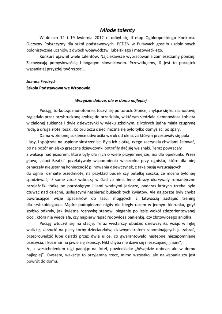 Młode talenty W dniach 12 i 19 kwietnia 2012 r. odbył się II etap Ogólnopolskiego Konkursu Ojczyzny Polszczyzny dla szkół podstawowych. PCDZN w Puławach gościło uzdolnionych polonistycznie uczniów z dwóch województw: lubelskiego i mazowieckiego. Konkurs ujawnił wiele talentów. Najciekawsze wypracowania zamieszczamy poniżej. Zachwycają pomysłowością i bogatym słownictwem. Przewidujemy, iż jest to początek wspaniałej przyszłej twórczości… Joanna Frydrych Szkoła Podstawowa we Wronowie Wszędzie dobrze, ale w domu najlepiej Pociąg, turkocząc monotonnie, toczył się po torach. Słońce, chylące się ku zachodowi, zaglądało przez przybrudzoną szybkę do przedziału, w którym siedziała ciemnowłosa kobieta w zielonej sukience i dwie dziewczynki w wieku szkolnym, z których jedna miała czuprynę rudą, a druga złote loczki. Koloru oczu dzieci można się było tylko domyślać, bo spały. Dama w zielonej sukience odwróciła wzrok od okna, za którym przesuwały się pola i lasy, i spojrzała na uśpione siostrzenice. Była ich ciotką, czego zaczynała chwilami żałować, bo na pozór anielsko grzeczne dziewczynki potrafiły dać się we znaki. Teraz powracały z wakacji nad jeziorem, które były dla nich o wiele przyjemniejsze, niż dla opiekunki. Przez głowę „cioci Beatki” przelatywały wspomnienia wieczorku przy ognisku, które dla niej oznaczały nieustanną konieczność pilnowania dziewczynek, z taką pasją wrzucających do ognia rozmaite przedmioty, na przykład budzik czy butelkę soczku, że można było się spodziewać, iż same zaraz wskoczą w ślad za nimi. Inne obrazy ukazywały romantyczne przejażdżki łódką po porośniętym liliami wodnymi jeziorze, podczas których trzeba było czuwać nad dziećmi, usiłującymi nazbierać bukiecik tych kwiatów. Ale najgorsze były chyba powracające wizje spacerków do lasu, mogących z łatwością zastąpić trening dla szybkobiegacza. Mądre podopieczne nigdy nie biegły razem w jednym kierunku, gdyż szybko odkryły, jak świetną rozrywkę stanowi bieganie po lesie wokół zdezorientowanej cioci, która nie wiedziała, czy najpierw łapać rudowłosą panienkę, czy złotowłosego aniołka. Pociąg wtoczył się na stację. Teraz wystarczy obudzić dziewczynki, wziąć w rękę walizkę, zarzucić na plecy torby dzieciaczków, dziwnym trafem zapominających je zabrać, przeprowadzić lube dziatki przez dwie ulice, co gwarantowało następne niezapomniane przeżycia, i koszmar na jawie się skończy. Nikt chyba nie dziwi się nieszczęsnej „niani”, że, z westchnieniem ulgi padając na fotel, powiedziała: „Wszędzie dobrze, ale w domu najlepiej”. Owszem, wakacje to przyjemna rzecz, mimo wszystko, ale najwspanialszy jest powrót do domu. Lena Starzyńska Szkoła Podstawowa nr 96 im. Ireny Kosmowskiej w Warszawie Wszędzie dobrze, ale w domu najlepiej Pewien konik polny, który Eustachy się nazywa, został zaproszony przez swego kuzyna. Długą drogę przebył, pociągiem i autostopem. Myślał też o podroży samolotem, ale tego by było za wiele, przecież jest natury przyjacielem. Gdy do Międzyzdroju przybył, kuzyn od razu zaprosił go na grzyby. Chodzili po lesie długimi godzinami, choć Eustachemu wydawało się, że latami. Kiedy skończyli, do domu kuzyna wrócili. „Całkiem przytulna chatka, jak na takiego gagatka” – Eustachy myślał, ale się nie domyślał, co go czeka – i nie będzie to rozlanie mleka! Gdy następnego dnia o poranku stanął zadowolony na ganku i świeże powietrze wdychając, usadowił się na hamaku, by doznać lenistwa smaku, nagle coś zasłoniło mu słońce. „Czy to chmury lśniące?!” – zastanowił się konik. Wtem coś zaczęło go gonić, a właściwie lecieć prosto na niego. „Co tu robić?! Wejść na drzewo!!” – myślał zrozpaczony, bo wrogami okazały się dwie wrony. Skakał w dal i w dal. Wiatr z szyi zdmuchnął mu szal, ale ptaki i tak nie ustępowały, bo się najeść chciały. W końcu nasz konik znalazł kryjówkę. Za cel obrał borówkę, ukrył się w jej liściach, a zmylone ptaki poszukiwały go w winogron kiściach. Kiedy wszystko ucichło, udał się Eustachy do domu, bo takie życie, choć koło lasu, niemiłe nikomu. Gdy na swym podwórku usiadł i odetchnął, zrozumiał, że się ze śmiercią zetknął, ale ją sprytnie przechytrzył i nim się kto obejrzał, już w domu leżał. Morał z tej bajki jest krótki i niektórym znany: w domu jednak jest najlepiej, lepiej nawet, niż u mamy. Materiały przygotowała: D. Wójcik