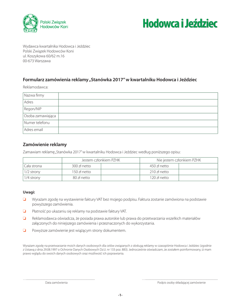 Wydawca kwartalnika Hodowca i Jeździec Polski Związek Hodowców Koni ul. Koszykowa 60/62 m.16 00-673 Warszawa Formularz zamówienia reklamy „Stanówka 2017” w kwartalniku Hodowca i Jeździec Reklamodawca: Nazwa firmy Adres Regon/NIP Osoba zamawiająca Numer telefonu Adres email Zamówienie reklamy Zamawiam reklamę „Stanówka 2017” w kwartalniku Hodowca i Jeździec według poniższego opisu: Cała strona 1/2 strony 1/4 strony Jestem członkiem PZHK 300 zł netto 150 zł netto 80 zł netto Nie jestem członkiem PZHK 450 zł netto 210 zł netto 120 zł netto Uwagi: ❏ yrażam zgodę na wystawienie faktury VAT bez mojego podpisu. Faktura zostanie zamówiona na podstawie W powyższego zamówienia. ❏ Płatność po ukazaniu się reklamy na podstawie faktury VAT. ❏ eklamodawca oświadcza, że posiada prawa autorskie lub prawa do przetwarzania wszelkich materiałów R załączonych do niniejszego zamówienia i przeznaczonych do wykorzystania. ❏ Powyższe zamówienie jest wiążącym strony dokumentem. Wyrażam zgodę na przetwarzanie moich danych osobowych dla celów związanych z obsługą reklamy w czasopiśmie Hodowca i Jeździec (zgodnie z Ustawą z dnia 29.08.1997 o Ochronie Danych Osobowych Dz.U. nr 133 poz. 883). Jednocześnie oświadczam, że zostałem poinformowany, iż mam prawo wglądu do swoich danych osobowych oraz możliwość ich poprawiania. …..........................................................................................................................…................................................................................................................................. Data zamówienia Podpis osoby składającej zamówienie -1- Dane konia do reklamy: Imię konia Numer licencji Data urodzenia Wymiary Maść Hodowca Właściciel Rodowód: OJCIEC OJCIEC MATKA OJCIEC OJCIEC MATKA MATKA OJCIEC trk. SILVER trk. MATKA MATKA OJCIEC MATKA MATKA Opis konia: Opis kariery użytkowej konia będzie weryfikowany z bazą PZHK. Dane kontaktowe: imię, nazwisko adres, telefon, strona www, itp W przypadku zgłoszenia więcej niż jednego konia, prosimy o powielenie formularza opisu. -2-