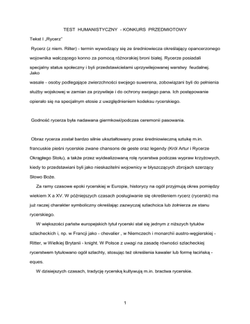 TEST HUMANISTYCZNY - KONKURS PRZEDMIOTOWY Tekst I „Rycerz” Rycerz (z niem. Rilter) - termin wywodzący się ze średniowiecza określający opancerzonego wojownika walczącego konno za pomocą róŜnorakiej broni białej. Rycerze posiadali specjalny status społeczny i byli przedstawicielami uprzywilejowanej warstwy feudalnej. Jako wasale - osoby podlegające zwierzchności swojego suwerena, zobowiązani byli do pełnienia słuŜby wojskowej w zamian za przywileje i do ochrony swojego pana. Ich postępowanie opierało się na specjalnym etosie z uwzględnieniem kodeksu rycerskiego. Godność rycerza była nadawana giermkowi/podczas ceremonii pasowania. Obraz rycerza został bardzo silnie ukształtowany przez średniowieczną sztukę m.in. francuskie pieśni rycerskie zwane chansons de geste oraz legendy (Król Artur i Rycerze Okrągłego Stołu), a takŜe przez wyidealizowaną rolę rycerstwa podczas wypraw krzyŜowych, kiedy to przedstawiani byli jako nieskazitelni wojownicy w błyszczących zbrojach szerzący Słowo BoŜe. Za ramy czasowe epoki rycerskiej w Europie, historycy na ogół przyjmują okres pomiędzy wiekiem X a XV. W późniejszych czasach posługiwanie się określeniem rycerz (rycerski) ma juŜ raczej charakter symboliczny określając zazwyczaj szlachcica lub Ŝołnierza ze stanu rycerskiego. W większości państw europejskich tytuł rycerski stał się jednym z niŜszych tytułów szlacheckich i, np. w Francji jako - chevalier , w Niemczech i monarchii austro-węgierskiej Ritter, w Wielkiej Brytanii - knight. W Polsce z uwagi na zasadę równości szlacheckiej rycerstwem tytułowano ogół szlachty, stosując teŜ określenia kawaler lub formę łacińską eques. W dzisiejszych czasach, tradycję rycerską kultywują m.in. bractwa rycerskie. 1 1. Co naleŜało do obowiązków rycerza? …………………………………………………………………………………………………………… ………………………………………………. 2. Z tekstu wypisz dwa synonimy do wyrazu rycerz . …………………………………………………………………………………………………………… ………………………………………………. 3. WskaŜ rodzaj broni wykorzystywanej w trakcie pasowania giermka na rycerza . a) szabla b) mizerykordia c) szczerbiec d) miecz 4. Która z warstw społecznych w Polsce wywodziła się z rycerstwa ? …………………………………………………………………………………………………………… ……………………………………………… 5. Z jakiego języka pochodzi wyraz rycerz ? …………………………………………………………………………………………………………… ……………………………………………… 6. Zapisz , w którym roku rozpoczyna się wiek X , a w którym kończy wiek XV. Umieść daty na osi czasu. …………………………………………………………………………………………………………… ………………………………………………. 7. Wyjaśnij skróty : m.in. -………………………………………………………………………… np. - ……………………………………………………………………………… 8. Zamień zdanie na równowaŜnik zdania. Godność rycerza była nadawana giermkowi podczas ceremonii pasowania . …………………………………………………………………………………………………………… ……………………………………….. 2 Teks II Julian Ursyn Niemcewicz Zawisza Czarny (Śpiew historyczny) (…) W obliczu ludu, wśród Pańskiej świątnice , bierze młodzian cześć rycerza, Ojciec mu wkłada pancerz i przyłbicę I mieczem trzykroć uderza, I mówi, oręŜ mu dając niezmierny „Broń twej Ojczyzny, bądź kochance wierny!” Zawisza Czarny, gdyŜ z tego imienia znany był później u świata , W cięŜkiej kolczudze, nie tknąwszy strzemienia, lekko wskoczył na bachmata I gdy wesoło wpośród szranków pląsał , wywijał mieczem , kopiją potrząsał, Wkrótce się wsławił czyny walecznymi, Iitak śmiałość jego znano, śe w Niemczech, Włoszech i Tureckiej ziemi , kiedy go wychwalano, Przysłowiem było bojów towarzyszy „Polegaj na nim , jakby na Zawiszy” 9. Wypisz z wiersza porównanie . …………………………………………………………………………………………………………… …. 10. Wyjaśnij własnymi słowami , jak rozumiesz zacytowany wers wiersza . „ W obliczu ludu, wśród Pańskiej świątnice , Bierze młodzian cześć rycerza.” …………………………………………………………………………………………………………… …………………………………… 11. Kto jest bohaterem wiersza ? …………………………………………………………………………………………………………… .. 12. Uzupełnij tekst , wpisując właściwe litery. ..art du..a gor..cy patr..ota ryce.. w zbro.. 13. UłóŜ podane wyrazy w kolejności alfabetycznej. średniowiecze, wasal,suweren,giermek,wojownik,szlachcic,kawaler,rycerz,etos,pasowanie …………………………………………………………………………………………………………… ……………………………………………… …………………………………………………………………………………………………………… ……………………………………………… 3 14. Napisz opowiadanie , które zakończysz słowami „JuŜ teraz wiem , Ŝe mogę na nim polegać jak na Zawiszy” …………………………………………………………………………………………………………… ……………………………………………… …………………………………