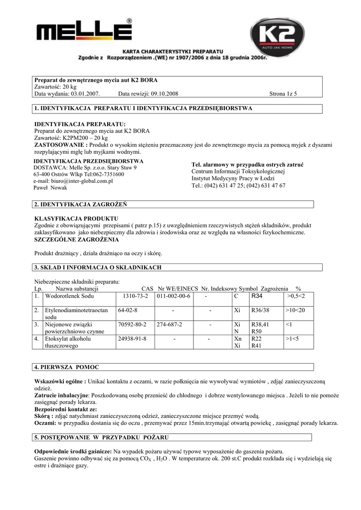 Preparat do zewnętrznego mycia aut K2 BORA Zawartość: 20 kg Data wydania: 03.01.2007. Data rewizji: 09.10.2008 Strona 1z 5 1. IDENTYFIKACJA PREPARATU I IDENTYFIKACJA PRZEDSIĘBIORSTWA IDENTYFIKACJA PREPARATU: Preparat do zewnętrznego mycia aut K2 BORA Zawartość: K2PM200 – 20 kg ZASTOSOWANIE : Produkt o wysokim stęŜeniu przeznaczony jest do zewnętrznego mycia za pomocą myjek z dyszami rozpylającymi mgłę lub myjkami wodnymi. IDENTYFIKACJA PRZEDSIĘBIORSTWA DOSTAWCA: Melle Sp. z.o.o. Stary Staw 9 63-400 Ostrów Wlkp Tel:062-7351600 e-mail: [email protected] Paweł Nowak Tel. alarmowy w przypadku ostrych zatruć Centrum Informacji Toksykologicznej Instytut Medycyny Pracy w Łodzi Tel.: (042) 631 47 25; (042) 631 47 67 2. IDENTYFIKACJA ZAGROśEŃ KLASYFIKACJA PRODUKTU Zgodnie z obowiązującymi przepisami ( patrz p.15) z uwzględnieniem rzeczywistych stęŜeń składników, produkt zaklasyfikowano jako niebezpieczny dla zdrowia i środowiska oraz ze względu na własności fizykochemiczne. SZCZEGÓLNE ZAGROśENIA Produkt draŜniący , działa draŜniąco na oczy i skórę. 3. SKŁAD I INFORMACJA O SKŁADNIKACH Niebezpieczne składniki preparatu: Lp. Nazwa substancji CAS Nr WE/EINECS Nr. Indeksowy Symbol ZagroŜenia % 1. Wodorotlenek Sodu 1310-73-2 011-002-00-6 C >0,5<2 R34 2. 3. 4. Etylenodiaminotetraoctan sodu Niejonowe związki powierzchniowo czynne Etoksylat alkoholu tłuszczowego 64-02-8 70592-80-2 274-687-2 24938-91-8 - - Xi R36/38 >10<20 - Xi N Xn Xi R38,41 R50 R22 R41 <1 - >1<5 4. PIERWSZA POMOC Wskazówki ogólne : Unikać kontaktu z oczami, w razie połknięcia nie wywoływać wymiotów , zdjąć zanieczyszczoną odzieŜ. Zatrucie inhalacyjne: Poszkodowaną osobę przenieść do chłodnego i dobrze wentylowanego miejsca . JeŜeli to nie pomoŜe zasięgnąć porady lekarza. Bezpośredni kontakt ze: Skórą : zdjąć natychmiast zanieczyszczoną odzieŜ, zanieczyszczone miejsce przemyć wodą. Oczami: w przypadku dostania się do oczu , przemywać przez 15min.trzymająć otwartą powiekę , zasięgnąć porady lekarza. 5. POSTĘPOWANIE W PRZYPADKU POśARU Odpowiednie środki gaśnicze: Na wypadek poŜaru uŜywać typowe wyposaŜenie do gaszenia poŜaru. Gaszenie powinno odbywać się za pomocą COX , H2O . W temperaturze ok. 200 st.C produkt rozkłada się i wydzielają się ostre i draŜniące gazy. Preparat do zewnętrznego mycia aut K2 BORA Zawartość: 20 kg strona 2 z 5 6. POSTĘPOWANIE W PRZYPADKU NIEZAMIERZONEGO UWOLNIENIA DO ŚRODOWISKA Absorbować uwolniony produkt za pomocą piasku bądź ziemi następnie zebrać przy pomocy materiałów absorbujących do szczelnych polietylenowych pojemników i przekazać do zlikwidowania wg pkt 13. Pozostałości spłukać duŜą ilością wody. 7. POSTĘPOWANIE Z PREPARATEM I ICH MAGAZYNOWANIE Produkt przechowywać w szczelnym opakowaniu, chłodnym miejscu, trzymając z dala od gorących miejsc oraz od produktów kwaśnych. Rodzaj opakowań: Kanister z tworzywa sztucznego o zawartości 20 kg. 8. KONTROLA NARAśENIA I ŚRODKI OCHRONY INDYWIDUALNEJ Kontrola naraŜenia :Wartości dopuszczalnych stęŜeńOchrona dróg oddechowych: W normalnych warunkach nie ma Ŝadnych szczególnych środków ostroŜności. UŜywać, pryskać produkt w dobrze wentylowanych pomieszczeniach. Poleca się zakładanie masek. Ochrona rąk: UŜywać gumowe rękawice Ochrona oczu: UwaŜać, aby produkt nie dostał się do oczu, uŜywać okulary ochronne Zanieczyszczenie skóry: Unikać kontaktu ze skórą, nosić odzieŜ roboczą Pracodawca jest obowiązany zapewnić , aby stosowane środki ochrony indywidualnej oraz odzieŜ i obuwie robocze posiadały właściwości ochronne i uŜytkowe oraz zapewnić odpowiednie ich pranie , konserwację , naprawę i odkaŜanie. 9. WŁAŚCIWOŚCI FIZYCZNE I CHEMICZNE Stan fizyczny: Barwa: Zapach: Gęstość(woda=1) Rozpuszczalny Temperatura wrzenia: Wartość pH: Łatwopalne: Punkt zestalenia: ciecz fluoroscencyjny zielony delikatny cytrynowy 1,150+/-0,015g/ml wodzie >100stC >13 nie jest łatwopalne <0stC 10. STABILNOŚĆ I REAKTYWNOŚĆ Stabilność: w normalnych warunkach temperatury i ciśnienia stabilny .Reaguje z silnymi kwasami. 11. INFORMACJE TOKSYKOLOGICZNE Substancje zawarte w preparacie nie są umieszczone w wykazach substancji , preparatów , czynników lub procesów technologicznych o działaniu rakotwórczym lub mutagennym w środowisku pracy . Lp Surowiec DL 50 doustnie szczur DL 50 doustnie królik 1. Wodorotlenek sodu 500mg/Kg 2. Niejonowe związki >2000mg/Kg powierzchniowo czynne 3. Ethoxylate alcohol Pomiedzy 200 a 2000 mg/Kg - PodraŜnienia dróg oddechowych podczas pryskania. MoŜe powodować lekkie podraŜnienie skóry podczas bezpośredniego kontaktu. MoŜe powodować powaŜne uszkodzenia oczu Preparat do zewnętrznego mycia aut K2 BORA Zawartość: 20 kg strona 3 z 5 12. INFORMACJE EKOLOGICZNE Zawiera anionowe i niejonowe środki powierzchniowo czynne, które są biodegradowlane >90% Ethoxylate alchool COD 2400 mg O2 /g toksyczność dla Daphni EC 50 ( 48h) >100mg/L Toksyczność dla ryb CL 50 (96h) from 10 to 20 mg/L Cassius Auratus 13. POSTĘPOWANIE Z ODPADAMI Pakowanie: Zanieczyszczone opakowania traktować w taki sam sposób , jak samą substancję .Nie zanieczyszczone opakowania moŜna traktować jak odpady z gospodarstw domowych lub skierować do utylizacji. Opakowania zuŜyte naleŜy unieszkodliwić . Kod odpadów dla kanistrów z tworzywa sztucznego 20 01 39 14. INFORMACJE O TRANSPORCIE Nie podlega przepisom ADR. Produkt moŜna przewozić dowolnymi środkami transportu w oryginalnych szczelnie zamkniętych opakowaniach. 15. INFORMACJE DOTYCZĄCE PRZEPISÓW PRAWNYCH KLASYFIKACJA PRODUKTU Produkt zaklasyfikowano jako niebezpieczny dla zdrowia i środowiska oraz ze względu na własności fizykochemiczne. OZNAKOWANIE OPAKOWAŃ: Znaki ostrzegawcze: Symbole ostrzegawcze: Xi -Produkt draŜniący. Określenie zagroŜenia (R) : R36/38-Działą draŜniąco na oczy i skórę. Określenie dotycząc