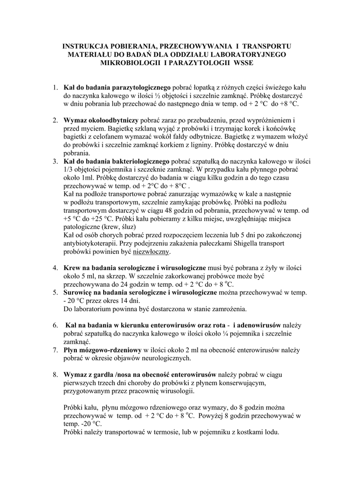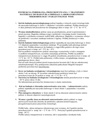 INSTRUKCJA POBIERANIA, PRZECHOWYWANIA I TRANSPORTU MATERIAŁU DO BADAŃ DLA ODDZIAŁU LABORATORYJNEGO MIKROBIOLOGII I PARAZYTOLOGII WSSE 1. Kał do badania parazytologicznego pobrać łopatką z różnych części świeżego kału do naczynka kałowego w ilości ½ objętości i szczelnie zamknąć. Próbkę dostarczyć w dniu pobrania lub przechować do następnego dnia w temp. od + 2 °C do +8 °C. 2. Wymaz okołoodbytniczy pobrać zaraz po przebudzeniu, przed wypróżnieniem i przed myciem. Bagietkę szklaną wyjąć z probówki i trzymając korek i końcówkę bagietki z celofanem wymazać wokół fałdy odbytnicze. Bagietkę z wymazem włożyć do probówki i szczelnie zamknąć korkiem z ligniny. Próbkę dostarczyć w dniu pobrania. 3. Kał do badania bakteriologicznego pobrać szpatułką do naczynka kałowego w ilości 1/3 objętości pojemnika i szczeknie zamknąć. W przypadku kału płynnego pobrać około 1ml. Próbkę dostarczyć do badania w ciągu kilku godzin a do tego czasu przechowywać w temp. od + 2°C do + 8°C . Kał na podłoże transportowe pobrać zanurzając wymazówkę w kale a następnie w podłożu transportowym, szczelnie zamykając probówkę. Próbki na podłożu transportowym dostarczyć w ciągu 48 godzin od pobrania, przechowywać w temp. od +5 °C do +25 °C. Próbki kału pobieramy z kilku miejsc, uwzględniając miejsca patologiczne (krew, śluz) Kał od osób chorych pobrać przed rozpoczęciem leczenia lub 5 dni po zakończonej antybiotykoterapii. Przy podejrzeniu zakażenia pałeczkami Shigella transport probówki powinien być niezwłoczny. 4. Krew na badania serologiczne i wirusologiczne musi być pobrana z żyły w ilości około 5 ml, na skrzep. W szczelnie zakorkowanej probówce może być przechowywana do 24 godzin w temp. od + 2 °C do + 8 oC. 5. Surowicę na badania serologiczne i wirusologiczne można przechowywać w temp. - 20 °C przez okres 14 dni. Do laboratorium powinna być dostarczona w stanie zamrożenia. 6. Kał na badania w kierunku enterowirusów oraz rota - i adenowirusów należy pobrać szpatułką do naczynka kałowego w ilości około ¼ pojemnika i szczelnie zamknąć. 7. Płyn mózgowo-rdzeniowy w ilości około 2 ml na obecność enterowirusów należy pobrać w okresie objawów neurologicznych. 8. Wymaz z gardła /nosa na obecność enterowirusów należy pobrać w ciągu pierwszych trzech dni choroby do probówki z płynem konserwującym, przygotowanym przez pracownię wirusologii. Próbki kału, płynu mózgowo rdzeniowego oraz wymazy, do 8 godzin można przechowywać w temp. od + 2 °C do + 8 oC. Powyżej 8 godzin przechowywać w temp. -20 °C. Próbki należy transportować w termosie, lub w pojemniku z kostkami lodu. 9. Wymaz z gardła /nosa w kierunku grypy należy pobrać do probówki z płynem transportowym przygotowanym przez pracownię wirusologii i dostarczyć do laboratorium w ciągu 24 godzin, do tego czasu przechowywać w temp. od +2°C do +8°C. Pobieranie innych materiałów do badań wirusologicznych należy konsultować z pracownią wirusologii WSSE . 10. Wymaz z gardła na badanie bakteriologiczne Sterylną szpatułką należy unieruchomić język, jałową wymazówką z bakteriologicznego zestawu transportowego pobrać materiał ze zmienionych zapalnie okolic tylnej ściany gardła, podniebienia lub migdałków mocno pocierając wacik lub wykonując nim ruch obrotowy. Starać się nie dotykać zdrowo wyglądających śluzówek i śliny. 11. Wymaz z nosa, oka, ucha, rany powinien wykonywać lekarz pobierając go na bakteriologiczny zestaw transportowy. Wymazy z gardła, nosa, ucha, oka i rany należy dostarczyć do laboratorium w ciągu 24 godzin, do tego czasu przechowywać w temp. pokojowej. 12. Mocz do badania bakteriologicznego Mocz należy pobrać przed rozpoczęciem leczenia antybiotykami lub 5-7 dni po zakończonej antybiotykoterapii. Środkowy strumień moczu, (około 50 ml) pobrać rano do jałowego pojemnika po uprzednim dokładnym umyciu, przesłać do laboratorium w ciągu 4 godzin, do tego czasu przechowywać w temp. temperaturze od + 2 oC do + 8 oC. Mocz pobrany w powyższy sposób można też posiać na podłoże transportowowzrostowe (Uromedium, Uriline, Uricult) zgodnie z instrukcją producenta. Dostarczyć w ciągu 24 godzin, do czasu transportu przechowywać w temperaturze +37 oC. 13. Wymazy szpitalne Wymazy należy pobrać zwilżoną w płynie Ringera (1:4) jałową wymazówką i przetransportować do laboratorium wciągu 4 godzin, lub pobrać na podłoże transportowe i dostarczyć w ciągu 24 godzin. 14. Sporal A, sporal S, duo-spor, attest a) do każdej nowej serii produkcji testu biologicznego należy dostarczyć jeden niewysterylizowany test, który jest kontrolą żywotności drobnoustrojów testowych w danej serii (nie przy każdym badaniu, tylko w momencie rozpoczęcia nowej serii testów biologicznych). b) test biologiczny poddać sterylizacji, po zakończeniu procesu, sterylną pensetą wyjąć test biologiczny ze sterylizatora i umieścić go w jałowym opakowaniu, szczelnie zamykając. Dostarczyć do laboratorium w tym samym dniu. Do czasu transportu test przechowywać w temp. od + 2°C do + 8°C. . Każda próbka dostarczona do Oddziału Laboratoryjnego Mikrobiologii i Parazytologii WSSE musi być opisana imieniem i nazwiskiem pacjenta oraz datą pobrania.