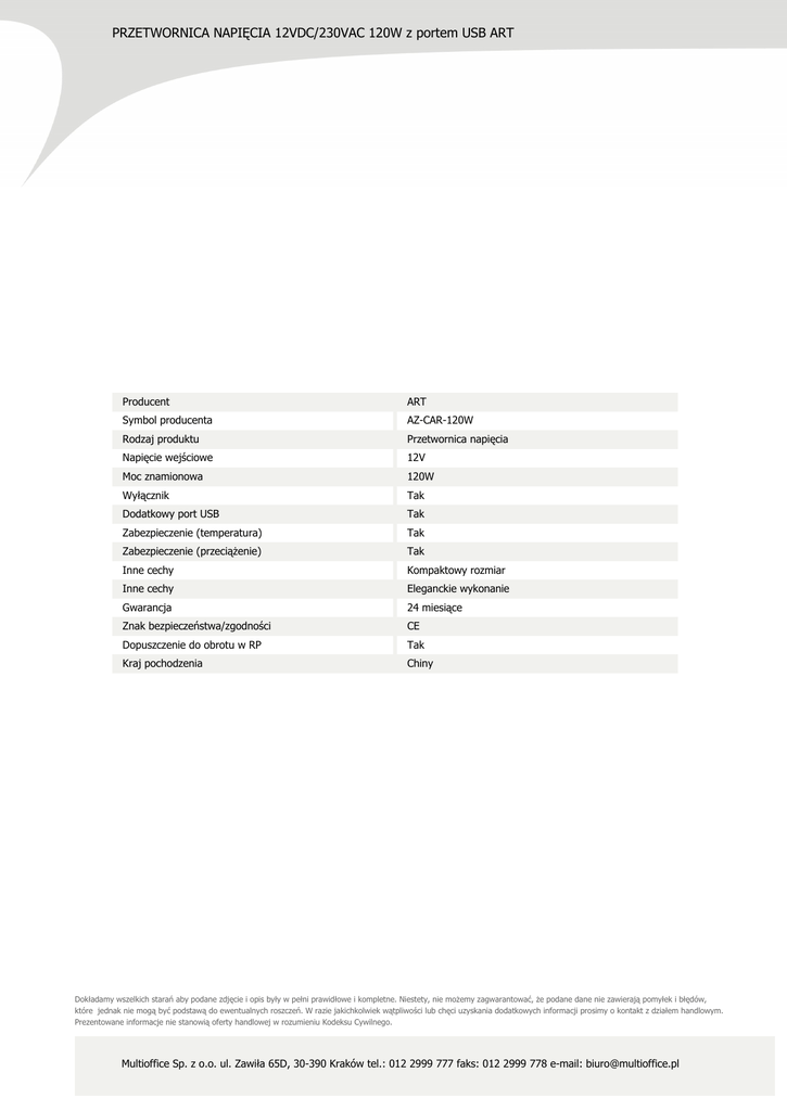 PRZETWORNICA NAPIĘCIA 12VDC/230VAC 120W z portem USB ART Producent ART Symbol producenta AZ-CAR-120W Rodzaj produktu Przetwornica napięcia Napięcie wejściowe 12V Moc znamionowa 120W Wyłącznik Tak Dodatkowy port USB Tak Zabezpieczenie (temperatura) Tak Zabezpieczenie (przeciążenie) Tak Inne cechy Kompaktowy rozmiar Inne cechy Eleganckie wykonanie Gwarancja 24 miesiące Znak bezpieczeństwa/zgodności CE Dopuszczenie do obrotu w RP Tak Kraj pochodzenia Chiny Dokładamy wszelkich starań aby podane zdjęcie i opis były w pełni prawidłowe i kompletne. Niestety, nie możemy zagwarantować, że podane dane nie zawierają pomyłek i błędów, które jednak nie mogą być podstawą do ewentualnych roszczeń. W razie jakichkolwiek wątpliwości lub chęci uzyskania dodatkowych informacji prosimy o kontakt z działem handlowym. Prezentowane informacje nie stanowią oferty handlowej w rozumieniu Kodeksu Cywilnego. Multioffice Sp. z o.o. ul. Zawiła 65D, 30-390 Kraków tel.: 012 2999 777 faks: 012 2999 778 e-mail: [email protected]