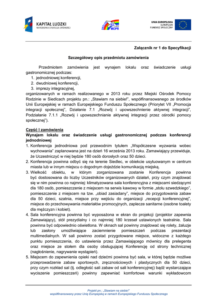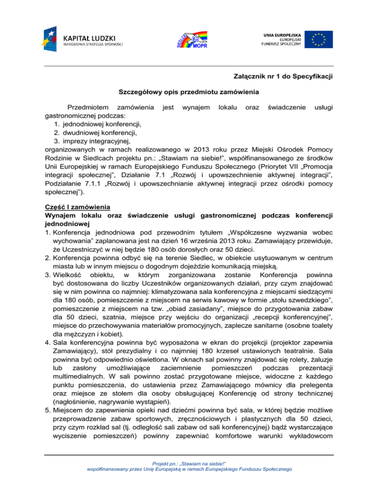 Załącznik nr 1 do Specyfikacji Szczegółowy opis przedmiotu zamówienia Przedmiotem zamówienia jest wynajem lokalu oraz świadczenie usługi gastronomicznej podczas: 1. jednodniowej konferencji, 2. dwudniowej konferencji, 3. imprezy integracyjnej, organizowanych w ramach realizowanego w 2013 roku przez Miejski Ośrodek Pomocy Rodzinie w Siedlcach projektu pn.: „Stawiam na siebie!”, współfinansowanego ze środków Unii Europejskiej w ramach Europejskiego Funduszu Społecznego (Priorytet VII „Promocja integracji społecznej”, Działanie 7.1 „Rozwój i upowszechnienie aktywnej integracji”, Podziałanie 7.1.1 „Rozwój i upowszechnianie aktywnej integracji przez ośrodki pomocy społecznej”). Część I zamówienia Wynajem lokalu oraz świadczenie usługi gastronomicznej podczas konferencji jednodniowej 1. Konferencja jednodniowa pod przewodnim tytułem „Współczesne wyzwania wobec wychowania” zaplanowana jest na dzień 16 września 2013 roku. Zamawiający przewiduje, że Uczestniczyć w niej będzie 180 osób dorosłych oraz 50 dzieci. 2. Konferencja powinna odbyć się na terenie Siedlec, w obiekcie usytuowanym w centrum miasta lub w innym miejscu o dogodnym dojeździe komunikacją miejską. 3. Wielkość obiektu, w którym zorganizowana zostanie Konferencja powinna być dostosowana do liczby Uczestników organizowanych działań, przy czym znajdować się w nim powinna co najmniej: klimatyzowana sala konferencyjna z miejscami siedzącymi dla 180 osób, pomieszczenie z miejscem na serwis kawowy w formie „stołu szwedzkiego”, pomieszczenie z miejscem na tzw. „obiad zasiadany”, miejsce do przygotowania zabaw dla 50 dzieci, szatnia, miejsce przy wejściu do organizacji „recepcji konferencyjnej”, miejsce do przechowywania materiałów promocyjnych, zaplecze sanitarne (osobne toalety dla mężczyzn i kobiet). 4. Sala konferencyjna powinna być wyposażona w ekran do projekcji (projektor zapewnia Zamawiający), stół prezydialny i co najmniej 180 krzeseł ustawionych teatralnie. Sala powinna być odpowiednio oświetlona. W oknach sal powinny znajdować się rolety, żaluzje lub zasłony umożliwiające zaciemnienie pomieszczeń podczas prezentacji multimedialnych. W sali powinno zostać przygotowane miejsce, widoczne z każdego punktu pomieszczenia, do ustawienia przez Zamawiającego mównicy dla prelegenta oraz miejsce ze stołem dla osoby obsługującej Konferencję od strony technicznej (nagłośnienie, nagrywanie wystąpień). 5. Miejscem do zapewnienia opieki nad dziećmi powinna być sala, w której będzie możliwe przeprowadzenie zabaw sportowych, zręcznościowych i plastycznych dla 50 dzieci, przy czym rozkład sal (tj. odległość sali zabaw od sali konferencyjnej) bądź wystarczające wyciszenie pomieszczeń) powinny zapewniać komfortowe warunki wykładowcom Projekt pn.: „Stawiam na siebie!” współfinansowany przez Unię Europejską w ramach Europejskiego Funduszu Społecznego i słuchaczom Konferencji (prowadzenie zabaw dla dzieci w trakcie Konferencji będzie stanowiło przedmiot odrębnego zamówienia). 6. Usługa gastronomiczna powinna obejmować przygotowanie i obsługę: serwisu kawowego dla 180 osób, poczęstunku dla 50 dzieci oraz tzw. „obiadu zasiadanego” dla 180 osób dorosłych oraz 50 dzieci. 1) Serwis kawowy powinien funkcjonować w trakcie rejestracji oraz podczas jednej zaplanowanej pomiędzy wykładami przerwy kawowej. Serwis kawowy w formie „stołu szwedzkiego” powinien obejmować: a) estetyczne nakrycie stołu – obrusy, ceramiczną zastawę (filiżanki na kawę i herbatę, spodki, talerzyki deserowe oraz szklanki na napoje i wodę, serwetki, łyżeczki i widelczyki, warniki lub termosy do gorącej wody o łącznej pojemności co najmniej 35 litrów, dzbanki na soki i wodę o łącznej pojemności co najmniej 17,5 litra); b) przygotowanie napojów – kawy naturalnej mielonej, kawy rozpuszczalnej, herbaty czarnej i smakowej ekspresowej z zawieszką, dodatków tj.: cukru, śmietanki do kawy, cytryny w plasterkach oraz gorącej wody w warnikach lub termosach, soków owocowych i wody mineralnej – w ilości odpowiedniej do liczby Uczestników Konferencji; c) przygotowanie poporcjowanego ciasta na paterach – dla każdego Uczestnika na całodzienny serwis kawowy 6 kawałków ciasta (podawanych w papilotach) o wadze około 50 g każdy (np. sernik, szarlotka, napoleonka, czekoladowiec, 3bit, tiramisu, karpatka, kora orzechowa, ananasowiec – co najmniej 4 rodzaje) oraz 6 różnych ciasteczek koktajlowych; d) obsługę serwisu – do której należeć będzie m.in.: przygotowanie stołu oraz utrzymanie porządku na stole (rozłożenie obrusów, serwetek, ułożenie naczyń, krojenie i układanie na paterach ciasta i ciasteczek koktajlowych, wymiana brudnych naczyń i sztućców, uzupełnianie wody w warnikach lub termosach oraz soków w dzbankach). 2) Poczęstunek dla dzieci powinien składać się z: kanapek z szynką, żółtym serem i pomidorem lub ogórkiem oraz bułki drożdżowej z serem podanych na serwetkach lub talerzykach jednorazowych (po 2 kanapki z połówki kromki chleba oraz po jednej bułce drożdżowej dla dziecka) oraz soków i wody mineralnej niegazowanej w ilości odpowiedniej do liczby dzieci, przy czym soki i woda powinny być przygotowane w formie „stołu szwedzkiego” wraz z kubeczkami jednorazowymi i dostępne przez cały czas organizacji zajęć dla dzieci na sali zabaw, zaś kanapki i bułki powinny być podane w trakcie dwóch przerw w zajęciach, w czasie wskazanym przez osoby zaangażowane do prowadzenia zabaw z dziećmi. 3) „Obiad zasiadany” powinien obejmować gorący posiłek z dwóch dań, deser oraz napój dla każdego Uczestnika Konferencji (180 osób dorosłych i 50 dzieci), przy czym na pierwsze danie będzie to – rosół z makaronem naleśnikowym (porcja 300 g/osobę), na drugie danie – kieszonki schabowe z nadzieniem serowoszynkowym (porcja 200 g/osobę) z ziemnia