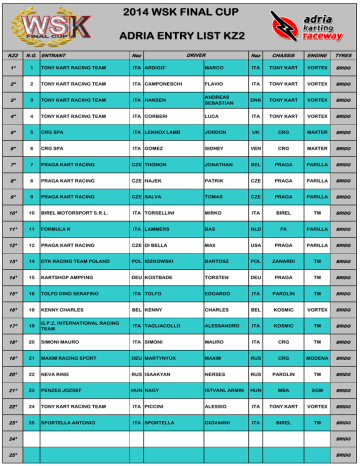 2014 WSK FINAL CUP ADRIA ENTRY LIST KZ2 KZ2 N.G. ENTRANT Naz DRIVER Naz CHASSIS ENGINE TYRES 1° 1 TONY KART RACING TEAM ITA ARDIGO' MARCO ITA TONY KART VORTEX BRIDG 2° 2 TONY KART RACING TEAM ITA CAMPONESCHI FLAVIO ITA TONY KART VORTEX BRIDG 3° 3 TONY KART RACING TEAM ITA HANSEN ANDREAS SEBASTIAN DNK TONY KART VORTEX BRIDG 4° 4 TONY KART RACING TEAM ITA CORBERI LUCA ITA TONY KART VORTEX BRIDG 5° 5 CRG SPA ITA LENNOX LAMB JORDON UK CRG MAXTER BRIDG 6° 6 CRG SPA ITA GOMEZ SIDNEY VEN CRG MAXTER BRIDG 7° 7 PRAGA KART RACING CZE THONON JONATHAN BEL PRAGA PARILLA BRIDG 8° 8 PRAGA KART RACING CZE HAJEK PATRIK CZE PRAGA PARILLA BRIDG 9° 9 PRAGA KART RACING CZE SALVA TOMAS CZE PRAGA PARILLA BRIDG 10° 10 BIREL MOTORSPORT S.R.L. ITA TORSELLINI MIRKO ITA BIREL TM BRIDG 11° 11 FORMULA K ITA LAMMERS BAS NLD FK PARILLA BRIDG 12° 12 PRAGA KART RACING CZE DI BELLA MAX USA PRAGA PARILLA BRIDG 13° 14 DTK RACING TEAM POLAND POL IDZKOWSKI BARTOSZ POL ZANARDI TM BRIDG 14° 15 KARTSHOP AMPFING DEU KOSTBADE TORSTEN DEU PRAGA TM BRIDG 15° 16 TOLFO DINO SERAFINO ITA TOLFO EDOARDO ITA PAROLIN TM BRIDG 16° 18 KENNY CHARLES BEL KENNY CHARLES BEL KOSMIC VORTEX BRIDG 17° 19 G.P.Z. INTERNATIONAL RACING TEAM ITA TAGLIACOLLO ALESSANDRO ITA KOSMIC TM BRIDG 18° 20 SIMONI MAURO ITA SIMONI MAURO ITA CRG TM BRIDG 19° 21 MAXIM RACING SPORT DEU MARTYNYUK MAXIM RUS CRG MODENA BRIDG 20° 22 NEVA RING RUS ISAAKYAN NERSES RUS PAROLIN TM BRIDG 21° 23 PENZES JOZSEF HUN NAGY ISTVANL ARMIN HUN MBA SGM BRIDG 22° 24 TONY KART RACING TEAM ITA PICCINI ALESSIO ITA TONY KART VORTEX BRIDG 23° 25 SPORTELLA ANTONIO ITA SPORTELLA GIOVANNI ITA BIREL TM BRIDG 24° BRIDG 25° BRIDG