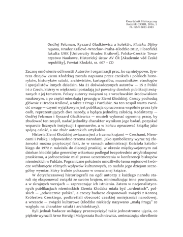 Kwartalnik Historyczny Rocznik CXXIII, 2016, 1 PL ISSN 0023-5903 Ondřej Felcman, Ryszard Gładkiewicz a kolektiv, Kladsko. Dějiny regionu, Hradec Králové–Wrocław–Praha–Kłodzko 2012, Filozofická fakulta UHK [Univerzity Hradec Králové], Polsko-Czeskie Towarzystwo Naukowe, Historický ústav AV ČR [Akademie věd České republiky], Powiat Kłodzki, ss. 607 + CD Zacznę omówienie od kwestii Autorów i organizacji prac, bo są nietypowe. Synteza dziejów Ziemi Kłodzkiej została napisana przez czeskich i polskich historyków, historyków sztuki, archiwistów, kartografów, muzealników, etnologów i specjalistów innych dziedzin. Ma 21 doświadczonych autorów — 15 z Polski i 6 z Czech, którzy w większości posiadają już poważny dorobek publikacji związanych z jej tematem. Polscy autorzy związani są z wrocławskim środowiskiem naukowym, a po części mieszkają i pracują w Ziemi Kłodzkiej. Czescy pochodzą głównie z Hradca Králové, a także z Pragi i Pardubic. Na ten zespół warto zwrócić uwagę — czymś wyjątkowym jest publikacja opracowana wspólnie przez tyle osób, reprezentujących dwa narody, a będąca jednolitą całością. Redaktorzy — Ondřej Felcman i Ryszard Gładkiewicz — musieli wykonać ogromną pracę, by zbudować ten zespół, nadać jednolity charakter wynikom jego badań, pozyskać wsparcie licznych instytucji i sponsorów, a w końcu opracować książkę jako spójną całość, a nie zbiór autorskich artykułów. Historia Ziemi Kłodzkiej związana jest z trzema krajami — Czechami, Niemcami i Polską i odpowiednio trzema narodami. Jako symboliczny wyraz tej złożoności można przytoczyć fakt, że w ramach administracji Kościoła katolickiego do 1972 r. należała do diecezji praskiej, w okresie międzywojennym zaś dziekan kłodzki jako generalny wikariusz podlegał bezpośrednio arcybiskupowi praskiemu, a jednocześnie miał prawo uczestniczenia w konferencji biskupów niemieckich w Fuldzie. Pograniczne położenie umożliwiło temu regionowi twórcze wchłonięcie różnych wpływów kulturowych, co nadało jego dziejom szczególny wymiar, który trafnie pokazano w omawianej książce. W dotychczasowej historiografii na ogół autorzy z każdego narodu starali się eksponować związki ze swoim krajem, minimalizując inne powiązania, a w skrajnych wersjach — zaprzeczając ich istnieniu. Zatem w nacjonalistycznych publikacjach niemieckich Ziemia Kłodzka miała być „urdeutsch”, polskich — „odwiecznie polska”, a czescy badacze eksponowali związki z Koroną Królestwa Czeskiego, podkreślali obecność czeskiej mniejszości narodowej, a wreszcie — związki kulturowe (Kłodzko niekiedy nazywano „małą Pragą” ze względu na charakter sztuki i architektury). Byli jednak badacze usiłujący przezwyciężyć takie jednostronne ujęcia, co pięknie wyrazili Arno Herzig i Małgorzata Ruchniewicz, umieszczając określenie 136 Recenzje „kraj Pana Boga” w tytule swej książki (wyd. Kłodzko 2003). Autorzy omawianej syntezy nie tylko poszli w ich ślady, ale postawili sobie trudne zadanie przedstawienia dziejów regionu w sposób wyważony, z uwzględnieniem rzeczywistego wkładu wszystkich trzech narodów, a zarazem pokazania jego specyfiki. Uczynili to znakomicie: powstało dzieło nowatorskie, a jednocześnie ugruntowane na solidnej bazie źródeł i literatury, starannie wyważające związki Ziemi Kłodzkiej z Czechami, Polską, a także z Prusami/Niemcami. Jak złożone to były relacje, wskazuje choćby taki drobny przykład. W okresie przed I wojną światową żyła tu grupa mieszkańców posługujących się językiem czeskim jako macierzystym — według spisu powszechnego z 1905 r. było to 3258 osób (5,14% ogółu mieszkańców; spisy tego typu, na co wielokrotnie wskazywała polska literatura, nie były w pełni rzetelne). Jednak ku rozczarowaniu czeskich „budzicieli”, pragnących uczynić z nich świadomych Czechów, czuli się oni obywatelami pruskimi, nie mieli odrębnej świadomości narodowej, a na narodowe zachęty odpowiadali „tadyk je to Prajsko” (s. 260, „Prajsko” to w potocznym języku czeskim „Prusy”, w języku literackim — „Prusko”). Wartość książki polega przede wszystkim na tym, że stanowi pierwszą próbę napisania wspólnej syntezy polsko-czeskiej dziejów tej ziemi. Autorzy nie kwestionują istotnej roli Niemców w historii regionu, uwzględniają też w pełnym wymiarze dorobek historiografii niemieckiej, która jest niezwykle obszerna, a zwłaszcza niedawne polsko-niemieckie publikacje z tego zakresu, ale wnoszą nowe spojrzenie, wynikające z uwzględnienia także czeskiej perspektywy, do niedawna słabo obecnej w niemieckich i polskich badaniach. Dotyczy to zarówno wykorzystania imponującego (a do niedawna mało w Polsce znanego) dorobku historiografii czeskiej w tym zakresie, jak i licznych czeskich źródeł, z których wiele było wykorzystywanych we wcześniejszych publikacjach niemieckich i polskich, ale zasób ten został przez Autorów omawianej książki w istotny sposób wzbogacony. W konsekwencji powstała synteza nie tylko dwóch, ale wręcz trzech historiografii. Po Dziejach Ziemi Kłodzkiej Herziga i Ruchniewicz (Hamburg–Wrocław 2006) oraz monografii Františka Musila (Kladsko, Praha 2007) jest to kolejny krok w rozwoju badań, zmierzający do uogólnienia wielonarodowych dziejów. Autorzy stoją na stanowisku, że mimo całej złożoności i zmienności losów Ziemi Kłodzkiej, zwłaszcza mimo niemal całkowitej wymiany ludności po 1945 r., można traktować ją jako specyficzny, jednolity region położony na przecięciu wpływów kulturowych, których wzajemne oddziaływanie przyniosło niezwykle interesujące rezultaty. Ich najnowszym przejawem jest dokonujące się od pewnego czasu odkrywanie lokalnych tradycji przez obecnych polskich mieszkańców, którzy w pierwszych dziesięcioleciach po przybyciu traktowali ni