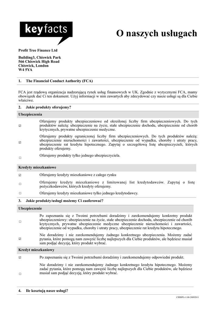 O naszych usługach % Profit Tree Finance Ltd Building3, Chiswick Park 566 Chiswick High Road Chiswick, London W4 5YA 1. The Financial Conduct Authority (FCA) FCA jest rządową organizacja nadzorującą rynek usług finansowych w UK. Zgodnie z wytycznymi FCA, mamy obowiązek dać Ci ten dokument. Użyj informacji w nim zawartych aby zdecydować czy nasze usługi są dla Ciebie właściwe. 2. Jakie produkty oferujemy? Ubezpieczenia ☑ Oferujemy produkty ubezpieczeniowe od określonej liczby firm ubezpieczeniowych. Do tych produktów należą: ubezpieczenie na życie, stałe ubezpieczenie dochodu, ubezpieczenie od chorób krytycznych, prywatne ubezpieczenie medyczne. ☑ Oferujemy produkty ograniczonej liczby firm ubezpieczeniowych. Do tych produktów należą: ubezpieczenie nieruchomości i zawartości, ubezpieczenie od wypadku, choroby i utraty pracy, ubezpieczenie rat kredytu hipotecznego. Zapytaj o szczegółową listę ubezpieczycieli, których produkty oferujemy. Oferujemy produkty tylko jednego ubezpieczyciela. Kredyty mieszkaniowe ☑ Oferujemy kredyty mieszkaniowe z całego rynku Oferujemy kredyty mieszkaniowe z limitowanej list kredytodawców. Zapytaj o listę pożyczkodawców, których kredyty oferujemy. Oferujemy kredyty mieszkaniowe tylko jednego kredytodawcy. 3. Jakie produkty/usługi możemy Ci zaoferować? Ubezpieczenie Po zapoznaniu się z Twoimi potrzebami doradzimy i zarekomendujemy konkretny produkt ubezpieczeniowy: ubezpieczenie na życie, stałe ubezpieczenie dochodu, ubezpieczenie od chorób krytycznych, prywatne ubezpieczenie medyczne ubezpieczenie nieruchomości i zawartości, ubezpieczenie od wypadku, choroby i utraty pracy, ubezpieczenie rat kredytu hipotecznego. ☑ Nie doradzimy i nie zarekomendujemy żadnego konkretnego ubezpieczenia. Możemy zadać pytania, które pomogą nam zawęzić liczbę najlepszych dla Ciebie produktów, ale będziesz musiał sam podjąć decyzję, który produkt wybrać. Kredyt mieszkaniowy ☑ Po zapoznaniu się z Twoimi potrzebami doradzimy i zarekomendujemy odpowiedni produkt. Nie doradzimy i nie zarekomendujemy żadnego konkretnego kredytu hipotecznego. Możemy zadać pytania, które pomogą nam zawęzić liczbę najlepszych dla Ciebie produktów, ale będziesz musiał sam podjąć decyzję, który produkt wybrać. 4. Ile kosztują nasze usługi? CIDDPLv1.00-20092011 Ubezpieczenie Opłata w wysokości £ za poradę I obsługe ubezpieczeń na życie, od chorób krytycznych, domu, niezdolności do pracy etc. ☑ Brak opłat Otrzymasz wycene która pokaże Ci o innych opłatach związanych z polisą ubezpieczeniową. Kredyt mieszkaniowy ☑ Opłata w wysokości 1.5% kwoty udzielonego kredytu mieszkaniowego, płatna w momencie finalizacji zakupu. Dla przykładu, dla kredytu mieszkaniowego w wysokości £100,000, opłata w wysokości 1.5% wyniesie £1500. Opłata za ten sam kredyt, gdy wysokość opłaty wynosi 1%, kwota do zapłaty wyniesie £1,000. Jeśli wybierzesz tą opcje zwrócimy Ci wszystkie prowizje uzyskane od kredytodawcy. ☑ Opłata w wysokości 1.0% kwoty udzielonego kredytu mieszkaniowego, płatna w momencie finalizacji zakupu. Dla przykładu, dla kredytu mieszkaniowego w wysokości £100,000, opłata w wysokości 1% wyniesie £1000. Jeśli wybierzesz tą opcje zatrzymamy dla siebie prowizje uzyskane od kredytodawcy Opłata w wysokości £ płatna w momencie zlożenia aplikacji. Opłata w wysokości £ minimum (jeśli masz dobrą zdolność kredytową) lub of £ (jeśli masz niedoskonałą zdolność kredytową) , płatna w momencie złożenia aplikacji o kredyt mieszkaniowy. Nasze standardowe warunki obsługi będa dotyczyły tej transakcji. Brak opłat. Otrzymamy prowizje od kredytodawcy. Otrzymasz ‘key facts illustration’ jak będziesz zainteresowany ubieganiem się o konkretny kredyt hipoteczny. Ten dokument potwierdzi wszystkie opłaty związane z kredytem. Zwrot opłat. Jeśli pobierzemy opłate z góry a transakcja nie zostanie sfinalizowana, wtedy: Otrzymasz zwrot opłat w całości. Otrzymasz zwrot £ ☑ 5. jeśli transakcja nie zostanie sfinalizowana. Brak zwrotu. Kto nas reguluje? Profit Tree Finance Ltd jest autoryzowane i regulowane przez Financial Conduct Authority. Nasz numer w rejestrze FCA to 553266. Mamy pozwolenie na udzielanie porad oraz występowanie w imieniu klienta o kredyty mieszkaniowe oraz nieinwestycyjne produkty ubezpieczeniowe. Rejestr autoryzowanych firm możesz sprawdzić online na www.fsa.gov.uk/register lub dzwoniąc do FCA na numer 0845 606 1234. 6. Co zrobić jeśli chcesz złożyć skarge? Jeśli chcesz złożyć skargę skontaktuj sie najpierw z nami: - Pisemnie: Compliance Officer, Profit Tree Finance Ltd, Building3, Chiswick Park, 566 Chiswick High Road, Chiswick London, W4 5Y Telefonicznie: 02071833604. Jeśli nie będziemy w stanie osiągnąc porozumienia, możesz być uprawniony do złożenia skargi do Financial Ombudsman Service. 7. Czy obejmuje nas gwarancja Financial Services Compensation Scheme (FSCS)? Jesteśmy objęci przez gwarancje FSCS. Możesz być uprawniony do otrzymania rekompensaty jeśli nie będziemy w stanie zaspokoić Twoich roszczeń. To zależy do rodzaju produktu i okoliczności. Ubezpieczenie Porady ubezpieczeniowe są gwarantowane do 90% bez limitu Kredyt mieszkaniowy Kredyty mieszkaniowe sa gwarantowane do 100% lub £50,000 Dalsze informacje dotyczące gwarancji FSCS są dostępne na stronie FSCS. CIDDPLv1.00-20092011