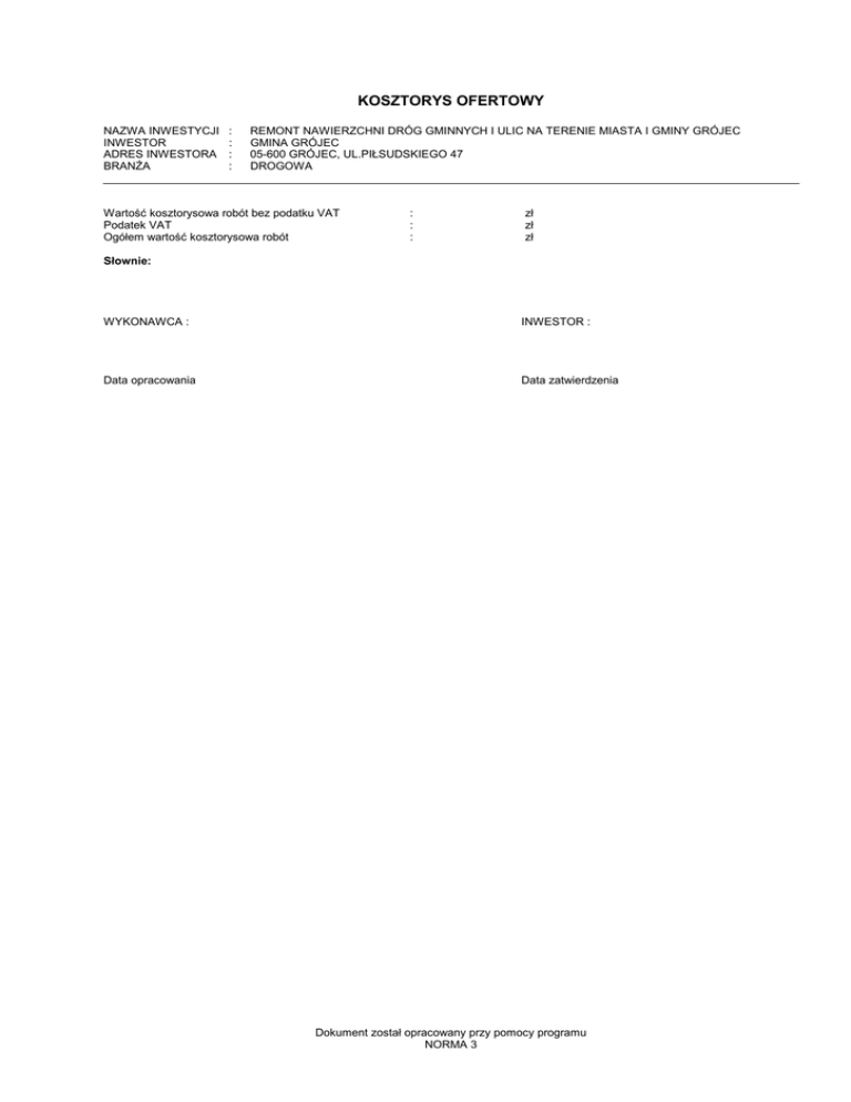 KOSZTORYS OFERTOWY NAZWA INWESTYCJI INWESTOR ADRES INWESTORA BRANŻA : : : : REMONT NAWIERZCHNI DRÓG GMINNYCH I ULIC NA TERENIE MIASTA I GMINY GRÓJEC GMINA GRÓJEC 05-600 GRÓJEC, UL.PIŁSUDSKIEGO 47 DROGOWA Wartość kosztorysowa robót bez podatku VAT Podatek VAT Ogółem wartość kosztorysowa robót : : : zł zł zł Słownie: WYKONAWCA : INWESTOR : Data opracowania Data zatwierdzenia Dokument został opracowany przy pomocy programu NORMA 3 remonty nawierzchni Lp. Podstawa 1 KNNR 6 010701 2 KNNR 6 110801 3 KNNR 6 110802 4 KNNR 6 110802 5 KNR AT-03 0102-01 6 KNR 2-31 140604 7 KNR 2-31 140602 8 KNR 2-31 140603 9 KNNR 4 142103 + KNR 2-31 1406-03 10 KNNR 4 022705 + KNR 2-31 1406-03 11 KNR 2-31 100407 12 KNNR 6 010802 analogia 13 KNNR 6 110703 analogia 14 KNNR 6 110901 15 KNNR 6 110902 16 KNNR 6 110903 17 KNNR 6 110902 analogia 18 KNNR 6 100506 19 KNNR 6 100201 20 KNNR 6 100202 21 KNNR 6 130105 KOSZTORYS Opis Jedn.obm. Wyrównanie istniejącej podbudowy tłuczniem kamiennym m3 sortowanym, kwarcytowym lub dolomitowym o frakcji 0/31, 5mm, zagęszczanym mechanicznie o gr. do 10 cm Remonty cząstkowe nawierzchni bitumicznych mieszanka- m2 mi mineralno-asfaltowymi, AC 11S dla KR2, z frezowaniem - grub.4cm Remonty cząstkowe nawierzchni bitumicznych mieszanka- m2 mi mineralno-asfaltowymi, AC 11S dla KR2, z obcinaniem krawędzi mechanicznie - grub.5cm Remonty cząstkowe nawierzchni bitumicznych mieszanka- m2 mi mineralno-asfaltowymi, AC 11S dla KR2, z obcinaniem krawędzi mechanicznie - grub. 6cm Roboty remontowe - frezowanie nawierzchni bitumicznej o m2 gr. do 4 cm z wywozem materiału z rozbiórki na odl. do 2 km z wbudowaniem w pobocza i zagęszczeniem Regulacja pionowa studzienek dla zaworów wodociągo- szt. wych i gazowych betonem B-15 Regulacja pionowa studzienek dla kratek ściekowych ulicz-szt. nych cegłą kanalizacyjną i betonem B-15 Regulacja pionowa studzienek dla włazów kanałowych ceg-szt. łą kanalizacyjną i betonem B-15 na istniejących płytach przejściowych Płyty żelbetowe przejściowe na studniach o śr.1400/600 kpl. mm - wymiana uszkodzonych wraz z regulacją studni Ilość Cena jedn. 20.00 1500.00 1200.00 500.00 500.00 10.00 10.00 10.00 5.00 Włazy kanałowe żeliwne okrągłe typu ciężkiego kl.D (40 t) szt. - wymiana uszkodzonych wraz z regulacją pionową studni 5.00 Skropienie istniejącej nawierzchni, podbudowy, emulsją as-m2 faltową w ilości 0,4kg/m2 Wykonanie nawierzchni z mieszanki minerano-bitumicznej t asfaltowej AC 11 S, w ilości 100kg/m2 (4cm) dla KR2 , mechaniczne - większe powierzchnie remontów - wykonywane układarką Remont interwencyjny niebezpiecznych ubytków w nawie- t rzchni, mieszankami na "zimno" 500.00 Remonty cząstkowe nawierzchni powierzchniowo utrwalo- m2 nych przy pomocy grysów kamiennych kwarcytowych lub dolomitowych, remonterem ciśnieniowym - rakowizny Remonty cząstkowe nawierzchni powierzchniowo utrwalo- m2 nych przy pomocy grysów kamiennych kwarcytowych lub dolomitowych, remonterem ciśnieniowym - wyboje o głębokości do 2 cm Remonty cząstkowe nawierzchni powierzchniowo utrwalo- m2 nych przy pomocy grysów kamiennych kwarcytowych lub dolomitowych, remonterem ciśnieniowym - wyboje o głębokości 2.0 cm i powyżej Remonty cząstkowe nawierzchni powierzchniowo utrwalo- m nych - wypełnienie asfaltem D 160/220 i zasypanie grysem bazaltowym o frakcji 0/4mm - spękań podłużnych i poprzecznych oraz spękań przy studzienkach kanalizacyjnych, na szerokości 0,10m - z pielęgnacją poprzez posypywanie grysem w okresie "pocenia" Oczyszczenie mechaniczne nawierzchni drogowych bitumi-m2 cznych Powierzchniowe utrwalanie nawierzchni drogowych emul- m2 sją asfaltową i grysem kamiennym bazaltowym o wym. 25 mm w ilości 8 dm3/m2 - kombajnem Powierzchniowe utrwalanie nawierzchni drogowych emul- m2 sją asfaltową i grysem kamiennym bazaltowym o wym. 58 mm w ilości 10 dm3/m2 - kombajnem Plantowanie poboczy wykonywane mechanicznie przy gru- m2 bości ścinania 10 cm z odwozem nadmiaru gruntu na odl. 2km 400.00 -2- Norma 3.12 Licencja: 12280 dla P.U. DRO-MAR 50.00 2.00 500.00 200.00 2000.00 500.00 500.00 500.00 500.00 Wartość remonty nawierzchni PODSUMOWANIE CAŁY KOSZTORYS RAZEM RAZEM Koszty pośrednie [Kp] od (R, S) RAZEM Zysk [Z] od (R+Kp(R), M, S+Kp(S)) RAZEM VAT [V] od (Σ(R+Kp(R)+Z(R), M+Z(M), S+Kp(S)+Z(S))) RAZEM OGÓŁEM Słownie: -3- Norma 3.12 Licencja: 12280 dla P.U. DRO-MAR
