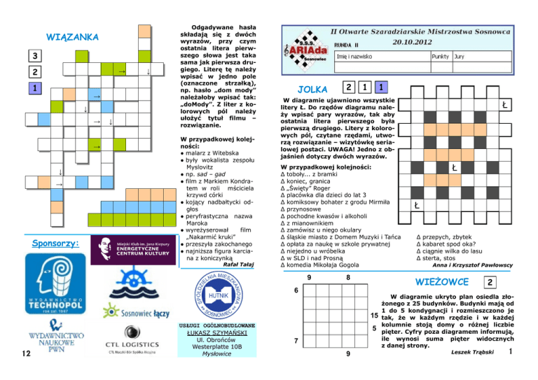 WIĄZANKA 3 2 → 1 → ↓ → → ↓ → Sponsorzy: ↓ ↓ Odgadywane hasła składają się z dwóch wyrazów, przy czym ostatnia litera pierwszego słowa jest taka sama jak pierwsza drugiego. Literę tę należy wpisać w jedno pole (oznaczone strzałką), np. hasło „dom mody” należałoby wpisać tak: „doMody”. Z liter z kolorowych pól należy ułożyć tytuł filmu – rozwiązanie. W przypadkowej kolejności: ● malarz z Witebska ● były wokalista zespołu Myslovitz ● np. sad – gad ● film z Markiem Kondratem w roli mściciela krzywd córki ● kojący nadbałtycki odgłos ● peryfrastyczna nazwa Maroka ● wyreżyserował film „Nakarmić kruki” ● przeszyła zakochanego ● najniższa figura karciana z koniczynką Rafał Tałaj JOLKA 2 1 1 W diagramie ujawniono wszystkie litery Ł. Do rzędów diagramu należy wpisać pary wyrazów, tak aby ostatnia litera pierwszego była pierwszą drugiego. Litery z kolorowych pól, czytane rzędami, utworzą rozwiązanie – wizytówkę serialowej postaci. UWAGA! Jedno z objaśnień dotyczy dwóch wyrazów. W przypadkowej kolejności: ∆ toboły... z bramki ∆ koniec, granica ∆ „Święty” Roger ∆ placówka dla dzieci do lat 3 ∆ komiksowy bohater z grodu Mirmiła ∆ przynosowe ∆ pochodne kwasów i alkoholi ∆ z mianownikiem ∆ zamówisz u niego okulary ∆ śląskie miasto z Domem Muzyki i Tańca ∆ opłata za naukę w szkole prywatnej ∆ niejedno u wróbelka ∆ w SLD i nad Prosną ∆ komedia Mikołaja Gogola 9 8 15 12 5 7 9 Ł Ł ∆ ∆ ∆ ∆ przepych, zbytek kabaret spod oka? ciągnie wilka do lasu sterta, stos Anna i Krzysztof Pawłowscy WIEŻOWCE 6 USŁUGI OGÓLNOBUDLOWANE ŁUKASZ SZYMAŃSKI Ul. Obrońców Westerplatte 10B Mysłowice Ł 2 W diagramie ukryto plan osiedla złożonego z 25 budynków. Budynki mają od 1 do 5 kondygnacji i rozmieszczono je tak, że w każdym rzędzie i w każdej kolumnie stoją domy o różnej liczbie pięter. Cyfry poza diagramem informują, ile wynosi suma pięter widocznych z danej strony. Leszek Trąbski 1 ANAGRAMY Z KONTEKSTU 2 WEDŁUG MAŁEGO JASIA 1 3 4 5 5 5 6 2 4 3 3 4 6 7 8 4 7 5 1 9 10 3 8 11 12 9 13 14 15 16 Do diagramu należy wpisać dwuwyrazowe nazwy geograficzne (jedna w pisowni oryginalnej) ułożone z liter wyrazu brakującego w tekście. Poziomo: 3) Odwiedziliśmy wiele ..., zanim zdecydowaliśmy się na kupno auta 6) Stojąc na tarasie widokowym, ... się przepięknymi górskimi krajobrazami. 7) Reformy ... prof. Balcerowicza spowodowały rozwarstwienie społeczne. 8) Im bliżej niemieckiej granicy, tym więcej na straganach ... ogrodowych. 9) Siedzieli w poczekalni przy ułożonych na podłodze ... . Pionowo: 1) ... przez niego statki zawsze były na właściwym kursie. 2) Oficyna wydała ... wierszy poetów, uczestników wojny. 3) ... na stadion alkohol musieli liczyć się z surowymi restrykcjami. 4) Poszedł do biblioteki po „Przedwiośnie” ... Żeromskiego. 5) Dałem mu w prezencie „Ballady i ...” Adama Mickiewicza. Stanisław Osyda Z AUTU 2 W diagramie należy rozmieścić litery, tak aby w każdym rzędzie i kolumnie znalazły się litery A, B, C, D oraz jedno pole puste. Liczby na marginesie wskazują, która litera występuje z danej strony pierwsza. UWAGA! Puste pola nie mogą się ze sobą stykać narożnikami. 2 C B D D 17 18 19 Do diagramu należy wpisać hasła, które objaśnił mały Jasio. Poziomo: Pionowo: 2) częsty bywalec galerii handlowych. 1) ogólna wesołość w stajni. 5) muzeum portretów. 2) krzyżówka lubiąca chlapać się 7) członek załogi łodzi wioślarskiej. w wodzie. 9) oznaczony tor wodny. 3) wesoły człowiek. 11) kredka do podkreślania oprawy oczu. 4) iskiereczka. 12) samica ssaka z kolcami. 5) producentka zwierciadeł. 14) ryby i owoce morza. 6) osadzony w więzieniu. 15) lubią się wygłupiać. 8) raczenie się młodym winem. 17) kolega po fachu ludwisarza. 10) skonsumowała wszystkie zapasy. 18) ostatni rozdział książki; epilog. 13) koń ciągnący pług. 19) krótka wizyta u znajomych. 16) sprzeciwia się wszystkim. Małgorzata Wołc C A A Leszek Trąbski D B KALAMBUR W Tygrysie puma, czy ona też kuma? 1 Małgorzata Wołc 11 POŁĄCZ W PARY JOLKA W diagramie ujawniono wszystkie litery L i W. Podane wyrazy (z grupy A i z grupy B) należy połączyć w takie pary, aby przez zamianę ich pierwszych liter na inną, jednakową dla obu słów, powstały wyrazy wpisywane do diagramu (jeden w liczbie mnogiej), np. ara + łuska = krakuska. W 3 2 L W Małgorzata Wołc Grupa A: cez, depo, estron, kwoc, loko, Mali, Nowe, Po, Re, żar Grupa B: czystka, fant, grody, haki, lufar, łożnica, nuta, staż, ubranie, żak UŁÓŻ SAM 4 3 2 Litery alfabetu (wszystkie występują w diagramie) podzielono na osiem zestawów 4-literowych. Liczby w kratkach informują, w którym zestawie znajduje się szukana litera. Wszystkie wyrazy są rzeczownikami pisanymi małą literą (jeden w lm). Litery z kolorowych pól, czytane kolumnami, utworzą rozwiązanie.Rafał Tałaj 1) A, Ą, B, C. 5) M, N, Ń, O. 2) Ć, D, E, Ę. 6) Ó, P, R, S. 6 6 10 8) Y, Z, Ź, Ż. 7 6 6 4 6 5 2 4 1 8 1 8 7 3 1 2 2 4 4 1 4 3 5 3 5 7 2 5 2 5 5 5 4 1 5 5 6 8 1 6 4 7 2 3 2 6 8 7 5 1 6 4 1 7 5 8 4 5 8 2 2 1 2 5 8 6 7 5 6 6 7 2 7 7 2 4 8 3 3 1 1 8 1 6 2 6 7 6 3 7 2 1 8 3) F, G, H, I. 7) Ś, T, U, W. 4) J, K, L, Ł. 7 4 5 7 1 3 4 1 1 1 Ujawniono jedyną literę U. W niektóre niekrzyżujące się pola należy wpisać dwie litery, które (czytane rzędami) utworzą rozwiązanie. U W przypadkowej kolejności: ● antek, ziółko, ananas ● wyszło z worka (w powiedzeniu) ● połykał swoje dzieci (mit. gr.) ● ciężkości lub dopingujący ● uparty ssak ● wydawca, np. książek ● Adolf, aktor (słynny Dodek) ● kąt między północą a obranym kierunkiem UKRYTE SLOWKA Anna i Krzysztof Pawłowscy Poziomo: 1) noga – kolano, ręka – ? 6) baranek na niebie. W odgadniętych wyrazach należy odnaleźć 7) niemowlaka – w wanience. ukry