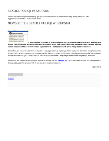 SZKOŁA POLICJI W SŁUPSKU Źródło: http://www.slupsk.szkolapolicji.gov.pl/sps/aktualnosci/70108,Newsletter-Szkoly-Policji-w-Slupsku.html Wygenerowano: Środa, 1 marca 2017, 20:42 NEWSLETTER SZKOŁY POLICJI W SŁUPSKU Z niekłamaną satysfakcją informujemy o uruchomieniu elektronicznego Newslettera Szkoły Policji Słupsku. Jesteśmy pierwszą z polskich szkół policyjnych, która za pośrednictwem takiego właśnie kanału chce dodatkowo informować o wydarzeniach i podejmowanych przez nas przedsięwzięciach. Newsletter jest naszym autorskim pomysłem, a do jego realizacji wykorzystaliśmy wyłącznie darmowe oprogramowanie. System, który wykorzystujemy nie dołącza również żadnych reklam. Informacje, które będziemy przesyłać to w głównej mierze aktualności z życia Szkoły. Będą to krótkie zajawki tekstowe z dołączonym odnośnikiem do pełnego materiału. Aby wpisać się na listę subskrypcyjną wystarczy kliknąć na link ZAPISZ SIĘ. W każdej chwili można też zrezygnować z dalszej subskrypcji lub przesłać link do zapisania się kolejnym osobom. (12.7.2012) Ocena: 0/5 (0) Tweetnij