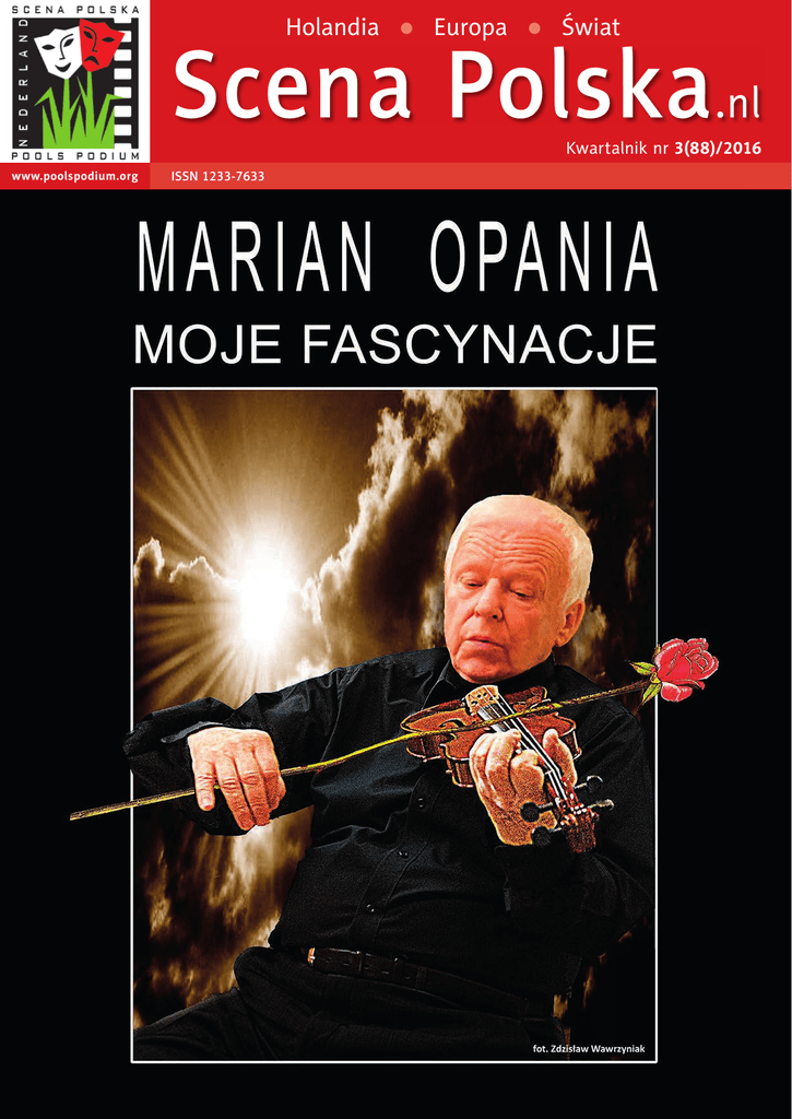 Holandia ● Europa ● Świat Scena Polska.nl Kwartalnik nr 3(88)/2016 www.poolspodium.org ISSN 1233-7633 ISSN 1233-7633 Cena: 2 EURO Od redakcji www.poolspodium.org Zofia Schroten-Czerniejewicz Redaktor Naczelna Drodzy Czytelnicy, Nie do wiary, ale to wydanie naszego pisma nosi numer 88. Podzielone przez 4 numery w roku daje nam 22 lata! Przyjmując, że nasz najmłodszy czytelnik pierwszego wydania miał 14 lat to dzisiaj ma juz prawie czterdziestkę. A docierają do mnie informacje, że czytają nas współczesne dwudziestolatki. O górnej grani- cy wieku nie wspomnę, bo ktoś kto trafi do naszego grona to pozostaje z nami już na zawsze. Co zatem łączy naszych Czytelników? Oczywiście język polski i najczęściej zamieszkanie poza granicami Polski. W tym numerze dzielimy się także wiadomościami z Holandii, Belgii, Australii i z Polski. Może Państwa zdumiewać ilość materiałów o Kresach, ale byłam w ostatnim czasie obecna na imprezach poświęconych temu właśnie tematowi, który wywarł na mnie duże wrażenie. Opisami tych imprez i refleksjami dzielę się na łamach tego wydania z Państwem. Scena Polska stara się sprowadzić jeden z najnowszych filmów, ale przed pokazami za granicą, filmy te mają pierwszeństwo projekcji na najważniejszych, międzynarodowych festiwalach m.in. w Rotterdamie i w Berlinie. Gdy tylko uzyskamy zgodę na sprowadzenie filmu do Holandii, zaprosimy Państwo informując na naszej stronie www.poolspodium.org i na facebooku www.facebook.com/scenapolska. W najbliższym czasie zapraszam na kolejne spotkanie w Teatrze Bez Granic, a gościem Sceny Polskiej w Holandii będzie tym razem znakomity aktor Marian Opania. W niedzielę 27 listopada aktor wystąpi dla Państwa w Utrechcie. Więcej informacji wewnątrz numeru. Miłej lektury. Zapraszamy na naszą stronę www.poolspodium.org SCENA POLSKA | Kwartalnik, nr 3(88)/2016 | ISSN 1233-7633 REDAKCJA: Zofia Schroten-Czerniejewicz i zespół. WYDAWCA: Stichting Pools Podium, Tel. 31 (0) 30 2718296, e-mail: [email protected] Stichting Pools Podium, ABN AMRO Utrecht, IBAN: NL85 ABNA0 518544443. www.poolspodium.org ZDJĘCIA: Archiwum SPP SKŁAD KOMPUTEROWY: Mariusz Mamet | Mac Map OKŁADKA: Marian Opania – fot. Zdzisław Wawrzyniak Projekt jest współfinansowany w ramach funduszy polonijnych Ministerstwa Spraw Zagranicznych Rzeczypospolitej Polskiej. Scena Polska | nr 3(88) 2016 3 Teatr www.poolspodium.org Marian Opania „Moje Fascynacje” mieckie, rosyjskie, np. „W muzeum” Michaiła Żwanieckiego” w tłum. Jana Pietrzaka. Śpiewam też w tym koncercie piosenki Jacquesa Brela, pieśni Bułata Okudżawy, W. Wysockiego, Wojciecha Młynarskiego, Jana Wołka czy Jerzego Satanowskiego. A więc nieśmiało zapraszam Państwa na mój występ. Nie zanudzicie się i każdy z widzów znajdzie coś dla siebie. Do zobaczenia Marian Opania P opularny aktor i artysta kabaretowy prezentuje recital, o którym sam mówi: Mam nadzieję, że trochę mnie Państwo znacie a więc nie muszę za dużo o sobie opowiadać. Jak wiecie zajmuję się również estradą. Skąd ten nieskromny tytuł „Moje fascynacje? Ano stąd, że ten recital to różnorodny koktajl ulubionych utworów, które w trakcie mojego życia najbardziej mnie zafascynowały, a więc: najcelniejsze monologi pióra Antoniego Słonimskiego, tzw. szmoncesy. Również nieco frywolne teksty Marcina Wolskiego, zagraniczne teksty, nie- Wojciech Kaleta – kompozytor muzyki do spektakli teatralnych i widowisk telewizyjnych. Pools Podium - Scena Polska w Holandii zaprasza do teatru na: „Moje fascynacje” w recitalu teatralnym wystąpią Marian Opania oraz Wojciech Kaleta – akompaniament niedziela 27.11.2016 / godz. 19:00 Teatr Kikker w Utrechcie Ganzenmarkt 14, 3512 GD, Utrecht Bilety z rezerwacją 25 € (ilość miejsc ograniczona) (odbiór przy wejściu przed spektaklem) Informacja & rezerwacja: mail: [email protected], tel: +31 30 2718296, +31 621 564 177, www.poolspodium.org Konto: IBAN NL85 ABNA 0518544443 / Stichting Pools Podium 4 Scena Polska | nr 3(88) 2016 Pools Podium - Scena Polska w Holandii zaprasza do teatru na: Polonica www.poolspodium.org „Mówię po polsku” – “Ik spreek Pools” A kcja, powstała z inicjatywy Ambasady RP w Hadze, ma na celu popularyzowanie języka polskiego wśród Holendrów, ale również zachęcenie młodego pokolenia Polaków przyjeżdżających do Holandii, by kontynuowali naukę języka ojczystego i utrzymali polską przynależność kulturową. Bądź dumny, że mówisz po polsku! Wees trots dat je Pools spreekt! [email protected] Galeria polskojęzycznych Holendrów W łaściwie to od początku wydawania „Sceny Polskiej” miałam taki zamiar, pochwalić się znajomymi Holendrami władajacymi językiem polskim. Czynię to teraz i jako pierwszą przedstawiam Lisettę Stembor. Lisettę poznałam, pod koniec lat 70tych, przez jej książkę. Mój przyszły mąż ofiarował mi rozmówki polsko-holenderskie z 1976 roku, autorka Lisetta Stembor. Jak miło było mi, gdy po pierwszym przedstawieniu zorganizowanym przez Scenę Polską w Holandii, podeszła do mnie Lisetta. To było dla mnie niezwykłe spotkanie. Później spotykałyśmy się na wszystkich imprezach związanych z Polską. Lisetta była wszędzie tam, gdzie słychać było polską mowę. Jest autorką podręczników do nauki języka niderlandzkiego. Ma też zasługi dla polskiego teatru. Przed sprowadzeniem przez Scenę Polską, w 1992 roku do Holandii, polskiego spektaklu, Lisetta Stembor, współpracując z teatrem Jana Machulskiego, prezentowała Holendrom polską dramaturgię. Po polskim przedstawieniu, na scenie pojawiali się aktorzy amatorzy odgrywając tę samą sztukę po niderlandzku. Lisetta Stembor zasługuje na nasz duży szacunek. Zofia Schroten-Czerniejewicz Lisetta Stembor tłumaczka polskich dzieł literackich na język niderlandzki. Przetłumaczyła książki takich autorów jak: Jerzy Andrzejewski, Stanisław Lem, Cze
