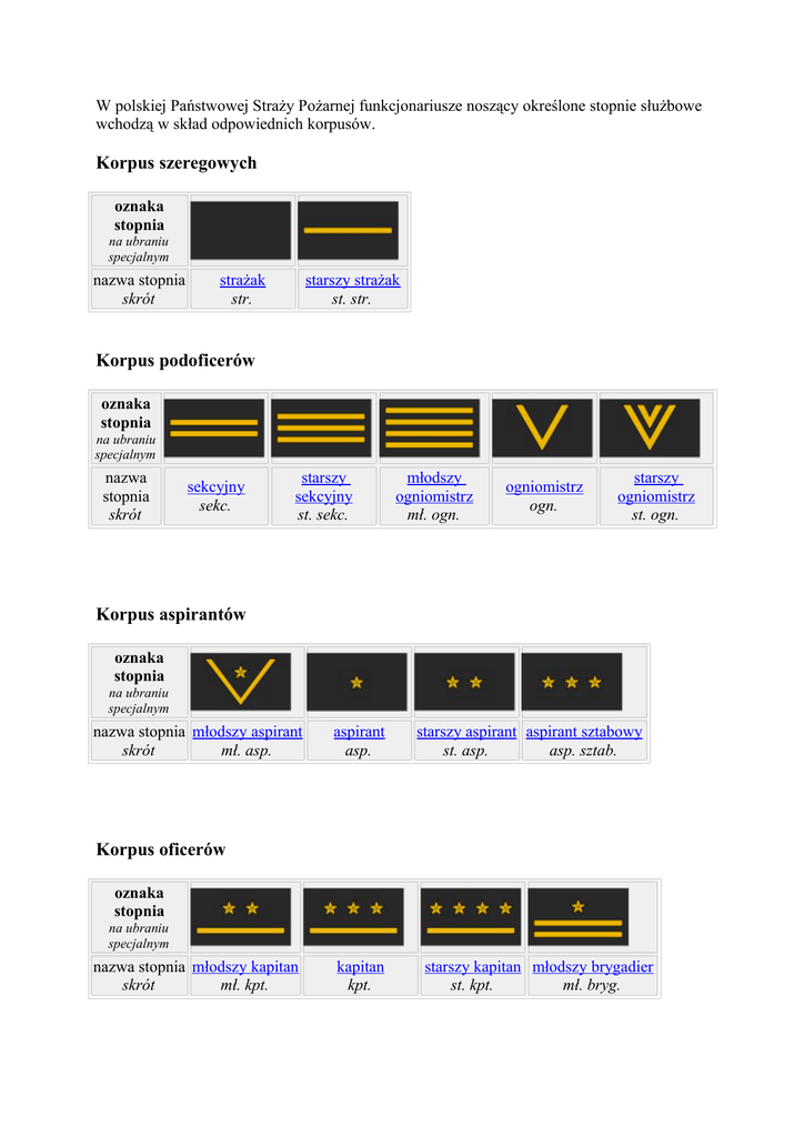 W polskiej Państwowej Straży Pożarnej funkcjonariusze noszący określone stopnie służbowe wchodzą w skład odpowiednich korpusów. Korpus szeregowych oznaka stopnia na ubraniu specjalnym nazwa stopnia skrót strażak str. starszy strażak st. str. Korpus podoficerów oznaka stopnia na ubraniu specjalnym nazwa stopnia skrót sekcyjny sekc. starszy sekcyjny st. sekc. młodszy ogniomistrz mł. ogn. ogniomistrz ogn. starszy ogniomistrz st. ogn. Korpus aspirantów oznaka stopnia na ubraniu specjalnym nazwa stopnia młodszy aspirant skrót mł. asp. aspirant asp. starszy aspirant aspirant sztabowy st. asp. asp. sztab. Korpus oficerów oznaka stopnia na ubraniu specjalnym nazwa stopnia młodszy kapitan skrót mł. kpt. kapitan kpt. starszy kapitan młodszy brygadier st. kpt. mł. bryg. oznaka stopnia na ubraniu specjalnym nazwa stopnia skrót brygadier bryg. starszy brygadier nadbrygadier st. bryg. nadbryg. generał brygadier gen. bryg. Stopnie członków OSP: • • • • • • strażak starszy strażak dowódca roty dowódca sekcji pomocnik dowódcy plutonu dowódca plutonu Stopnie funkcyjnych zarządu OSP: • • • • • członek zarządu członek komisji rewizyjnej zastępca naczelnika wiceprezes naczelnik prezes Stopnie komisji rewizyjnej OSP • • członek komisji rewizyjnej OSP przewodniczący komisji rewizyjnej OSP Ochotnicza Straż Pożarna dystynkcja nazwa stopnia strażak starszy strażak dowódca roty pomocnik dowódcy sekcji dowódca sekcji dystynkcja nazwa stopnia pomocnik dowódcy plutonu dowódca plutonu członek zarządu wiceprezes naczelnik przewodniczący komisji rewizyjnej prezes członek komisji rewizyjnej zastępca naczelnika dystynkcja nazwa stopnia [edytuj] Oddział Gminny ZOSP RP, Oddział Miejski ZOSP RP, Oddział Miejsko-Gminny ZOSP RP dystynkcja nazwa stopnia członek zarządu członek komisji rewizyjnej członek prezydium zarządu prezes kapelan gminny dystynkcja przewodniczący nazwa stopnia komisji rewizyjnej [edytuj] Oddział Powiatowy ZOSP RP wiceprezes zarządu komendant gminny dystynkcja nazwa stopnia członek zarządu członek komisji rewizyjnej członek prezydium zarządu wiceprzewodniczący komisji rewizyjnej wiceprezes zarządu prezes zarządu kapelan powiatowy dystynkcja nazwa stopnia przewodniczący komisji rewizyjnej [edytuj] Oddział Wojewódzki ZOSP RP dystynkcja nazwa stopnia członek zarządu członek komisji rewizyjnej członek sądu honorowego członek prezydium zarządu dystynkcja nazwa stopnia wiceprzewodniczący wiceprzewodniczący przewodniczący przewodniczący komisji rewizyjnej sądu honorowego komisji rewizyjnej sądu honorowego dystynkcja nazwa stopnia wiceprezes zarządu prezes zarządu kapelan wojewódzki [edytuj] Zarząd Główny ZOSP RP dystynkcja nazwa stopnia członek zarządu członek członek członek komisji rewizyjnej sądu honorowego prezydium zarządu dystynkcja nazwa stopnia wiceprzewodniczący przewodniczący wiceprzewodniczący przewodniczący komisji komisji sądu honorowego sądu honorowego rewizyjnej rewizyjnej dystynkcja nazwa stopnia wiceprezes zarządu prezes zarządu głównego kapelan krajowy