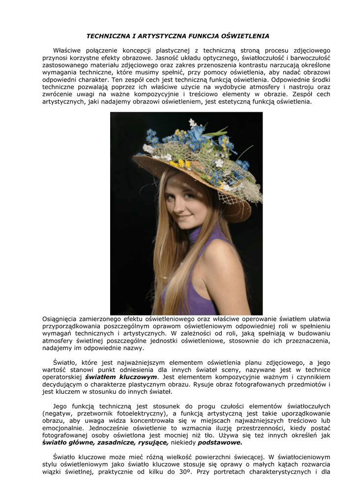 TECHNICZNA I ARTYSTYCZNA FUNKCJA OŚWIETLENIA Właściwe połączenie koncepcji plastycznej z techniczną stroną procesu zdjęciowego przynosi korzystne efekty obrazowe. Jasność układu optycznego, światłoczułość i barwoczułość zastosowanego materiału zdjęciowego oraz zakres przenoszenia kontrastu narzucają określone wymagania techniczne, które musimy spełnić, przy pomocy oświetlenia, aby nadać obrazowi odpowiedni charakter. Ten zespół cech jest techniczną funkcją oświetlenia. Odpowiednie środki techniczne pozwalają poprzez ich właściwe użycie na wydobycie atmosfery i nastroju oraz zwrócenie uwagi na ważne kompozycyjnie i treściowo elementy w obrazie. Zespół cech artystycznych, jaki nadajemy obrazowi oświetleniem, jest estetyczną funkcją oświetlenia. Osiągnięcia zamierzonego efektu oświetleniowego oraz właściwe operowanie światłem ułatwia przyporządkowania poszczególnym oprawom oświetleniowym odpowiedniej roli w spełnieniu wymagań technicznych i artystycznych. W zależności od roli, jaką spełniają w budowaniu atmosfery świetlnej poszczególne jednostki oświetleniowe, stosownie do ich przeznaczenia, nadajemy im odpowiednie nazwy. Światło, które jest najważniejszym elementem oświetlenia planu zdjęciowego, a jego wartość stanowi punkt odniesienia dla innych świateł sceny, nazywane jest w technice operatorskiej światłem kluczowym. Jest elementem kompozycyjnie ważnym i czynnikiem decydującym o charakterze plastycznym obrazu. Rysuje obraz fotografowanych przedmiotów i jest kluczem w stosunku do innych świateł. Jego funkcją techniczną jest stosunek do progu czułości elementów światłoczułych (negatyw, przetwornik fotoelektryczny), a funkcją artystyczną jest takie uporządkowanie obrazu, aby uwaga widza koncentrowała się w miejscach najważniejszych treściowo lub emocjonalnie. Jednocześnie oświetlenie to wzmacnia iluzję przestrzenności, kiedy postać fotografowanej osoby oświetlona jest mocniej niż tło. Używa się też innych określeń jak światło główne, zasadnicze, rysujące, niekiedy podstawowe. Światło kluczowe może mieć różną wielkość powierzchni świecącej. W światłocieniowym stylu oświetleniowym jako światło kluczowe stosuje się oprawy o małych kątach rozwarcia wiązki świetlnej, praktycznie od kilku do 30º. Przy portretach charakterystycznych i dla osiągnięcia silnego, dramatycznego efektu stosujemy światło o wąskim kącie rozwarcia wiązki świetlnej, które jest formowane przez projektory oświetleniowe, odbłyśniki wąskokątne z plastrami miodu, niekiedy tubusy. W tonalnym stylu oświetleniowym stosujemy oprawy o większym kącie rozwarcia wiązki świetlnej, które formowane lub modulowane jest przez odbłyśniki o dużej średnicy wewnętrznej (tzw. odbłyśniki Soft lub Beauty Dish), płaszczyzny rozpraszające lub parasolki. Kierunkowe źródła światła wymagają większej precyzji oświetleniowej (kierunek światła, wysokość podniesienia oprawy) niż wymagające mniej wysiłku źródła światła o dużej powierzchni świecącej. Jeśli oś optyczna źródła światła kluczowego jest przesunięta w stosunku do osi optycznej kamery zdjęciowej, wówczas po stronie odświetlnej pojawiają się cienie. Ich głębokość zależy od stopnia koncentracji wiązki świetlnej. Im bardziej kierunkowe źródło światła (mniejszy kąt rozwarcia wiązki świetlnej), tym głębsze i ostrzejsze są cienie. W celu ich rozjaśnienia i uzyskania kontrastu oświetleniowego dla wymaganego stylu oświetleniowego, stosuje się drugie źródło światła, które równomiernie wypełnia promieniami świetlnymi zacienione partie fotografowanego przedmiotu, stąd jego nazwa światło wypełniające. Osoba fotografowana oświetlona zespołem świateł. Jako źródło światła kluczowego wykorzystano lampę Fomei Digital Plus z odbłyśnikiem Soft o średnicy 43 cm. Światło wypełniające - płaszczyzna rozpraszająca 60x80 cm, lewe światło konturowe i górne płaszczyzny rozpraszające 40x120 cm, prawe światło konturowe – lampa Fomei Digitalis 400 z odbłyśnikiem 21 cm z plastrem miodu 10º. Światło wypełniające, zwane też rozjaśniającym, ma za zadanie zmniejszenie głębokości cieni powstających po stronie nieoświetlonej fotografowanego obiektu przestrzennego. Pomaga to w realizacji założeń plastycznych. Jakość obrazu czarno-białego i barwnego ulega poprawie, jeśli każdy element fotografowanej sceny otrzymuje dostateczną ilość światła rozproszonego. Jego rolę w zdjęciach plenerowych można porównać z działaniem światła rozproszonego w atmosferze ziemskiej. Kierunek oświetlenia światła wypełniającego zależy od powierzchni, na której tworzy się cień. Kąt między kierunkiem oświetlenia światłem kluczowym i wypełniającym wynosi najczęściej 60-120º. Często światło wypełniające umieszcza się w pobliżu kamery. Jako źródła światła wypełniającego stosuje się oprawy o większym kącie rozwarcia wiązki świetlnej – od kilkunastu do 90º. W niektórych przypadkach, chcąc uzyskać efekt większej ostrości obrazu, jako źródło światła wypełniającego stosujemy źródła światła kierunkowego. Wrażenie większej ostrości powstaje w ten sposób, że cienie rzutowane przez źródło światła kluczowego i rozjaśnione kierunkowym światłem mają ostrą, nie rozjaśnioną granicę. Poziom światła wypełniającego zależy od kontrastu oświetlenia wymaganego stylem oświetleniowym i pojemności tonalnej wybranego materiału zdjęciowego. Zalecany przez Kodaka kontrast oświetleniowy 3:1 osiągamy najczęściej, kiedy natężenie strumienia świetlnego światła wypełniającego jest dwa razy mniejsze od światła kluczowego. Zwiększenie poziomu światła wypełniającego zwiększa kontrast oświetlenia, zmniejszenie zwiększa. Modelka oświetlona zespołem świateł, w którym rolę światła kluczowego
