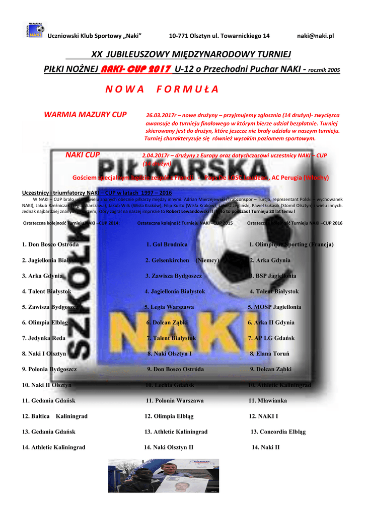 Uczniowski Klub Sportowy „Naki” 10-771 Olsztyn ul. Towarnickiego 14 [email protected] XX JUBILEUSZOWY MIĘDZYNARODOWY TURNIEJ PIŁKI NOŻNEJ NAKI- CUP 2017 U-12 o Przechodni Puchar NAKI - rocznik 2005 NOWA WARMIA MAZURY CUP NAKI CUP FORMUŁA 26.03.2017r – nowe drużyny – przyjmujemy zgłosznia (14 drużyn)- zwycięzca awansuje do turnieju finałowego w którym bierze udział bezpłatnie. Turniej skierowany jest do drużyn, które jeszcze nie brały udziału w naszym turnieju. Turniej charakteryzuje się również wysokim poziomem sportowym. 2.04.2017r – drużyny z Europy oraz dotychczasowi uczestnicy NAKI – CUP (14 drużyn) Gościem specjalnym będzie zespół z Francji - Pays De LOSC Loudeac , AC Perugia (Włochy) Uczestnicy i triumfatorzy NAKI – CUP w latach 1997 – 2016 W NAKI – CUP brało udział wielu znanych obecnie piłkarzy między innymi: Adrian Mierzejewski (Trabzonspor – Turcja, reprezentant Polski – wychowanek NAKI), Jakub Rzeźniczak (Legia Warszawa), Jakub Wilk (Wisła Kraków), Filip Kurto (Wisła Kraków), Łukasz Jegliński, Paweł Łukasik (Stomil Olsztyn) i wielu innych. Jednak najbardziej znanym piłkarzem, który zagrał na naszej imprezie to Robert Lewandowski !!! Było to podczas I Turnieju 20 lat temu ! Ostateczna kolejność Turnieju NAKI –CUP 2014: Ostateczna kolejność Turnieju NAKI –CUP 2015 Ostateczna kolejność Turnieju NAKI –CUP 2016 1. Don Bosco Ostróda 1. Gol Brodnica 2. Jagiellonia Białystok 2. Gelsenkirchen 3. Arka Gdynia 3. Zawisza Bydgoszcz 3. BSP Jagiellonia 4. Talent Białystok 4. Jagiellonia Białystok 4. Talent Białystok 5. Zawisza Bydgoszcz 5. Legia Warszawa 1. Olimpique Sporting (Francja) (Niemcy) 2. Arka Gdynia 5. MOSP Jagiellonia 6. Olimpia Elbląg 6. Dolcan Ząbki 6. Arka II Gdynia 7. Jedynka Reda 7. Talent Białystok 7. AP LG Gdańsk 8. Naki I Olsztyn 8. Naki Olsztyn I 8. Elana Toruń 9. Polonia Bydgoszcz 9. Don Bosco Ostróda 9. Dolcan Ząbki 10. Naki II Olsztyn 10. Lechia Gdańsk 10. Athletic Kaliningrad 11. Gedania Gdańsk 11. Polonia Warszawa 11. Mławianka 12. Baltica 12. Olimpia Elbląg 12. NAKI I 13. Gedania Gdańsk 13. Athletic Kaliningrad 13. Concordia Elbląg 14. Athletic Kaliningrad 14. Naki Olsztyn II 14. Naki II Kaliningrad Uczniowski Klub Sportowy „Naki” Zwycięzcy Turniejów NAKI-CUP 10-771 Olsztyn ul. Towarnickiego 14 1997-2016 1997 rocznik 86 1 GKP Brzeźno Gdańsk 2004 rocznik 86 1 NAKI Olsztyn 2 ŁKS Łódź 2 Żalgirys Wilno (Litwa) 3 Stomil Olsztyn 3 ŁKS Łódź 4 Stal Mielec 4 LEGIA Warszawa 1998 rocznik 86 1 DCSZY Łuck (Ukraina) 2005 rocznik 86 1 Podszytnik Łuck (Ukraina) 2 Stomil Olsztyn 2 NAKI Olsztyn 3 ŁKS Łódź 3 FC Pusynas (Litwa) 4 Górnik Łęczna 4 Polonia Warszawa 1999 rocznik 86 1 Stomil Olsztyn 2006 rocznik 88 1 NAKI Olsztyn 2 DCSZY Łuck (Ukraina) 2 Sokół Ostróda 3 Polonia Warszawa 3 Jeziorak Iława 4 ŁKS Łódź 4 Olimpia Elbląg 2000 rocznik 86 1 NAKI Olsztyn 2007 rocznik 89 1 Baltica Kaliningrad (Rosja) 2 Orlen Płock 2 NAKI I Olsztyn 3 Polonia Warszawa 3 NAKI II Olsztyn 4 Lechia Gdańsk 4 OKS 1945 Olsztyn 2001 rocznik 86 1 Zawisza Bydgoszcz 2008 rocznik 93 1 NAKI I Olsztyn 2 VFB Oldenburg (GER) 2 NAKI II Olsztyn 3 Stomil Olsztyn 3 Baltica I Kaliningrad (Rosja) 4 Orlen Płock 4 Baltica II Kaliningrad (Rosja) 2002 rocznik 86 1 LEGIA Warszawa 2009 rocznik 99 1 Lechia Gdańsk 2 Wisła Tczew 2 NAKI I Olsztyn 3 Naki Olsztyn 3 Korona Ostrołęka 4 Stomil Olsztyn 4 Jagiellonia Białystok 2003 rocznik 86 [email protected] 2010 rocznik 99 1 Stomil Olsztyn 1 NAKI I Olsztyn 2 VFB Oldenburg (GER)) 2 Bałtyk Gdynia 3 Górnik Łęczna 3 ALITUS (Litwa) 4 Polonia Warszawa 4 Bródno Warszawa 2012 rocznik 98 1 Olimpia Elbląg 2013 rocznik 2002 1 SEMP Warszawa 2 VfO Offenburger I (GER) 2 WIDOK Skierniewice 3 Naki Olsztyn 3 DJSSz 5 Kaliningrad (Rosja) 4 VfO Offenburger II(GER) 4 Audace Cerignola (Włochy) 2014 rocznik 2003 1 Don Bosco Ostróda 2015 rocznik 2003 1 Gol Brodnica 2 Jagiellonia Białystok 2 Gelsenkirchen (Niemcy) 3 Arka Gdynia 3 Zawisza Bydgoszcz 4 Talent Białystok 4 Jagiellonia Białystok 2016 rocznik 2004: 1. Olimpiqe Sporting Club Loudeac (FRANCJA) 2. Arka Gdynia 3. BSP Jagiellonia 4. Talent Białystok Udział w turnieju finałowym NAKI – CUP 2017 potwierdzili praktycznie prawie wszyscy uczestnicy NAKI CUP 2016. W tym również drużyny zagraniczne Olimpiqe Sporting Club Loudeac (Francja 100%) zwycięzca NAKI CUP 2016, AC Peruggia (Włochy 100%) uczestniczył w NAKI CUP 2014 i 2016 w starszym roczniku, Alvere Osaka (Japonia 90%) i FK Kaliningrad (Rosja 100%). Uczniowski Klub Sportowy „Naki” 10-771 Olsztyn ul. Towarnickiego 14 [email protected] Zasady uczestnictwa w zawodach Uczestniczyć mogą chłopcy urodzeni w 2005 roku i młodsi, posiadający uprawnienia do gry, aktualną kartę zdrowia oraz dokument ze zdjęciem potwierdzający tożsamość. Zawodnicy muszą być ubezpieczeni przez macierzyste kluby. Przed rozpoczęciem rozgrywek w biurze zawodów nastąpi weryfikacja tożsamości zgłoszonych zawodników (obowiązkowe: legitymacja szkolna lub paszport oraz karta zdrowia). Drużyny uczestniczące w zawodach winny przedstawić organizatorowi listę maksymalnie 15 zawodników z następującymi danymi: imię i nazwisko, data urodzenia, numer koszulki (Dopuszczamy możliwość udziału większej liczby zawodników jednak w przypadku zdobycia miejsca w pierwszej czwórce turnieju do nagród może wystąpić tylko 15 graczy). Drużyny obowiązuje jednolity strój sportowy podczas gry oraz stały numer zawodnika na koszulce podczas trwania turnieju. System rozgrywania zawodów Zespoły zostaną podzielone na 2 grupy eliminacyjne 7 drużynowe, w których rywalizować będą systemem każdy z każdym. Dwa najlepsze zespoły grają w ½ finału, pozostali mecz o ostateczne miejsce w turnieju. Każdy zespół rozegra 7 lub 8 meczy !!! O kolejności w grupie decyduje: liczba zdobytych punktów bezpośredni pojedynek różnica bramek większa ilość strzelonych br