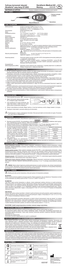 Geratherm Medical AG Niemcy Cyfrowy termometr lekarski Geratherm® easy temp GT-2052 INSTRUKCJA UĩYCIA PL Prosimy o dokáadne przeczytanie instrukcji przed uĪyciem OPIS CZĉĝCI Pokrywa schowka na baterie Czujnik WyĞwietlacz Wáącznik/Wyáącznik DANE TECHNICZNE Zakres pomiaru: Zastosowanie: Skala: DokáadnoĞü pomiaru: WyĞwietlacz: Bateria (doáączona): ZuĪycie energii: TrwaáoĞü baterii: StopieĔ ochrony: Wymiary: Waga: Sygnaá: PamiĊü: Warunki uĪytkowania: Warunki przechowywania: Gwarancja jakoĞci: KompatybilnoĞü elektromagnetyczna (EMC): od 32,0 °C do 43,9 °C (89.6 °F do 111.1 °F) poniĪej 32,0 °C (89.6 °F) wskazanie L °C (°F) powyĪej 43,9 °C (111.1 °F) wskazanie H °C (°F) pomiar temperatury ciaáa 0,1 °C (°F) ± 0,1 °C od 34,0 °C do 42,0 °C; ± 0,2 °C (inny zakres) ±0,2 °F (93.2 °F do 107.6 °F); ± 0,4 °F (inny zakres) wyĞwietlacz ciekáokrystaliczny 3 ½ znaku CR1225 (3 V) 0,4 mW przy wykonywaniu pomiaru ponad 160 godzin przy pracy ciągáej IP22 ok. 117 mm x 30 mm x 16 mm ok. 20 g razem z baterią Sygnaá akustyczny ok. 10 s, jeĞli nie zostanie stwierdzony istotny wzrost temperatury. Wbudowana pamiĊü umoĪliwiająca wyĞwietlenie wyniku ostatniego pomiaru. temperatura: od 10 °C do 40 °C (50 °F do 104 °F) wilgotnoĞü wzglĊdna: od 15 % do 95 % MoĪliwy jest tylko pomiar temperatury, która jest wyĪsza niĪ temperatura pokojowa. temperatura: od -25 °C do +55 °C (-13 °F do 131 °F) wilgotnoĞü wzglĊdna: od 15 % do 95 % Termometr speánia wymogi normy EN 12470-3 (Kompaktowe termometry elektryczne z urządzeniem maksymalnym). Geratherm® posiada certy¿kat zgodnie z dyrektywą 93/42/EWG i normą EN ISO 13485 i moĪe byü oznakowany symbolem (Jednostka noty¿kowana TÜV Rheinland LGA Products GmbH). Opisywany wyrób medyczny jest urządzeniem o wysokiej odpornoĞci na zakáócenia. Dlatego zrezygnowano z zaáączania tabel EMC. WSKAZÓWKI BEZPIECZEēSTWA 1. W celu uzyskania najlepszych wyników pomiaru nie naleĪy uĪywaü termometru do pomiarów w rejonie pach. Stosowaü termometr tylko do pomiarów oralnych lub rektalnych. 2. Korzystanie z termometru nie moĪe zastąpiü wizyty u lekarza. Utrzymująca siĊ gorączka, szczególnie u dzieci, wymaga fachowego leczenia. W takim wypadku naleĪy skontaktowaü siĊ z lekarzem rodzinnym! 3. Pomiar temperatury u dzieci musi byü wykonywany pod nadzorem osoby dorosáej. 4. Termometr naleĪy przechowywaü w miejscu niedostĊpnym dla dzieci. Od termometru mogą odpaĞü drobne czĊĞci, które mogą zostaü poákniĊte lub dostaü siĊ do dróg oddechowych, powodując niebezpieczeĔstwo uduszenia. 5. Termometru nie naleĪy wygotowywaü, gryĨü, zginaü, upuszczaü ani rozkáadaü. 6. Nigdy nie otwieraü termometru, chyba Īe konieczna jest wymiana baterii. 7. NaleĪy unikaü wykonywania pomiarów temperatury w ciągu 30 minut po üwiczeniach ¿zycznych, kąpieli lub jedzeniu. 8. W trakcie uĪytkowania, przechowywania lub transportu naleĪy chroniü termometr przed bezpoĞrednim dziaáaniem promieni sáonecznych, wilgoci i skrajnych temperatur oraz zabezpieczyü go przed zabrudzeniem. 9. Nie naleĪy uĪywaü termometru, jeĞli dziaáa on nieregularnie lub ma uszkodzony wyĞwietlacz. 10. JeĪeli termometr byá przechowywany w niskich temperaturach, przed uĪyciem naleĪy go ogrzaü w temperaturze pokojowej. WYMIANA BATERII 1. Kiedy wyĞwietli siĊ symbol „ ”, oznacza to koniecznoĞü wymiany baterii. 2. Zdjąü z termometru osáonĊ schowka na baterie, a nastĊpnie wyjąü moduá baterii. 3. UĪyü wykaáaczki lub innego przedmiotu, aby wyjąü starą bateriĊ. Unikaü przy tym stosowania ostrych przedmiotów metalowych. 4. WáoĪyü nową bateriĊ do schowka. Biegun ujemny (-) musi byü zwrócony na dóá, a biegun dodatni (+) do góry. 5. PrzekrĊciü moduá baterii i ponownie wáoĪyü go do termometru. Przechowywaü w miejscu niedostĊpnym dla dzieci. Nie wyrzucaü baterii ani termometru do ognia. W przeciwnym razie moĪe on eksplodowaü! STOSOWANIE 1. Przed uĪyciem termometru zdezynfekowaü czujnik pomiarowy alkoholem etylowym (do wcierania). 2. Nacisnąü przycisk Wà/WYà. Na wyĞwietlaczu ukaĪe siĊ lub i dodatkowo alarm gorączkowy, sygnalizowany kolorem zielonym, Īóátym lub czerwonym. 3. Zwolniü przycisk Wà/WYà. Na wyĞwietlaczu ukaĪe siĊ symbol L °C (L °F) oraz migoczący symbol °C (°F). 4. UmieĞciü czujnik pomiarowy w odpowiednim miejscu (w ustach, w odbycie lub pod pachą). 5. W momencie gdy termometr nie stwierdza WskaĨnik podwyĪszonej Temperatura (°C) Temperatura (°F) dalszego, istotnego wzrostu temperatury, temperatury symbol °C (°F) przestaje migaü i wyĞwie- 35,9 tlana jest zmierzona do tego momentu najwyĪsza wartoĞü temperatury. Jedno36,0 czeĞnie sáychaü kilka sygnaáów dĨwiĊko37,2 wych. Wskazanie Ğwieci siĊ odpowiednim 37,5 kolorem alarmu gorączkowego (zielony, Īóáty, czerwony) 44,9 6. Urządzenie wyáącza siĊ automatycznie po 30 sekundach. Aby wydáuĪyü ĪywotnoĞü baterii, poprzez naciĞniĊcie przycisku Wà/WYà. T 37,1 96,7 T 37,1 bezbarwny T 37,1 96,8 T 98,8 zielony T 37,4 98,9 T 99,4 Īóáty T 43,9 99,5 T 111,1 czerwony T 43,9 111,2 T 43, 9 bezbarwny naleĪy wyáączaü termometr po zanotowaniu temperatury, DODATKOWE UWAGI Sygnaá temperatury normalnej: Kiedy zostanie osiągniĊta i wyĞwietlona najwyĪsza wartoĞü temperatury, rozlega siĊ sygnaá. „Sygnaá temperatury normalnej” (cztery krótkie tony, po których nastĊpuje pauza) jest powtarzany mniej wiĊcej przez 5 sekund. Ostatnia wartoĞü pomiaru: Kiedy zostanie naciĞniĊty przycisk Wà./WYà. w celu aktywowania termometru, naleĪy przytrzymaü go przez 2 sekundy. Wskazanie 188.8 zmieni siĊ, aby wyĞwietliü ostatnio zmierzoną temperaturĊ. Ta wartoĞü odczytu bĊdzie wyĞwietlana tylko tak dáugo, jak dáugo bĊdzie naciskany przycisk. Kiedy przycisk zostanie zwolniony, termometr przejdzie w „Tryb gotowoĞci do pomiaru”, a wskazanie temperatury zost