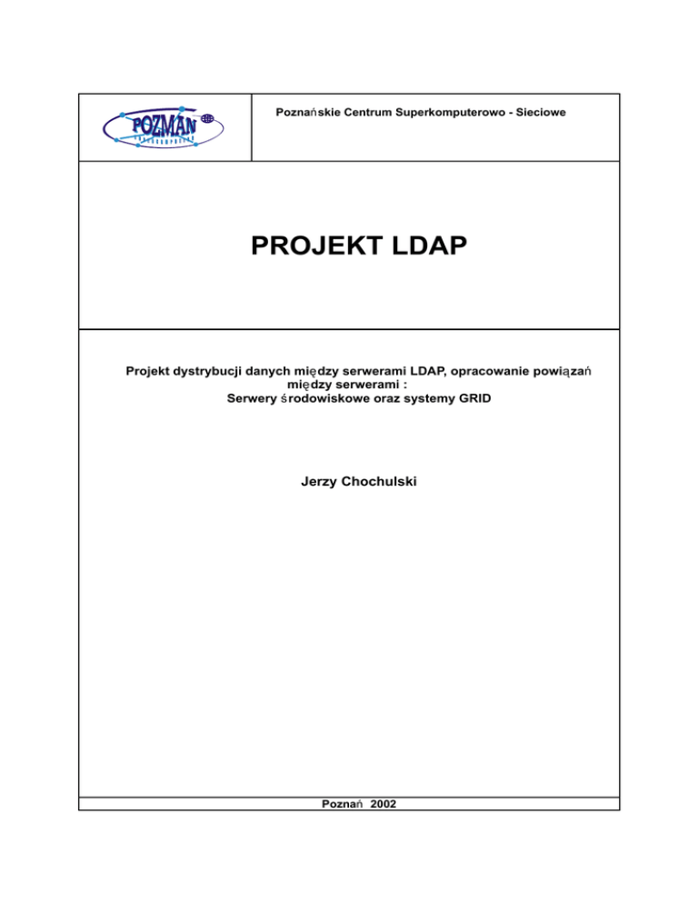 Poznań skie Centrum Superkomputerowo - Sieciowe PROJEKT LDAP Projekt dystrybucji danych mię dzy serwerami LDAP, opracowanie powią zań mię dzy serwerami : Serwery ś rodowiskowe oraz systemy GRID Jerzy Chochulski Poznań 2002 Spis treś ci 1 WSTĘ P......................................................................................................... .........................3 2 SERWERY Ś RODOWISKOWE............................................................................ .............4 2.1 BAZY DANYCH I REPLIKACJA.....................................................................................................4 3 SYSTEMY GRID........................................................................................... .......................6 3.1 MDS...................................................................................................................................6 3.2 PRZYKŁAD............................................................................................................................11 4 PODSUMOWANIE.............................................................................................. ...............15 BIBLIOGRAFIA....................................................................................................... ............16 PCSS 2002 2 1 Wstę p Pierwsza część opracowania (rozdział drugi) dotyczy rozmieszczenia serwerów środowiskowych LDAP w Poznańskim Centrum Superkomputerowo-Sieciowym. Druga część opracowania dotyczy budowy serwisów informacyjnych w systemach GRID. Architektura serwisu informacyjnego w GRID musi spełniać następujące wymagania : 1. serwis informacyjny musi być budowany przy założeniu dużego rozproszenia komponentów systemu informacyjnego, 2. serwis informacyjny musi być skalowalny, 3. usterka jakiegokolwiek komponentu systemu informacyjnego nie powinna blokować możliwości otrzymania informacji o innych komponentach, 4. różnorodność komponentów serwisu informacyjnego – mechanizmy odkrywania i zapytań powinny uwzględniać wszelkiego rodzaju zasoby i serwisy. Rozdział trzeci przedstawia oprogramowanie do budowy serwisu informacyjnego GRID, które naszym zdaniem spełnia z powyższe wymaganiami. Przedstawiona będzie także metoda rozmieszczania serwerów LDAP w systemach GRID. PCSS 2002 3 2 Serwery ś rodowiskowe. Docelowa instalacja przewiduje postawienie dwóch serwerów LDAP : • serwer główny, • serwer pomocniczy. 2.1 Bazy danych i replikacja Na serwerze głównym będzie umieszczona baza „white pages”. Na serwerze pomocniczym będzie umieszczona baza wewnętrzna PCSS zawierająca informacje wykorzystywane przez portale oraz inne udostępniane usługi. Istnieje także możliwość postawienia osobnego serwera GIIS dla środowiska GRID na serwerze pomocniczym. Baza danych „white pages” z serwera głównego będzie replikowana na serwer pomocniczy (replikacja Single Master – dane mogą być edytowane tylko na serwerze głównym, na serwerze pomocniczym znajduje się replika tylko do odczytu). Baza danych PCSS z serwera pomocniczego będzie replikowana na serwer główny (replikacja Single Master – dane mogą być edytowane tylko na serwerze pomocniczym, na serwerze głównym znajduje się replika tylko do odczytu). Serwer główny Serwer pomocniczy Serwer LDAP Baza „white pages” (odczyt / zapis) Replika bazy PCSS (odczyt) Serwer LDAP Aktualizacja bazy danych Aktualizacja bazy danych Replika bazy „white pages” (odczyt) Baza PCSS (odczyt / zapis) Serwer GIIS Baza GIIS PCSS 2002 4 W ten sposób serwer pomocniczy oprócz utrzymywania replik baz danych z serwera głównego, pełni rolę serwera wydzielonego dla działalności wewnętrznej PCSS. PCSS 2002 5 3 Systemy GRID Najbardziej popularnym i najczęściej obecnie wykorzystywanym oprogramowaniem służącym do budowy systemów GRID jest Globus Toolkit. Jednym z jego składników jest serwis informacyjny MDS (Monitoring and Discovery Service) służący do gromadzenia danych o zasobach, ich charakterystyce oraz o ich stanie. Informacja ta jest wykorzystywana przez inne składniki systemu GRID oraz przez jego użytkowników. Serwis informacyjny MDS wykorzystuje serwer OpenLDAP (darmową implementację serwera LDAP) jako bazę danych do przechowywania i udostępniania informacji. Dalej w rozdziale zajmować się będziemy MDS w wersji 2.1 z Globus Toolkit w wersji 2.0. Najświeższe informacje o Globus Toolkit można znaleźć na stronie http://www.globus.org . 3.1 MDS Pakiet Globus Toolkit jest instalowany na każdym komputerze wchodzącym w skład systemu GRID. Tak więc na każdym komputerze istnieje aktywny serwis informacyjny MDS z zainstalowanym i uruchomionym serwerem OpenLDAP. MDS w wersji 2.1 dostarcza następujące komponenty : • konfigurowalny komponent dostawcy informacji zwany GRIS (Grid Resource Information Service); GRIS dostarcza informacji o zasobach pojedynczego komputera (dane statyczne) oraz stanie tych zasobów (dane dynamiczne), na którym jest zainstalowany; • konfigurowalny komponent globalnego katalogu zwany GIIS (Grid Index Information Service); GIIS dostarcza informacji o systemie komputerowym złożonym z jednego lub wielu komputerów Oba komponenty osadzone są na pojedynczym serwerze LDAP (poprzednie wersje MDS-a instalowały dwa serwery LDAP). Oba komponenty mogą występować pojedynczo lub razem, zależnie od roli jaką pełni komputer, na którym są zainstalowane : • komputer udostępniający swoje zasoby – zainstalowany GRIS lub GRIS i GIIS (taka jest konfiguracja zaraz po instalacji MDS-a); • komputer pełniący rolę serwera globalnego katalogu – zainstalowany GIIS. Między komponentami zachodzą następujące relacje : • komponent GRIS może być zarejestrowany w lokalnym komponencie GIIS i/lub w komponencie GIIS na innym komputerze; • komponent GIIS może być zarejestrowany w komponencie GIIS na innym komputerze. PCSS 2002 6 Powyższe relacje pozwalają n