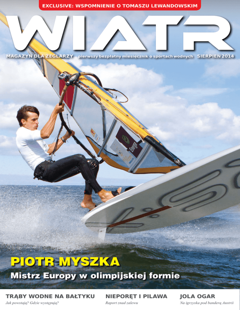 exclusive: wspomnienie o tomaszu lewandowskim magazyn dla żeglarzy pierwszy bezpłatny miesięcznik o sportach wodnych sierpień 2014 piotr myszka Mistrz Europy w olimpijskiej formie TRĄBY WODNE NA BAŁTYKU NIEPORĘT I PILAWA JOLA OGAR Jak powstają? Gdzie występują? Raport znad zalewu Na igrzyska pod banderą Austrii The sociable Activ 705 Cruiser Zapraszamy na stoisko Quicksilver na targach “Wiatr i Woda” w Marinie Gdynia w dniach 31 lipca - 3 sierpnia 2014 Wspaniały dzień to taki, który zaczyna i kończy się z przyjaciółmi i rodziną. Przyjazną atmosferę na wodzie zapewni na pewno Activ 705 Cruiser. Delphia Yachts Kot Sp. j. ul. Kościuszki 63 19-400 Olecko tel. +48 87 520 74 12 e-mail: [email protected] Sportowy styl, materiały wysokiej jakości i innowacyjny design sprawiają, że każdy dzień pozostanie niezapomnianą przygodą. Bo życie jest tu i teraz. Life is now Zdobywca nagrody “Motor Boat of the Year” dzięki połączeniu łatwości prowadzenia, praktycznych rozwiązań oraz wygody. Więcej informacji o pełnej ofercie Quicksilver na stronie: www.quicksilver-boats.com ZDJĘCIE NA OKŁADCE: PIOTR MYSZKA, FOT. MAREK WILCZEK / ENERGA SAILING Człowiek na morzu jest szczęśliwszy W tym wydaniu „Wiatru” publikujemy rozmowę Patrycji Długoń z Beatą Lewandowską, żoną Tomka Lewandowskiego, który dwa lata temu zmarł na pokładzie swojego jachtu „Luka”. To pierwszy taki wywiad – niezwykła opowieść o miłości, marzeniach, poszukiwaniu miejsca na ziemi i odpowiedzi na pytanie, co zrobić z resztą życia. Tomasz Lewandowski jest jedynym Polakiem, który opłynął kulę ziemską w samotnym rejsie bez zawijania do portów trasą ze wschodu na zachód – pod wiatry i prądy. Przed nim w historii światowego żeglarstwa dokonało tego zaledwie pięć osób. Ci, którzy znali Tomka Lewandowskiego, mają wielkie szczęście, bo mogli czerpać garściami z jego marzeń, humoru, piosenek oraz z niezwykłego dystansu do siebie i świata. Dla wszystkich, którzy go nie znali, Patrycja Długoń przygotowała artykuł oraz wywiad z Beatą Lewandowską – w obu tekstach panie kreślą sylwetkę niezwykłego człowieka. W trakcie lektury poznajemy Tomka takim, jakim widziała go najbliższa mu osoba... Co tak ciągnęło na morze kapitana Lewandowskiego, „włóczęgę z Iławy”? Na jachcie „Luka” nie tylko żeglował i opłynął świat, ale także mieszkał. Może szukał prostoty życia pozwalającej skupiać uwagę na tym, co najważniejsze dziś i jutro, czyli na tym, skąd wieje wiatr, z jaką siłą dmuchnie o świcie, czy prądy porwą nas we właściwym kierunku i co zjemy na kolację. Na morzu zwykle nie ma wojen, separatystów, kłamstw, obłudy i cynizmu polityków. Tam nawet ma- rzenia są inne niż na lądzie, bo zwykle tęsknimy za rzeczami, których tu nawet nie zauważamy. W niezwykły sposób ujął to Tomek w swym dzienniku. Wiele jego słów wartych jest naszej uwagi, ale te zostaną ze mną na długo: „Dzień 360. Teraz zależy mi, żeby wziąć na kolana Beatę i nażreć się dobrze uwędzonej kiełbasy, reszta to iluzja i brednie”. Kiedy Beata wyda książkę zawierającą wszystkie rejsowe zapiski Tomka, z pewnością będzie to pasjonująca i pouczająca lektura. Beata Lewandowska po śmierci męża nie wróciła na ląd. Nadal mieszka i pływa na „Luce” wraz z psem Wackiem. Dba o jacht, organizuje rejsy i czartery, zrobiła nawet kurs kapitański, by móc na pokładzie decydować o wszystkim samodzielnie. Rozmowę o Tomku, o jachcie, o babskich sprawach i o życiu na morzu Patrycja Długoń przeprowadziła specjalnie dla magazynu „Wiatr”. Krzysztof Olejnik, redaktor naczelny 10 237 czytelników* pobiera bezpłatne e-wydania „Wiatru”. Na tabletach szukajcie aplikacji w Apple Store i Google Play, a na komputerach i smartfonach – plików PDF. www.magazynwiatr.pl *Średnia liczba pobrań aktualnego wydania (dane wydawcy – wydania V 2014, VI 2014, VII 2014). www.magazynwiatr.pl 3 Trąby wodne na Bałtyku Z 4 są najczęstsze. Tworzą się wówczas, gdy nad rozgrzane morze (a więc w strefach przybrzeżnych i na płytkich akwenach) napływa zimne powietrze polarne. Takie sytuacje mamy nad naszym Bałtykiem latem i jesienią, gdy morze zakumulowało już sporą ilość energii, a z północy napływają chłodniejsze masy powietrza. Do powstania takich trąb potrzeba więc dużej różnicy temperatur pomiędzy powietrzem a morzem, co sprzyja szybkiemu rozwojo- reklama pokładu ORP „Kościuszko” sfilmowano w czerwcu trąbę wodną. To ciekawe zjawisko wcale nie jest rzadkością na naszym morzu. Pojawia się także na Mazurach. Trąby wodne tworzą się na Bałtyku co roku, ale nieczęsto udaje się je zarejestrować z tak niewielkiej odległości. Jak mówi jeden z marynarzy ORP „Kościuszko”, kapitan zdecydował się podejść w pobliże trąby, gdyż się nie poruszała – było to więc mniej intensywne i jednocześnie najbardziej typowe zjawisko, które Amerykanie nazywają nawet trąbą wodną dobrej pogody (fair weather waterspout). Aby odszukać film w internecie, należy w wyszukiwarkę serwisu You Tube wpisać słowa: „Trąba powietrzna na Zatoce Gdańskiej”. Tylko w czerwcu w Europie zanotowano 62 zjawiska tego typu, a na samym Bałtyku i w cieśninach duńskich – 16 (dane European Severe Weather Database). Najczęściej trąby tworzyły się między 20 a 23 czerwca, kiedy ciepłe masy powietrza zwrotnikowego ścierały się z powietrzem polarnym. Ale szczyt sezonu na bałtyckie trąby wodne jeszcze przed nami – przypada on bowiem na wrzesień i październik. Występują dwa główne typy trąb wodnych. Te o niewielkiej intensywności, niezwiązane z superkomórkami burzowymi, SILNIKI ELEKTRYCZNE www.profishing.com.pl tel. kom. 601 279 805 sierpień 2014 FOT. SHUTTERSTOCK.COM Tylko w czerwcu w Europie zanotowano 62 trąby wodne. wi konwekcji. Trąba tego typu jest związana z siln