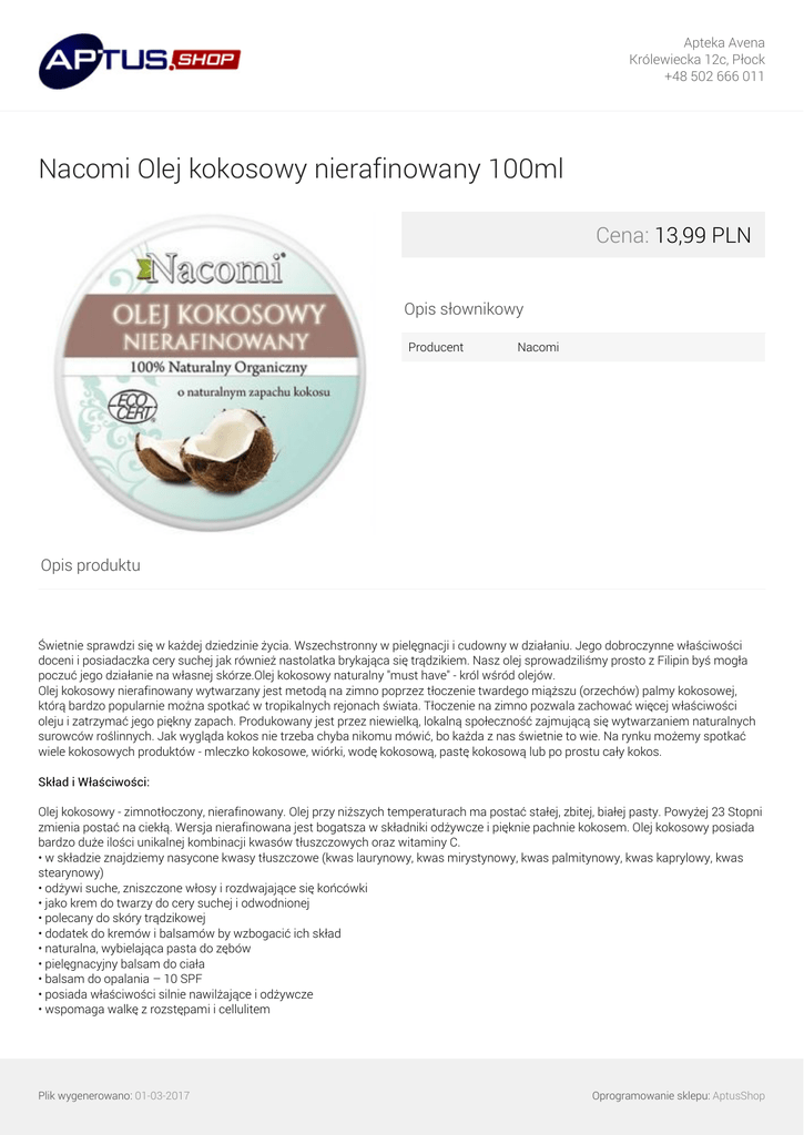 Apteka Avena Królewiecka 12c, Płock +48 502 666 011 Nacomi Olej kokosowy nierafinowany 100ml Cena: 13,99 PLN Opis słownikowy Producent Nacomi Opis produktu Świetnie sprawdzi się w każdej dziedzinie życia. Wszechstronny w pielęgnacji i cudowny w działaniu. Jego dobroczynne właściwości doceni i posiadaczka cery suchej jak również nastolatka brykająca się trądzikiem. Nasz olej sprowadziliśmy prosto z Filipin byś mogła poczuć jego działanie na własnej skórze.Olej kokosowy naturalny "must have" - król wśród olejów. Olej kokosowy nierafinowany wytwarzany jest metodą na zimno poprzez tłoczenie twardego miąższu (orzechów) palmy kokosowej, którą bardzo popularnie można spotkać w tropikalnych rejonach świata. Tłoczenie na zimno pozwala zachować więcej właściwości oleju i zatrzymać jego piękny zapach. Produkowany jest przez niewielką, lokalną społeczność zajmującą się wytwarzaniem naturalnych surowców roślinnych. Jak wygląda kokos nie trzeba chyba nikomu mówić, bo każda z nas świetnie to wie. Na rynku możemy spotkać wiele kokosowych produktów - mleczko kokosowe, wiórki, wodę kokosową, pastę kokosową lub po prostu cały kokos. Skład i Właściwości: Olej kokosowy - zimnotłoczony, nierafinowany. Olej przy niższych temperaturach ma postać stałej, zbitej, białej pasty. Powyżej 23 Stopni zmienia postać na ciekłą. Wersja nierafinowana jest bogatsza w składniki odżywcze i pięknie pachnie kokosem. Olej kokosowy posiada bardzo duże ilości unikalnej kombinacji kwasów tłuszczowych oraz witaminy C. • w składzie znajdziemy nasycone kwasy tłuszczowe (kwas laurynowy, kwas mirystynowy, kwas palmitynowy, kwas kaprylowy, kwas stearynowy) • odżywi suche, zniszczone włosy i rozdwajające się końcówki • jako krem do twarzy do cery suchej i odwodnionej • polecany do skóry trądzikowej • dodatek do kremów i balsamów by wzbogacić ich skład • naturalna, wybielająca pasta do zębów • pielęgnacyjny balsam do ciała • balsam do opalania – 10 SPF • posiada właściwości silnie nawilżające i odżywcze • wspomaga walkę z rozstępami i cellulitem Plik wygenerowano: 01-03-2017 Oprogramowanie sklepu: AptusShop Apteka Avena Królewiecka 12c, Płock +48 502 666 011 • do masażu całego ciała • bogactwo antyoksydantów zwalczających wolne rodniki powoduje spowolnienie starzenia się skóry – doskonały krem na zmarszczki • jako krem do golenia, a także po depilacji • jako naturalny dezodorant • nawilży suche, spierzchnięte usta • polecany dla osób z łuszczycą i atopią • wspomaga leczenie grzybicy • dzięki właściwościom antyseptycznym i antybakteryjnym przyspiesza gojenie trudno gojących się ran • łagodzi ukąszenia owadów • do pielęgnacji niemowląt i dzieci - jest delikatny i nie uczula Jak używać? Olej kokosowy ma prawie nieograniczone zastosowanie. Jego właściwości doceniamy praktycznie w każdej dziedzinie życia. Stosowany na włosy, ciało, ręce i stopy poprawi kondycję całego naszego organizmu. Stosowany bezpośrednio z pojemniczka jako krem do twarzy - nawilży naszą skórę i pozwoli pozbyć się niedoskonałości i przebarwień. Świetnie sprawdzi się jako olejek do kąpieli (kilka kropli roztopionego oleju kokosowego dodajemy do wody przed kąpielą). Przy pielęgnacji włosów możemy stosować go jako regenerującą maskę do włosów. Sprawdzi się również przy popularnej ostatnio metodzie olejowania włosów. Olej wcieramy we włosy na sucho i pozostawiamy na kilka godzin. Po tym rytuale wszystko dokładnie zmywamy szamponem. Możemy połączyć go z solą - wtedy stworzymy swój własny domowy peeling do ciała. (Lepiej jednak wybrać stworzony przez nas organiczny, pięknie pachnący z wiórkami kokosa) W codziennej pielęgnacji olej możemy stosować jako specyfik do demakijażu. Usunie on nawet wodoodporny tusz do rzęs. By nawilżyć i ujędrnić ciało, a przy okazji pozbyć się cellulitu i rozstępów stosujmy olej kokosowy jak balsam do ciała - rano i wieczorem. W zimie świetnie sprawdzi się jako ochronny krem do twarzy, a w lecie jako balsam do opalania lub łagodzący podrażnienia po kąpieli słonecznej. Wcierany w skórki paznokci- zmiękczy je i nawilży. Przeznaczenie: Dla oleju kokosowego znajdziemy również zastosowanie w kuchni. Jeśli chcemy by nasze drewniane przybory kuchenne dłużej nam służyły, nacierajmy je olejem kokosowym. Skóra sucha, mieszana, dojrzała, tłusta, trądzikowa Skóra twarzy, ciała, włosy, paznokcie Plik wygenerowano: 01-03-2017 Powered by TCPDF (www.tcpdf.org) Oprogramowanie sklepu: AptusShop