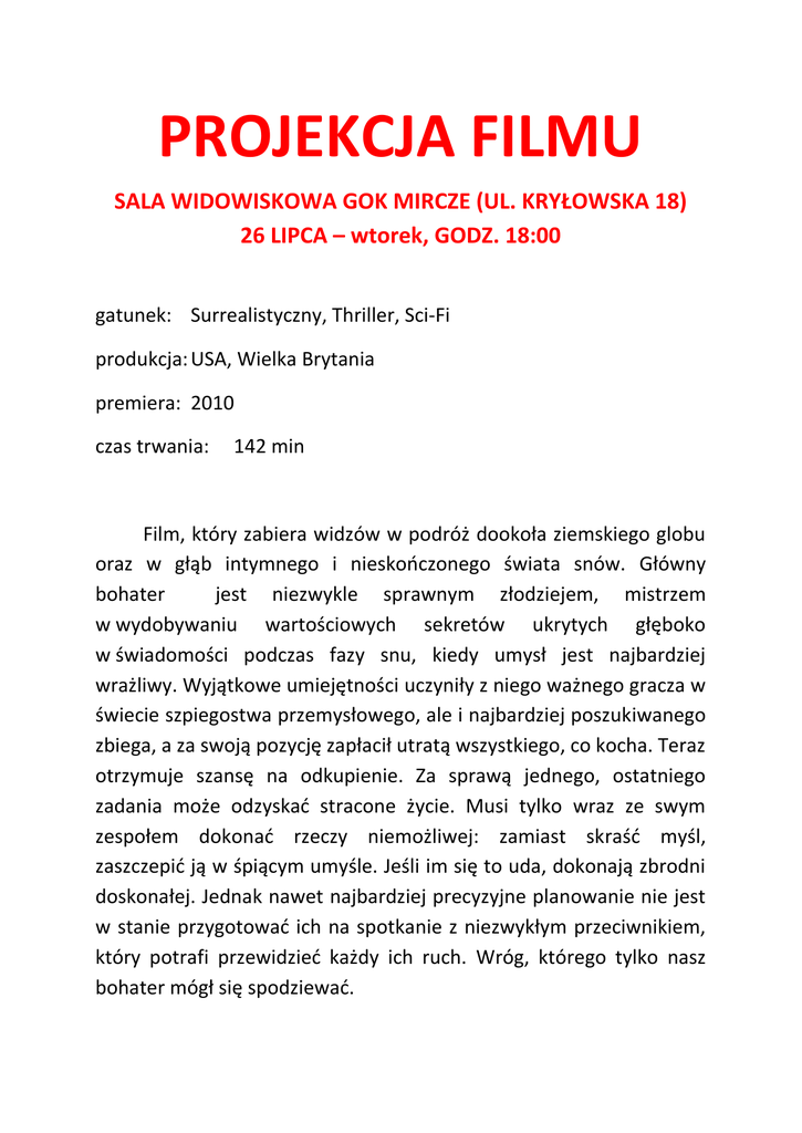 PROJEKCJA FILMU SALA WIDOWISKOWA GOK MIRCZE (UL. KRYŁOWSKA 18) 26 LIPCA – wtorek, GODZ. 18:00 gatunek: Surrealistyczny, Thriller, Sci-Fi produkcja: USA, Wielka Brytania premiera: 2010 czas trwania: 142 min Film, który zabiera widzów w podróż dookoła ziemskiego globu oraz w głąb intymnego i nieskończonego świata snów. Główny bohater jest niezwykle sprawnym złodziejem, mistrzem w wydobywaniu wartościowych sekretów ukrytych głęboko w świadomości podczas fazy snu, kiedy umysł jest najbardziej wrażliwy. Wyjątkowe umiejętności uczyniły z niego ważnego gracza w świecie szpiegostwa przemysłowego, ale i najbardziej poszukiwanego zbiega, a za swoją pozycję zapłacił utratą wszystkiego, co kocha. Teraz otrzymuje szansę na odkupienie. Za sprawą jednego, ostatniego zadania może odzyskać stracone życie. Musi tylko wraz ze swym zespołem dokonać rzeczy niemożliwej: zamiast skraść myśl, zaszczepić ją w śpiącym umyśle. Jeśli im się to uda, dokonają zbrodni doskonałej. Jednak nawet najbardziej precyzyjne planowanie nie jest w stanie przygotować ich na spotkanie z niezwykłym przeciwnikiem, który potrafi przewidzieć każdy ich ruch. Wróg, którego tylko nasz bohater mógł się spodziewać.