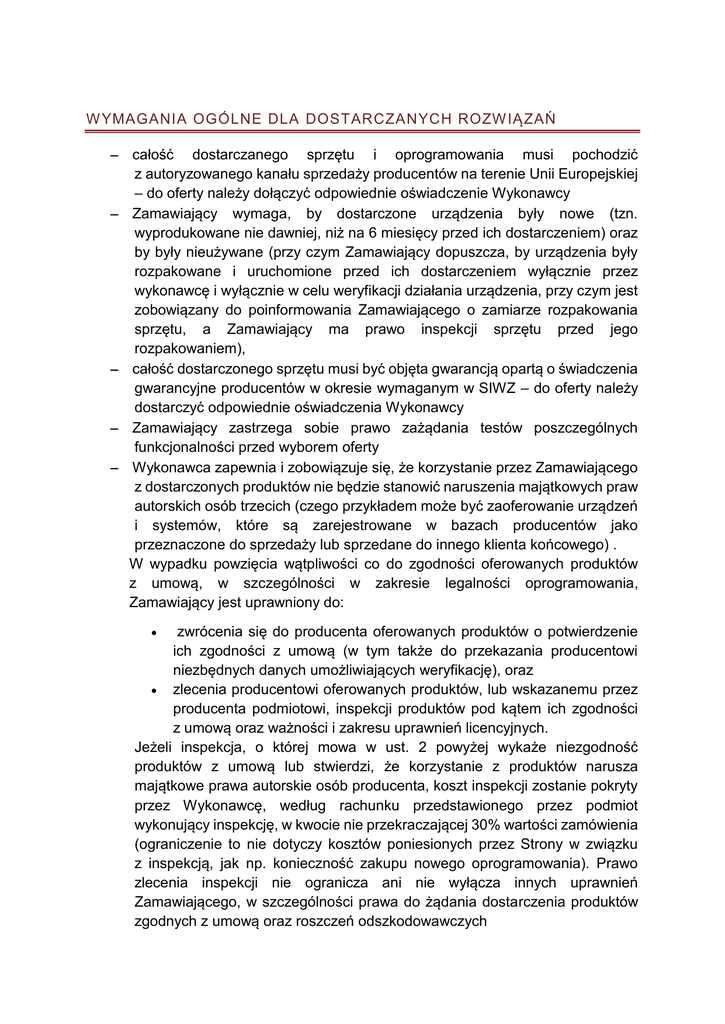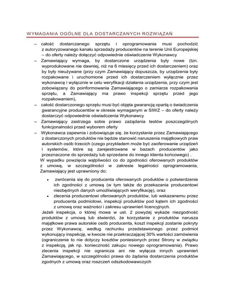 W YMAGANIA OGÓLNE DLA DOSTARCZANYCH ROZW IĄ ZAŃ całość dostarczanego sprzętu i oprogramowania musi pochodzić z autoryzowanego kanału sprzedaży producentów na terenie Unii Europejskiej – do oferty należy dołączyć odpowiednie oświadczenie Wykonawcy Zamawiający wymaga, by dostarczone urządzenia były nowe (tzn. wyprodukowane nie dawniej, niż na 6 miesięcy przed ich dostarczeniem) oraz by były nieużywane (przy czym Zamawiający dopuszcza, by urządzenia były rozpakowane i uruchomione przed ich dostarczeniem wyłącznie przez wykonawcę i wyłącznie w celu weryfikacji działania urządzenia, przy czym jest zobowiązany do poinformowania Zamawiającego o zamiarze rozpakowania sprzętu, a Zamawiający ma prawo inspekcji sprzętu przed jego rozpakowaniem), całość dostarczonego sprzętu musi być objęta gwarancją opartą o świadczenia gwarancyjne producentów w okresie wymaganym w SIWZ – do oferty należy dostarczyć odpowiednie oświadczenia Wykonawcy Zamawiający zastrzega sobie prawo zażądania testów poszczególnych funkcjonalności przed wyborem oferty Wykonawca zapewnia i zobowiązuje się, że korzystanie przez Zamawiającego z dostarczonych produktów nie będzie stanowić naruszenia majątkowych praw autorskich osób trzecich (czego przykładem może być zaoferowanie urządzeń i systemów, które są zarejestrowane w bazach producentów jako przeznaczone do sprzedaży lub sprzedane do innego klienta końcowego) . W wypadku powzięcia wątpliwości co do zgodności oferowanych produktów z umową, w szczególności w zakresie legalności oprogramowania, Zamawiający jest uprawniony do: zwrócenia się do producenta oferowanych produktów o potwierdzenie ich zgodności z umową (w tym także do przekazania producentowi niezbędnych danych umożliwiających weryfikację), oraz zlecenia producentowi oferowanych produktów, lub wskazanemu przez producenta podmiotowi, inspekcji produktów pod kątem ich zgodności z umową oraz ważności i zakresu uprawnień licencyjnych. Jeżeli inspekcja, o której mowa w ust. 2 powyżej wykaże niezgodność produktów z umową lub stwierdzi, że korzystanie z produktów narusza majątkowe prawa autorskie osób producenta, koszt inspekcji zostanie pokryty przez Wykonawcę, według rachunku przedstawionego przez podmiot wykonujący inspekcję, w kwocie nie przekraczającej 30% wartości zamówienia (ograniczenie to nie dotyczy kosztów poniesionych przez Strony w związku z inspekcją, jak np. konieczność zakupu nowego oprogramowania). Prawo zlecenia inspekcji nie ogranicza ani nie wyłącza innych uprawnień Zamawiającego, w szczególności prawa do żądania dostarczenia produktów zgodnych z umową oraz roszczeń odszkodowawczych Zamawiający wymaga, by dostarczone oprogramowanie było oprogramowaniem w wersji aktualnej (tzn. opublikowanej przez producenta nie wcześniej niż 6 miesięcy) na dzień poprzedzający dzień składania ofert, Oferowane urządzenia w dniu składania ofert nie mogą być przeznaczone przez producenta do wycofania z produkcji lub sprzedaży. W ARUNKI GW ARANCJI I SERW ISU o ile wymagania szczegółowe nie specyfikują inaczej, na dostarczany sprzęt musi być udzielona min. 60-miesięczna gwarancja; Zamawiający wymaga, by serwis był autoryzowany przez producenta urządzeń, to jest by zapewniona była naprawa lub wymiana urządzeń lub ich części, na części nowe i oryginalne, zgodnie z metodyką i zaleceniami producenta serwis gwarancyjny świadczony ma być w miejscu instalacji sprzętu; czas reakcji na zgłoszony problem (rozumiany jako podjęcie działań diagnostycznych i kontakt ze zgłaszającym) nie może przekroczyć jednego dnia roboczego (poniedziałek – piątek 7-15.00); usunięcie usterki (naprawa lub wymiana wadliwego podzespołu lub urządzenia) ma zostać wykonana w przeciągu dwóch dni roboczych od momentu zdiagnozowania usterki; Wykonawca ma obowiązek przyjmowania zgłoszeń serwisowych przez telefon (w godzinach pracy Zamawiającego), fax, e-mail lub WWW (przez całą dobę); Wykonawca ma udostępnić pojedynczy punkt przyjmowania zgłoszeń dla wszystkich dostarczanych rozwiązań W przypadku Sprzętu, dla którego jest wymagany dłuższy czas na naprawę sprzętu, Zamawiający dopuszcza podstawienie na czas naprawy Sprzętu o nie gorszych parametrach funkcjonalnych. Naprawa w takim przypadku nie może przekroczyć 14 dni od momentu zgłoszenia usterki Zamawiający otrzyma dostęp do pomocy technicznej Wykonawcy (telefon, email lub WWW) w zakresie rozwiązywania problemów związanych z bieżącą eksploatacją dostarczonych rozwiązań w godzinach pracy Zamawiającego Zamawiający uzyska dostęp do części chronionych stron internetowych producentów rozwiązań, umożliwiający: o pobieranie nowych wersji oprogramowania o dostęp do narzędzi konfiguracyjnych i dokumentacji technicznej o dostęp do pomocy technicznej producentów o bezpośrednie zgłaszanie awarii i problemów SERW ER TYPU BLADE – OBUDOW A – 1SZT Lp. Nazwa komponentu Wymagane minimalne parametry techniczne serwerów 1 2 3 1. Typ Obudowa. W ofercie wymagane jest podanie modelu, symbolu oraz producenta obudowa serwerowa (chassis) zawierającą gniazda rozszerzenia przewidziane do instalacji modułów serwerowych (blade) 2. Wymagane komponenty przełączniki przeznaczone do realizacji dostępu do sieci LAN/SAN (2 sztuki) środowisko zarządzające serwerami Możliwość zainstalowania przynajmniej 8 modułów 3. Cechy obudowy Zintegrowane i wentylatorów w ramach chassis moduły zasilaczy Moduły zasilające muszą zapewniać redundancję typu N+1 Komponenty sieciowe, zarządzające, zasilające oraz chłodzące obudowy muszą być oferowane w konfiguracji redundantnej architekturę nieblokująca 4. 5. minimum 4 fizyczne porty LAN 1/10GE/FCoE/FC 2/4/8G Cechy przełączników minimum 1 fizyczny port 40G QSFP System zarządzania obsługa IEEE Data Center Bridging (802.1Qbb PFC, 802.1AB, 802.