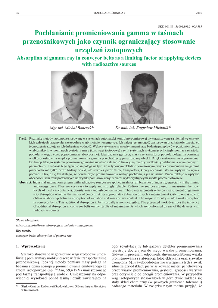 36 PRZEGLĄD GÓRNICZY 2015 UKD 001.891.5: 001.891.3: 005.585 Pochłanianie promieniowania gamma w taśmach przenośnikowych jako czynnik ograniczający stosowanie urządzeń izotopowych Absorption of gamma ray in conveyor belts as a limiting factor of applying devices with radioactive sources Mgr inż. Michał Bonczyk*) Dr hab. inż. Bogusław Michalik*) Treść: Rozmaite metody izotopowe stosowane w systemach automatyki kontrolno-pomiarowej wykorzystywane są niemal we wszystkich gałęziach przemysłu, szczególnie w górnictwie i energetyce. Ich zaletą jest mnogość zastosowań oraz łatwość użycia, co jednocześnie rzutuje na ich dużą niezawodność. Wykorzystywane są miedzy innymi przy badaniu przepływów, poziomów cieczy w zbiornikach, w pomiarach gęstości i masy (tzw. wagi izotopowe) czy w systemach wykonujących ciągły pomiar zawartości popiołu w węglu (tzw. popiołomierze absorpcyjne). Idea badania gęstości, masy czy zawartości popiołu polega na pomiarze wielkości osłabienia wiązki promieniowania gamma przechodzącej przez badany obiekt. Dzięki zastosowaniu odpowiedniej kalibracji takiego systemu pomiarowego można uzyskać zależność funkcyjną między wielkością osłabienia a wymienionymi parametrami. Trudność tego typu badań polega na tym, że w typowym układzie pomiarowym, wiązka promieniowania gamma przechodzi nie tylko przez badany obiekt, ale również przez taśmę transportera, której obecność istotnie wpływa na wynik pomiaru. Dzieje się tak dlatego, że pewna część promieniowania zostaje pochłonięta już w taśmie. Praca traktuje o wpływie obecności taśm transporterowych na wyniki pomiarów urządzeniami wykorzystującymi źródła promieniotwórcze. Abstract: Industrial automation systems with radioactive sources are applied in almost all branches of industry, especially in the mining and energy ones. They are very easy to apply and strongly reliable. Radioactive sources are used in measuring the flow, levels of media in containers, density, mass and ash content in coal. These measurements relay on measurement of gamma-ray absorption which is the matter of concern. After appropriate calibration of such a measurement system, one is able to obtain relationship between absorption of radiation and mass or ash content. The major difficulty is additional absorption in conveyor belts. This additional absorption in belts usually is non-negligible. The presented work describes the influence of additional absorption in conveyor belts on the results of measurements which are performed by use of the devices with radioactive sources Słowa kluczowe: taśmy przenośnikowe, absorpcja promieniowania gamma Key words: conveyor belts, absorption of gamma ray 1. Wprowadzenie Szeroko stosowane w górnictwie wagi izotopowe umożliwiają pomiar masy urobku jeszcze w fazie transportu taśmą przenośnikową. Idea tej metody pomiaru masy polega na badaniu stopnia absorpcji promieniowania emitowanego ze źródła izotopowego (np. 241Am, 59,4 keV) umieszczonego pod taśmą transportującą urobek. Umieszczony na odpowiedniej wysokości ponad taśmą licznik zawierający na *) Śląskie Centrum Radiometrii Środowiskowej, Główny Instytut Górnictwa w Katowicach ogół scyntylacyjny lub gazowy detektor promieniowania rejestruje docierającą do niego wiązkę promieniowania. Głównymi procesami odpowiedzialnymi za osłabienie wiązki promieniowania są absorpcja fotoelektryczna oraz zjawisko Comptona [6]. Prawdopodobieństwo wystąpienia tych zjawisk silnie zależy od składu pierwiastkowego materii penetrowanej przez wiązkę promieniowania, gęstości, grubości warstwy oraz oczywiście od energii promieniowania. W przypadku wag izotopowych stosowanych w górnictwie zakłada się stały skład chemiczny (w pewnych granicach tolerancji) badanego materiału. W związku z tym można przyjąć, że Nr 12 PRZEGLĄD GÓRNICZY osłabienie wiązki promieniowania podczas transmisji zależy tylko od gęstości powierzchniowej, czyli ilości materiału na powierzchni taśmy zgodnie z prawem Lamberta-Beera. Po odpowiedniej kalibracji urządzenia można w łatwy i szybki sposób uzyskać informację o masie urobku znajdującego się aktualnie na taśmie. Zasada działania popiołomierzy absorpcyjnych jest nieco bardziej skomplikowana. Zwykle, urządzenia te wykorzystują dwa źródła izotopowe (najczęściej 241Am o energii promieniowania 59,4 keV oraz 137Cs o energii promieniowania 661,7 keV). Różnice w absorpcji promieniowania o różnej energii w materiale urobku zależą od jego składu chemicznego. Faza mineralna tworząca popiół po spaleniu węgla różni się istotnie od węgla składem chemicznym . Zatem obserwowane zmiany absorpcji promieniowania w materiale urobku będą zależeć pośrednio od zawartości popiołu. Po odpowiedniej kalibracji układ może z dobrą dokładnością mierzyć zawartość popiołu bezpośrednio w materiale transportowanym na taśmie [3, 4] W warunkach rzeczywistych, taśma, która znajduje się pomiędzy źródłem izotopowym a badanym materiałem i detektorem powoduje dodatkowe osłabienie wiązki promieniowania. Taśma ta zazwyczaj w sposób istotny różni się składem chemicznym od materiału (urobku) będącego przedmiotem pomiaru. Jak już zaznaczono, dla niskich energii promieniowania, skład chemiczny (a dokładniej mówiąc, liczby atomowe pierwiastków tworzących materiał, z którego zbudowana jest taśma) jest istotnym czynnikiem wpływającym na ostateczną wielkość osłabienia promieniowania, a tym samym na czułość i precyzję całego układu pomiarowego. W krańcowym przypadku, zbyt dużego osłabienia promieniowania powodowanego obecnością taśmy, stosowanie wagi izotopowej lub popiołomierza staje się niemożliwe. Kryterium możliwości użycia danej taśmy w systemach zawierających wagi izotopowe czy popiołomierze stanowi wyznaczany eksperymentalnie współczynnik absorpcji promieniow