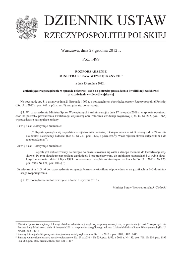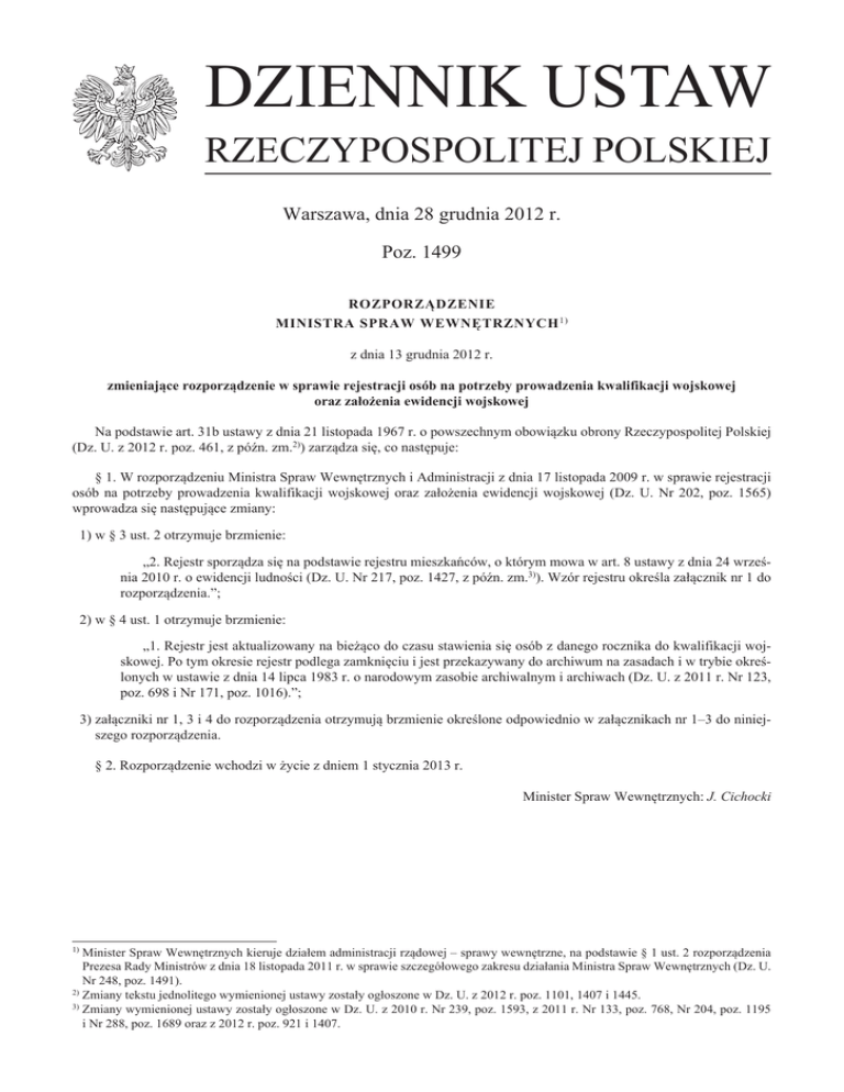DZIENNIK USTAW RZECZYPOSPOLITEJ POLSKIEJ Warszawa, dnia 28 grudnia 2012 r. Poz. 1499 Rozporządzenie Ministra Spraw Wewnętrznych 1) z dnia 13 grudnia 2012 r. zmieniające rozporządzenie w sprawie rejestracji osób na potrzeby prowadzenia kwalifikacji wojskowej oraz założenia ewidencji wojskowej Na podstawie art. 31b ustawy z dnia 21 listopada 1967 r. o powszechnym obowiązku obrony Rzeczypospolitej Polskiej (Dz. U. z 2012 r. poz. 461, z późn. zm.2)) zarządza się, co następuje: § 1. W rozporządzeniu Ministra Spraw Wewnętrznych i Administracji z dnia 17 listopada 2009 r. w sprawie rejestracji osób na potrzeby prowadzenia kwalifikacji wojskowej oraz założenia ewidencji wojskowej (Dz. U. Nr 202, poz. 1565) wprowadza się następujące zmiany: 1) w § 3 ust. 2 otrzymuje brzmienie: „2. Rejestr sporządza się na podstawie rejestru mieszkańców, o którym mowa w art. 8 ustawy z dnia 24 września 2010 r. o ewidencji ludności (Dz. U. Nr 217, poz. 1427, z późn. zm.3)). Wzór rejestru określa załącznik nr 1 do rozporządzenia.”; 2) w § 4 ust. 1 otrzymuje brzmienie: „1. Rejestr jest aktualizowany na bieżąco do czasu stawienia się osób z danego rocznika do kwalifikacji wojskowej. Po tym okresie rejestr podlega zamknięciu i jest przekazywany do archiwum na zasadach i w trybie określonych w ustawie z dnia 14 lipca 1983 r. o narodowym zasobie archiwalnym i archiwach (Dz. U. z 2011 r. Nr 123, poz. 698 i Nr 171, poz. 1016).”; 3) załączniki nr 1, 3 i 4 do rozporządzenia otrzymują brzmienie określone odpowiednio w załącznikach nr 1–3 do niniejszego rozporządzenia. § 2. Rozporządzenie wchodzi w życie z dniem 1 stycznia 2013 r. Minister Spraw Wewnętrznych: J. Cichocki inister Spraw Wewnętrznych kieruje działem administracji rządowej – sprawy wewnętrzne, na podstawie § 1 ust. 2 rozporządzenia M Prezesa Rady Ministrów z dnia 18 listopada 2011 r. w sprawie szczegółowego zakresu działania Ministra Spraw Wewnętrznych (Dz. U. Nr 248, poz. 1491). 2) Zmiany tekstu jednolitego wymienionej ustawy zostały ogłoszone w Dz. U. z 2012 r. poz. 1101, 1407 i 1445. 3) Zmiany wymienionej ustawy zostały ogłoszone w Dz. U. z 2010 r. Nr 239, poz. 1593, z 2011 r. Nr 133, poz. 768, Nr 204, poz. 1195 i Nr 288, poz. 1689 oraz z 2012 r. poz. 921 i 1407. 1) Dziennik Ustaw –2– Poz. 1499 Załączniki do rozporządzenia Ministra Spraw Wewnętrznych Załączniki o rozporz dz nia z dnia 13 grudnia 2012 r.Mini (pozt 1499) a Spra Załącznik nr 1 WZÓR WZ REJESTR MĘŻCZYZN/KOBIET1) ur. w ............... r., OBJĘTYCH REJESTRACJĄ Lp. a) Imię i nazwisko, nazwisko rodowe, b) imiona i nazwiska rodowe rodziców 1 1 2 a) .......... ............., b) .......... ............. a) Data i miejsce urodzenia, b) numer PESEL 3 a) ......... ............, b) ......... ............ Adres i data zameldowania na pobyt stały 4 a) Adres zameldowania na pobyt czasowy trwający ponad trzy miesiące wraz z określeniem okresu zameldowania, b) tryb wymeldowania Data ujęcia w rejestrze 5 6 a) ............ ..............., b) ............ ................ a) Data zgłoszenia się do rejestracji, b) pokwitowanie odbioru potwierdzenia 2) 7 a)…....… …..……, b)……… ............... a) Stopień wojskowy, b) nazwa, seria i numer wojskowego dokumentu osobistego, c) oznaczenie wojskowej komendy uzupełnień, w ewidencji której pozostaje osoba Uwagi 8 9 a)……….. …………, b)……….. …………, c)……….. ………….. ______ 1) 2) Niepotrzebne skreślić. Wypełnia się w przypadku wprowadzenia obowiązków, o których mowa w art. 31a ust. 3 ustawy z dnia 21 listopada 1967 r. o powszechnym obowiązku obrony Rzeczypospolitej Polskiej (Dz. U. z 2012 r. poz. 461, 1101, 1407 i 1445). ...….....……………………… (pieczęć, data i podpis organu) Dziennik Ustaw –3– Poz. 1499 Załącznik nr 2 WZÓR WEZWANIA DO REJESTRACJI str. 1 …………………………………………….. (pieczęć nagłówkowa organu wzywającego) Pan(i) …………………………………… (imię i nazwisko, nazwisko rodowe) zam. …………………………………….. (dokładny adres) …………………………………….. WEZWANIE Nr ………….. Na podstawie art. 31a ust. 2 ustawy z dnia 21 listopada 1967 r. o powszechnym obowiązku obrony Rzeczypospolitej Polskiej (Dz. U. z 2012 r. poz. 461, 1101, 1407 i 1445) oraz w związku z § 12 rozporządzenia Ministra Spraw Wewnętrznych i Administracji z dnia 17 listopada 2009 r. w sprawie rejestracji osób na potrzeby prowadzenia kwalifikacji wojskowej oraz założenia ewidencji wojskowej (Dz. U. Nr 202, poz. 1565 oraz z 2012 r. poz. 1499) wzywam Pana(-nią) do osobistego zgłoszenia się w dniu ……........………. o godzinie ……………. w celu dokonania obowiązku rejestracji, która odbędzie się w ……………………………………………….……..………. . (dokładny adres miejsca rejestracji) str. 2 POUCZENIE Osoba zgłaszająca się do rejestracji przedstawia organowi prowadzącemu rejestrację dowód osobisty lub inny dokument pozwalający na ustalenie jej tożsamości. Niezgłoszenie się do rejestracji w określonym terminie i miejscu albo nieprzedstawienia dokumentów, których przedstawienie zostało nakazane, jest zagrożone karą pozbawienia wolności na czas nie krótszy od 5 lat (art. 241 ust. 1 pkt 1 ustawy z dnia 21 listopada 1967 r. o powszechnym obowiązku obrony Rzeczypospolitej Polskiej – Dz. U. z 2012 r. poz. 461, 1101, 1407 i 1445). Uprzednio wobec osoby, która nie zgłosiła się do rejestracji bez uzasadnionej przyczyny, może być nałożona grzywna w celu przymuszenia albo zarządzone przymusowe doprowadzenie przez Policję do urzędu gminy (art. 31a ust. 9 ww. ustawy). Dziennik Ustaw –4– Poz. 1499 3 Załącznik nr 3 WZÓR POTWIERDZENIA ZGŁOSZENIA SIĘ DO REJESTRACJI okładka str. 1 okładka str. 2 POUCZENIE 1. Potwierdzenie należy przechowywać do czasu sta