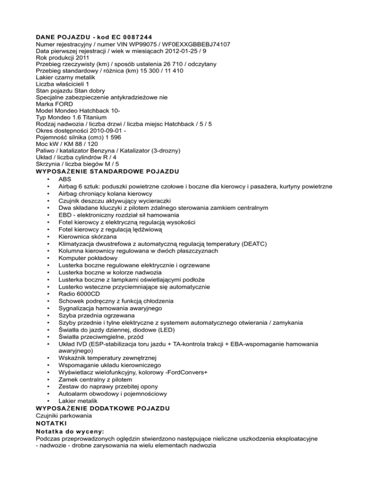 DANE POJAZDU - kod EC 0 0 8 7 2 4 4 Numer rejestracyjny / numer VIN WP99075 / WF0EXXGBBEBJ74107 Data pierwszej rejestracji / wiek w miesiącach 2012-01-25 / 9 Rok produkcji 2011 Przebieg rzeczywisty (km) / sposób ustalenia 26 710 / odczytany Przebieg standardowy / różnica (km) 15 300 / 11 410 Lakier czarny metalik Liczba właścicieli 1 Stan pojazdu Stan dobry Specjalne zabezpieczenie antykradzieżowe nie Marka FORD Model Mondeo Hatchback 10Typ Mondeo 1.6 Titanium Rodzaj nadwozia / liczba drzwi / liczba miejsc Hatchback / 5 / 5 Okres dostępności 2010-09-01 Pojemność silnika (cm3) 1 596 Moc kW / KM 88 / 120 Paliwo / katalizator Benzyna / Katalizator (3-drozny) Układ / liczba cylindrów R / 4 Skrzynia / liczba biegów M / 5 WYPOSA Ż ENIE STANDARDOWE POJAZDU • ABS • Airbag 6 sztuk: poduszki powietrzne czołowe i boczne dla kierowcy i pasażera, kurtyny powietrzne • Airbag chroniący kolana kierowcy • Czujnik deszczu aktywujący wycieraczki • Dwa składane kluczyki z pilotem zdalnego sterowania zamkiem centralnym • EBD - elektroniczny rozdział sił hamowania • Fotel kierowcy z elektryczną regulacją wysokości • Fotel kierowcy z regulacją lędźwiową • Kierownica skórzana • Klimatyzacja dwustrefowa z automatyczną regulacją temperatury (DEATC) • Kolumna kierownicy regulowana w dwóch płaszczyznach • Komputer pokładowy • Lusterka boczne regulowane elektrycznie i ogrzewane • Lusterka boczne w kolorze nadwozia • Lusterka boczne z lampkami oświetlającymi podłoże • Lusterko wsteczne przyciemniające się automatycznie • Radio 6000CD • Schowek podręczny z funkcją chłodzenia • Sygnalizacja hamowania awaryjnego • Szyba przednia ogrzewana • Szyby przednie i tylne elektryczne z systemem automatycznego otwierania / zamykania • Światła do jazdy dziennej, diodowe (LED) • Światła przeciwmgielne, przód • Układ IVD (ESP-stabilizacja toru jazdu + TA-kontrola trakcji + EBA-wspomaganie hamowania awaryjnego) • Wskaźnik temperatury zewnętrznej • Wspomaganie układu kierowniczego • Wyświetlacz wielofunkcyjny, kolorowy -FordConvers+ • Zamek centralny z pilotem • Zestaw do naprawy przebitej opony • Autoalarm obwodowy i pojemnościowy • Lakier metalik WYPOSA Ż ENIE DODATKOWE POJAZDU Czujniki parkowania NOTATK I Nota t k a do w y c eny: Podczas przeprowadzonych oględzin stwierdzono następujące nieliczne uszkodzenia eksploatacyjne - nadwozie - drobne zarysowania na wielu elementach nadwozia - lusterko zewnętrzne prawe - pkt odpryski lakieru - błotnik tylny prawy - zarysowany w części przedniej u dołu - zderzak tylny - z prawej strony rozlegle pęknięty nieznacznie wgnieciony , porysowany pościerany uszkodzenie pokolizyjne - zakres uszkodzeń możliwy do ustalenia po demontażu zderzaka - wyposażenie kabiny - tapicerka i obicia tapicerskie - nieznaczne zabrudzenia eksploatacyjne - opony kół przednich i tylnych - DUNLOP SP Winter SPORT 205/55 R16 - średnie zużycie eksploatacyjne - jest koło zapasowe dojazdowe Nie stwierdzono podwyższonej grubości powłoki lakierowej nadwozia . Brak książki gwarancyjnej - brak konieczności wykonania przegladu gwarancyjnego niski przebieg jest tylko jeden kpl kluczyków .