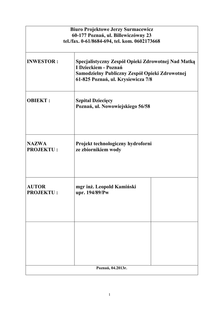 Biuro Projektowe Jerzy Surmacewicz 60-177 Poznań, ul. Billewiczówny 23 tel./fax. 0-61/8684-694, tel. kom. 0602173668 INWESTOR : Specjalistyczny Zespół Opieki Zdrowotnej Nad Matką I Dzieckiem - Poznań Samodzielny Publiczny Zespół Opieki Zdrowotnej 61-825 Poznań, ul. Krysiewicza 7/8 OBIEKT : Szpital Dziecięcy Poznań, ul. Nowowiejskiego 56/58 NAZWA PROJEKTU : Projekt technologiczny hydroforni ze zbiornikiem wody AUTOR PROJEKTU : mgr inż. Leopold Kamiński upr. 194/89/Pw Poznań, 04.2013r. 1 Opis techniczny do projektu budowlanego hydroforni ze zbiornikiem retencyjnym wody pitnej w Szpitalu Dziecięcym w Poznaniu przy ul. Nowowiejskiego ZAWARTOŚĆ OPRACOWANIA I. CZĘŚĆ OPISOWA 1.0. 2.0. 3.0. 4.0. 5.0. Podstawa opracowania. Zakres i Cel opracowania. Opis stanu istniejącego Opis rozwiązania projektowego. 4.1. Określenie parametrów urządzeń. 4.2. Zestaw hydroforowy 4.3. Zbiornik retencyjny 4.4. Fundament pod zbiornik. Uwagi końcowe. II. CZĘŚĆ RYSUNKOWA 1. Rzut pomieszczeń technicznych – hydroforni i pom. ze zbiornikiem rys. nr IS 01 2. Rysunek zbiornika retencyjnego rys. nr IS 02 3. Schemat technologiczny projektowanej instalacji wodociągowej. rys. nr IS 03 4. Schemat zestawu hydroforowego rys. nr IS 04 5. Rysunek fundamentu pod zbiornik rys. nr IS 05 1 Opis techniczny do projektu budowlanego hydroforni ze zbiornikiem retencyjnym wody pitnej w Szpitalu Dziecięcym w Poznaniu przy ul. Nowowiejskiego OPIS TECHNICZNY do projektu budowlanego hydroforni ze zbiornikiem retencyjnym wody pitnej Obiekt: Inwestor: Szpital Dziecięcy w Poznaniu Ul. Nowowiejskiego 56/58 SZOZ Nad Matką i Dzieckiem Poznań SPZOZ, 61-825 Poznań Ul. Krysiewicza 7/8 1.0. Podstawa opracowania: Zlecenie Inwestora podkłady budowlane pomieszczeń technicznych. dane Inwestora – Działu Technicznego – odnośnie zużycia wody na cele socjalne Szpitala Dziecięcego przy ul. Nowowiejskiego 56/58 inwentaryzacja własna dotycząca istniejącej instalacji wodociągowej oraz stanu technicznego istniejącej posadzki w pomieszczeniu technicznym przeznaczonym na lokalizację zbiornika. obowiązujące przepisy, zarządzenia i normy informacja techniczno-technologiczna projektowanych urządzeń Rozporządzenie Ministra Zdrowia i Opieki Społecznej z dnia 21.09.1992 r. (Dz.U.92.74.366) ze zmianami. 2.0. Zakres i cel opracowania Celem opracowania jest zabezpieczenie szpitala w rezerwę wody oraz jej odpowiedniego ciśnienia na wypadek możliwych przerw w dostawie, co umożliwi właściwe i nieprzerwane funkcjonowanie szpitala. Zakres opracowania obejmuje uzupełnienie istniejącej instalacji w zbiornik wody pitnej współpracujący z projektowanym zestawem hydroforowym. 3.0. Opis stanu istniejącego. Szpital Dziecięcy w Poznaniu przy ulicy Nowowiejskiego 56/58 zasilany jest w wodę dwoma przyłączami : od ulicy Spornej, średnica przyłącza 80 mm oraz od ulicy Nowowiejskiego, średnica przyłącza 32 mm. Oba przyłącza są opomiarowane i połączone we wspólną instalację wewnętrzną, zasilającą szpital. Głównym zasilaniem obiektu jest przyłącze wykonane z rur żeliwnych DN80 z wodomierzem sprzężonym typu MW/WS 80/3,5 Powogaz S.A. Poznań, zlokalizowanym w pomieszczeniu przeznaczonym na wodomierz, i w którym odbywa się rozdział instalacji w budynku. Instalacja wody, jako wspólna z instalacją hydrantową, wykonana jest z rur stalowych, ocynkowanych o połączeniach gwintowanych. Średnice hydrantów wewnętrznych umieszczonych w korytarzach budynków, w szafkach stalowych, naściennych wynoszą 52 mm. Ewentualne odcinki instalacji wykonanej z rur tworzywowych (PE lub PP) należy wymienić na rury stalowe, ocynkowane o połączeniach gwintowanych. Szpital nie posiada zbiornika retencyjnego o pojemności zapewniającej 8-godzinne zaopatrzenie obiektu w wodę, sprzężone z urządzeniem hydroforowym. 2 Opis techniczny do projektu budowlanego hydroforni ze zbiornikiem retencyjnym wody pitnej w Szpitalu Dziecięcym w Poznaniu przy ul. Nowowiejskiego 4.0. Opis rozwiązania projektowego. Celem zapewnienia pewności funkcjonowania szpitala projektuje się wpięcie w istniejący układ instalacji wodociągowej zbiornika retencyjnego, napełnianego wodą z istniejącej instalacji oraz współpracującego zestawu hydroforowego. Oba dodatkowe urządzenia zabezpieczać będą szpital w wodę na cele bytowe i p.poż. 4.1. Określenie parametrów urządzeń. Obliczenia zapotrzebowania wody: Z przekazanych danych dotyczących zużycia wody na cele socjalno-bytowe szpitala wynika: - roczne zużycie wody – 6630 m3 - miesięczne zużycie wody – 6630 / 12 = 552,5 m3 - dobowe zużycie wody – 552,5 / 30 = 18,4 m3 - zapotrzebowanie na 8 godzin pracy szpitala: 18,4 / 3 = 6,13 m3 - dodatkowo przyjęto zwiększony zapas o 30% (tj. pojemność użytkowa zbiornika wynosi V uż. = 6,13 x 1,3 = 8,0 m3 Sekundowe zapotrzebowanie wody - na cele socjalno-bytowe wynosi około 2,1 dm3/s - na cele p.poż. Działanie hydrantu p.poż. DN50 – 2,5 dm3/s Wartość ta tj. 2,5 dm3/s limituje sekundowe zapotrzebowanie wody. Obliczenie minimalnego wymaganego ciśnienia za zestawem. - wysokość budynku – około 14,65 m - wysokość słupa wody na prądownicy – 10,00 m Razem: 24,65 m sł. wody 4.2. Zestaw hydroforowy. − − − − Parametry doboru: Maksymalna wymagana wydajność zestawu na cele bytowe i p. poż.: Qmax = 18 m3/h, Minimalne wymagane ciśnienie za zestawem: pmin = 4,5 bara, Zasilanie zestawu ze zbiornika retencyjnego z grawitacyjnym napływem wody na pompy zestawu Tłoczona ciecz: woda czysta, bez zanieczyszczeń (bez cząstek stałych i długowłóknistych), nieagresywna chemicznie Przyjęto, że w hydroforni zamontowany będzie zestaw hydroforowy kompaktowy - konstrukcja: pionowe, wielostopniowe, wysokosprawne. Ze względu na trwałość pompy, części pomp, takie jak: płaszcz, podstawa, wirniki, wał, komora powinny być wykonane ze stali kwasoodpornej. Zestaw składał się będzie z dwóch pomp główny