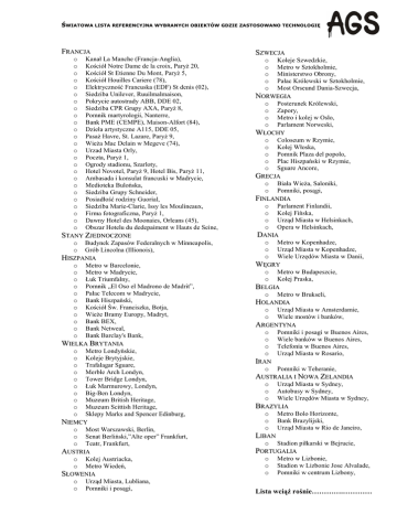 ŚWIATOWA LISTA REFERENCYJNA WYBRANYCH OBIEKTÓW GDZIE ZASTOSOWANO TECHNOLOGIĘ FRANCJA SZWECJA o Kanał La Manche (Francja-Anglia), o Kościół Notre Dame de la croix, ParyŜ 20, o Kościół St Etienne Du Mont, ParyŜ 5, o Kościół Houilles Cariere (78), o Elektryczność Francuska (EDF) St denis (02), o Siedziba Unilever, Ruuilmalmaison, o Pokrycie autostrady ABB, DDE 02, o Siedziba CPR Grupy AXA, ParyŜ 8, o Pomnik martyrologii, Nanterre, o Bank PME (CEMPE), Maison-Alfort (84), o Dzieła artystyczne A115, DDE 05, o PasaŜ Havre, St. Lazare, ParyŜ 9, o WieŜa Mac Delain w Megeve (74), o Urzad Miasta Orly, o Poczta, ParyŜ 1, o Ogrody stadionu, Szarloty, o Hotel Novotel, ParyŜ 9, Hotel Bis, ParyŜ 11, o Ambasada i konsulat francuski w Madrycie, o Medioteka Bulońska, o Siedziba Grupy Schneider, o Posiadłość rodziny Guorial, o Siedziba Marie-Clarie, Issy les Moulineaux, o Firma fotograficzna, ParyŜ 1, o Dawny Hotel des Moonaies, Orleans (45), o Obszar Hotelu du dedepaiment w Hauts de Seine, STANY ZJEDNOCZONE o Budynek Zapasów Federalnych w Minneapolis, o Grób Lincolna (Illionois), HISZPANIA o Metro w Barcelonie, o Metro w Madrycie, o Łuk Triumfalny, o Pomnik „El Oso el Madrono de Madrit”, o Pałac Telecom w Madrycie, o Bank Hiszpański, o Kościół Św. Franciszka, Botja, o WieŜe Bramy Europy, Madryt, o Bank BEX, o Bank Netweal, o Bank Barclay's Bank, WIELKA BRYTANIA o Metro Londyńskie, o Koleje Brytyjskie, o Trafalagar Sguare, o Merble Arch Londyn, o Tower Bridge Londyn, o Łuk Marmurowy, Londyn, o Big-Ben Londyn, o Muzeum British Heritage, o Muzeum Scittish Heritage, o Sklepy Marks and Spencer Edinburg, NIEMCY o Most Warszawski, Berlin, o Senat Berliński,”Alte oper” Frankfurt, o Teatr, Frankfurt, AUSTRIA o Kolej Austriacka, o Metro Wiedeń, SŁOWENIA o Urząd Miasta, Lubliana, o Pomniki i posągi, o Koleje Szwedzkie, o Metro w Sztokholmie, o Ministerstwo Obrony, o Pałac Królewski w Sztokholmie, o Most Orseund Dania-Szwecja, NORWEGIA o Posterunek Królewski, o Zapory, o Metro i kolej w Oslo, o Parlament Norweski, WŁOCHY o Coloseum w Rzymie, o Kolej Włoska, o Pomnik Plaza del popolo, o Plac Hiszpański w Rzymie, o Sguare Ancore, GRECJA o Biała WieŜa, Saloniki, o Pomniki, posągi, FINLANDIA o Parlament Finlandii, o Kolej Fińska, o Urząd Miasta w Helsinkach, o Opera w Helsinkach, DANIA o Metro w Kopenhadze, o Urząd Miasta w Kopenhadze, o Wiele Urzędów Miasta w Danii, WĘGRY o Metro w Budapeszcie, o Kolej Praska, BELGIA o Metro w Brukseli, HOLANDIA o Urząd Miasta w Amsterdamie, o Wiele mostów i banków, ARGENTYNA o Pomniki i posagi w Buenos Aires, o Wiele banków w Buenos Aires, o Telefonia w Buenos Aires, o Urząd Miasta w Rosario, IRAN o Pomniki w Teheranie, AUSTRALIA I NOWA ZELANDIA o Urząd Miasta w Sydney, o Autobusy w Sydney, o Wiele Urzędów Miasta w Sydney, BRAZYLIA o Metro Bolo Horizonte, o Bank Brazylijski, o Urząd Miasta w Rio de Janeiro, LIBAN o Stadion piłkarski w Bejrucie, PORTUGALIA o Metro w Lizbonie, o Stadion w Lizbonie Jose Alvalade, o Pomniki w centrum Lizbony, Lista wciąŜ rośnie………….…………