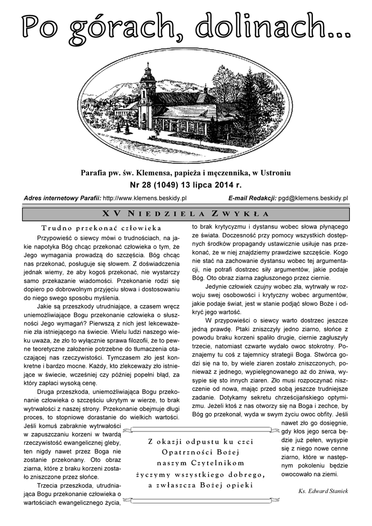 Parafia pw. św. Klemensa, papieża i męczennika, w Ustroniu Nr 28 (1049) 13 lipca 2014 r. Adres internetowy Parafii: http://www.klemens.beskidy.pl X V I E D Z I E L A E-mail Redakcji: [email protected] Z W Y K Ł A to brak krytycyzmu i dystansu wobec słowa płynącego ze świata. Doczesność przy pomocy wszystkich dostępPrzypowieść o siewcy mówi o trudnościach, na janych środków propagandy ustawicznie usiłuje nas przekie napotyka Bóg chcąc przekonać człowieka o tym, że konać, że w niej znajdziemy prawdziwe szczęście. Kogo Jego wymagania prowadzą do szczęścia. Bóg chcąc nie stać na zachowanie dystansu wobec tej argumentanas przekonać, posługuje się słowem. Z doświadczenia cji, nie potrafi dostrzec siły argumentów, jakie podaje jednak wiemy, że aby kogoś przekonać, nie wystarczy Bóg. Oto obraz ziarna zagłuszonego przez ciernie. samo przekazanie wiadomości. Przekonanie rodzi się Jedynie człowiek czujny wobec zła, wytrwały w rozdopiero po dobrowolnym przyjęciu słowa i dostosowaniu woju swej osobowości i krytyczny wobec argumentów, do niego swego sposobu myślenia. jakie podaje świat, jest w stanie podjąć słowo Boże i odJakie są przeszkody utrudniające, a czasem wręcz kryć jego wartość. uniemożliwiające Bogu przekonanie człowieka o słuszW przypowieści o siewcy warto dostrzec jeszcze ności Jego wymagań? Pierwszą z nich jest lekceważejedną prawdę. Ptaki zniszczyły jedno ziarno, słońce z nie zła istniejącego na świecie. Wielu ludzi naszego wiepowodu braku korzeni spaliło drugie, ciernie zagłuszyły ku uważa, że zło to wyłącznie sprawa filozofii, że to pewtrzecie, natomiast czwarte wydało owoc stokrotny. Pone teoretyczne założenie potrzebne do tłumaczenia otaznajemy tu coś z tajemnicy strategii Boga. Stwórca goczającej nas rzeczywistości. Tymczasem zło jest kondzi się na to, by wiele ziaren zostało zniszczonych, pokretne i bardzo mocne. Każdy, kto zlekceważy zło istnienieważ z jednego, wypielęgnowanego aż do żniwa, wyjące w świecie, wcześniej czy później popełni błąd, za sypie się sto innych ziaren. Zło musi rozpoczynać niszktóry zapłaci wysoką cenę. czenie od nowa, mając przed sobą jeszcze trudniejsze Druga przeszkoda, uniemożliwiająca Bogu przekozadanie. Dotykamy sekretu chrześcijańskiego optyminanie człowieka o szczęściu ukrytym w wierze, to brak zmu. Jeżeli ktoś z nas otworzy się na Boga i zechce, by wytrwałości z naszej strony. Przekonanie obejmuje długi Bóg go przekonał, wyda w swym życiu owoc obfity. Jeśli proces, to stopniowe dorastanie do wielkich wartości. nawet zło go dosięgnie, Jeśli komuś zabraknie wytrwałości gdy kłos jego serca bęw zapuszczaniu korzeni w twardą dzie już pełen, wysypie Z okazji odpustu ku czci rzeczywistość ewangelicznej gleby, się z niego nowe cenne ten nigdy nawet przez Boga nie Opatrzności Bożej ziarno, które w następzostanie przekonany. Oto obraz naszym Czytelnikom nym pokoleniu będzie ziarna, które z braku korzeni zostaowocowało na ziemi. ż y c z y m y w s z y s t k i e g o d o b r e g o , ło zniszczone przez słońce. Trudno przekonać człowieka Trzecia przeszkoda, utrudniająca Bogu przekonanie człowieka o 13 lipca 2014 r. wartościach ewangelicznego życia, a zwłaszcza Bożej opieki Ks. Edward Staniek PO GÓRACH, DOLIACH... 1 Z ŻYCIA P ARAFI i w OKRESIE 31. 03. 2014 - 30. 06. 2014 - Kotela Mariusz i Pieńkowska Sylwia Maja; - Juroszek Edward i Puchała Monika; - Wojtek Rafał Krzysztof i Trybalska Justyna; - Rozkoszny Oliwier Wojciech; - Szeja Lena Maja; - Ogonowski Aleks Julian; - Ciemała Wiktor Leszek; - Matuszka Ignacy Józef; - Podżorski Franciszek Andrzej; - Wisełka Regina; - Zakaszewska-Dziaczko Melania; - Stefański Maksymilian; - Uchrońska Maria; - Sikora Krystyna; - Bojarowski Edward Paweł; - Hladky Wanda; - Błahut Klemens; - Bojarowski Tomasz Władysław; - Sroka Tomasz; - Lipowczan Jadwiga; - Podsiadło Stanisław; - Janeczko Bronisława; - Duda Jan; - Wajdzik Aniela; - Kuczera Józef Michał; - Lisowski Mieczysław KWIATKI PAPIEŻA FRA CISZKA Czy wiecie, że?... Papież Franciszek napisał : „Otrzymawszy pokrzepienie i pocieszenie od Chrystusa, jesteśmy wezwani do tego, by samemu stać się pocieszeniem i pokrzepieniem dla braci, poprzez postawę cichą i pokorną, na wzór Mistrza'”. 13 lipca 2014 r. Spowiednicy - ciąg dalszy Bardziej istotną od sędziowskiej, jest funkcja spowiednika jako lekarza duszy, bo jak twierdzi Jan Paweł II, człowiek współczesny oprócz błędów dostrzega w grzechach słabość i niemoc ludzką. Jako duchowy lekarz, kapłan musi poznać słabość i chorobę duszy penitenta, aby mógł zastosować odpowiednią terapię i zachęcić go do podjęcia czasem trudnego i bolesnego leczenia. W tej funkcji spowiednik jest niejako naczyniem, przez które przepływa lecznicza moc Boża, dlatego przede wszystkim ma umożliwić penitentowi doświadczenie zbawczej obecności Chrystusa, który pragnie go uzdrowić z choroby ducha. Może tego dokonać przez sam fakt sprawowania liturgii pokuty tak, aby spowiedź stała się uwielbieniem Boga. Służy temu traktowanie penitenta ze stanowczością wobec grzechu który go rani, ale i z dobrocią wzorowaną na Chrystusie, wniesienie w życie penitenta światła Bożego, które umożliwi mu głębokie poznanie prawdy o sobie i swojej winie oraz uzdolni go do podjęcia decyzji nawrócenia. W tej funkcji lekarza duszy zawiera się też funkcja nauczycielska. Obrzędy Pokuty mówią, że spowiednik powinien udzielać penitentowi rad do rozpoczęcia nowego życia oraz pouczyć go o obowiązkach życia chrześcijańskiego. Sakrament pokuty to jedno z uprzywilejowanych miejsc, w których człowiek przyjmuje dogłębnie słowa Pana. W tym sakramencie słowo Boże staje się szczególnie żywe i odpowiadające wymogom konkretnego penitenta. Kapłan pełniący obowiązek szafarza sakramentu pokuty musi zawsze pamiętać