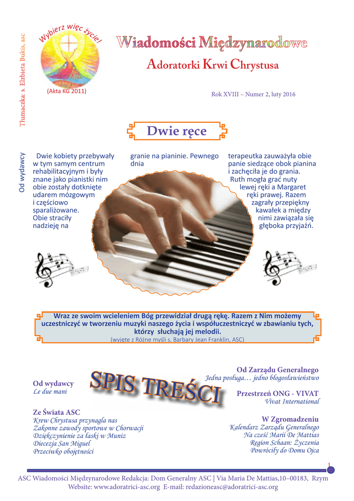 Tłumaczka: s. Elzbieta Bukis, asc Od wydawcy rz więc ży ci e! ie yb W Adoratorki Krwi Chrystusa (Akta KG 2011) Rok XVIII – Numer 2, luty 2016 Dwie ręce Dwie kobiety przebywały w tym samym centrum rehabilitacyjnym i były znane jako pianistki nim obie zostały dotknięte udarem mózgowym i częściowo sparaliżowane. Obie straciły nadzieję na granie na pianinie. Pewnego dnia terapeutka zauważyła obie panie siedzące obok pianina i zachęciła je do grania. Ruth mogła grać nuty lewej ręki a Margaret ręki prawej. Razem zagrały przepiękny kawałek a między nimi zawiązała się głęboka przyjaźń. Wraz ze swoim wcieleniem Bóg przewidział drugą rękę. Razem z Nim możemy uczestniczyć w tworzeniu muzyki naszego życia i współuczestniczyć w zbawianiu tych, którzy słuchają jej melodii. (wyjęte z Różne myśli s. Barbary Jean Franklin, ASC) Od wydawcy Le due mani SPIS TRE Ze Świata ASC Krew Chrystusa przynagla nas Zakonne zawody sportowe w Chorwacji Dziękczynienie za łaski w Muniz Diecezja San Miguel Przeciwko obojętności Od Zarządu Generalnego Jedna posługa… jedno błogosławieństwo ŚCI Przestrzeń ONG - VIVAT Vivat International W Zgromadzeniu Kalendarz Zarządu Generalnego Na cześć Marii De Mattias Region Schaan: Życzenia Powróciły do Domu Ojca 1 ASC Wiadomości Międzynarodowe Redakcja: Dom Generalny ASC | Via Maria De Mattias,10–00183, Rzym Website: www.adoratrici-asc.org E-mail: [email protected] Ze Świata ASC Obszar Kontynentalny: Europa Region: Wrocław Krew Chrystusa przynagla nas Nowennę przed jubileuszem 50 lecia powstania świadkami. Te nowe obrazy i wyrażenia stały naszej Prowincji zakończyłyśmy 12 grudnia 2015 się umocnieniem dla projektów zrodzonych z roku na Jasnej Górze, włączając się w sympozjum refleksji na te tematy”. z okazji jubileuszu 200-lecia założenia Następnie s. Wiesława Przybyło ASC podzieliła Zgromadzenia Misjonarzy Krwi Chrystusa. W tym się refleksjami na temat: „Na chwałę Boskiej”. sympozjum uczestniczyły także osoby świeckie, Maria De Mattias i Misjonarze Krwi Chrystusa. żyjące duchowością Krwi Chrystusa. W swojej konferencji podkreśliła, że „w bardzo Sympozjum rozpoczęło się od Mszy św. delikatnym momencie duchowego dojrzewania odprawionej o godz. 14.00 w Bazylice Marii De Mattias, Bóg posyła jej Kaspra. jasnogórskiej. Eucharystii przewodniczył i Ukrzyżowany – to punkt, na który Kasper homilię wygłosił ksiądz arcybiskup Wacław Depo, skierował młodzieńczą i gorącą miłość młodej metropolita częstochowski, a koncelebrowali Marii De Mattias. Jej serce już od tej pory z nim m.in. ksiądz William Nordenbrock, należy tylko do jednej, jedynej miłości jej życia, moderator generalny Misjonarzy Krwi Chrystusa, do Jezusa Ukrzyżowanego, który za nas wylał ksiądz Emanuele Lupi, wicemoderator swoją Boską Krew. Spotkanie z Kasprem w 1822 generalny i ksiądz Wojciech Czernatowicz roku, które zasiało ziarno na glebie serca Marii, prowincjał Misjonarzy Krwi Chrystusa oraz wielu zaowocowało jeszcze w jeden sposób – była to współbraci. gorliwość o zbawienie Ksiądz arcybiskup dusz drogich bliźnich, Wacław Depo homilię za które Jezus przelał poświęcił tajemnicy całą swoją Krew. Aby Krwi Chrystusa i ziarno mogło wzrastać, tekstom liturgicznym. a Maria mogła Powiedział: „Wierzymy rozpoznać w sobie bowiem, że to właśnie powołanie kobiety Krew Jezusa Chrystusa misjonarki, założycielki jako niepokalanego i przewodniczki Baranka Bożego, zgromadzenia skazanego na śmierć oddanego Krwi przez Piłata stanie się Chrystusa, najgłębszą prawdą o potrzebowała pomocy Bożym miłosierdziu w rozeznawaniu wobec człowieka Bożego. Na jej S. Wiesława Przybyło ASC drodze Bóggłosu wszystkich czasów i jednocześnie postawił innego źródłem miłości zbawczej. Krzyż Zbawiciela misjonarza Giovanniego Merliniego. Zawarte postawiony na Golgocie mówi o bezmiarze w dokumentach treści pozwalają stwierdzić, daru, jakim jest tajemnica pojednania Boga ze że spośród misjonarzy Przenajdroższej światem i Boga z człowiekiem w świecie”. Krwi, Giovanni Merlini był najwierniejszym Po Mszy św. odbyło się sympozjum prowadzone towarzyszem duchowym na drodze Marii przez CPPS, podczas którego konferencję De Mattias, którą Duch Święty natchnął do wygłosił ks. Emanuele Lupi, na temat Rozwój założenia nowego Zgromadzenia w Kościele na charyzmatu Misjonarzy Krwi Chrystusa. W tej chwałę Boskiej Krwi. On wspierał ją w przyjęciu konferencji zaakcentował: „że Krew ludzka powołania do bycia Założycielką i pomagał w i Boska przelana przez Jezusa na Krzyżu to formacji pierwszej grupy adoratorek. Dzięki Krew Nowego Przymierza, Krew przebłagania, niemu Maria od początku miała jasną wizję przelana raz na zawsze. Krew stwarzająca bliską dzieła, które tworzyła oraz jego tożsamości – komunię między Bogiem, a ludzkością. Ta Krew wiedziała że zakłada je „dla zbawienia dusz i na jest dla Misjonarzy Krwi Chrystusa źródłem życia chwałę Przenajdroższej Krwi”. i misji. Częścią języka zgromadzenia stały się Natomiast ks. William Nordenbrock w nowe obrazy i wyrażenia, takie jak: Przymierze, wygłoszonej konferencji na temat „Pojednanie Krzyż, Kielich, Pojednanie i krzyk Krwi Chrystusa, przez Krew” powiedział, że „Krew Chrystusa które przyczyniają się do bycia głosicielami i wybawia nas i przenosi nas w intymną wieź 2 ASC Wiadomości Międzynarodowe Redakcja: Dom Generalny ASC | Via Maria De Mattias,10–00183, Rzym Website: www.adoratrici-asc.org E-mail: [email protected] Ze Świata ASC z Bogiem. Ma moc pojednania zarówno w aspekcie indywidualnym, jak i społecznym. Jesteśmy ambasadorami Jezusa. Naszym zadaniem jest przesłanie pojednania. Mamy swoją obecnością wnosić pokój i pojednanie. Wszystko ma swój początek w miłosierdziu”. Następnym prelegentem był ks. 