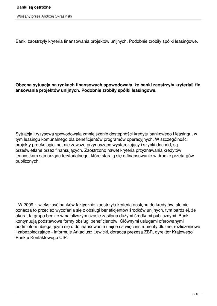 Banki są ostrożne Wpisany przez Andrzej Okrasiński Banki zaostrzyły kryteria finansowania projektów unijnych. Podobnie zrobiły spółki leasingowe. Obecna sytuacja na rynkach finansowych spowodowała, że banki zaostrzyły kryteria fin ansowania projektów unijnych. Podobnie zrobiły spółki leasingowe. Sytuacja kryzysowa spowodowała zmniejszenie dostępności kredytu bankowego i leasingu, w tym leasingu komunalnego dla beneficjentów programów operacyjnych. W szczególności projekty proekologiczne, nie zawsze przynoszące wystarczający i szybki dochód, są prześwietlane przez finansujących. Zaostrzono nawet kryteria przyznawania kredytów jednostkom samorządu terytorialnego, które starają się o finansowanie w drodze przetargów publicznych. - W 2009 r. większość banków faktycznie zaostrzyła kryteria dostępu do kredytów, ale nie oznacza to przecież wycofania się z obsługi beneficjentów środków unijnych, tym bardziej, że akurat ta grupa będzie w najbliższym czasie zasilana dużymi środkami publicznymi. Banki kontynuują podstawowe formy obsługi beneficjentów. Głównymi usługami oferowanymi podmiotom ubiegającym się o dofinansowanie unijne są więc instrumenty dłużne, rozliczeniowe i zabezpieczające - informuje Arkadiusz Lewicki, doradca prezesa ZBP, dyrektor Krajowego Punktu Kontaktowego CIP. 1/6 Banki są ostrożne Wpisany przez Andrzej Okrasiński Dynamika kredytowa Mimo tych obietnic, dynamika akcji kredytowania projektów unijnych w 2008 r. była niewielka. Ale było to spowodowane również niską jeszcze dynamiką wdrażania działań inwestycyjnych. Banki, szczególnie komercyjne, prowadzą akcję informowania potencjalnych beneficjentów o formach współpracy przy realizacji inwestycji. Większość banków komercyjnych obok kredytów oferuje jednostkom samorządowym obligacje komunalne, a przedsiębiorstwom nieskarbowe papiery dłużne. Podobnie firmy leasingowe oferują np. gminom leasing komunalny i leasing zwrotny. Ten ostatni jest oferowany także przedsiębiorstwom. Banki i firmy leasingowe mimo spowolnienia gospodarczego będą musiały zwiększyć akcję promocyjną w tym zakresie oraz akcję szkoleniową własnych kadr, szczególnie w zakresie bardzo skomplikowanych procedur aplikowania przy inwestycjach proekologicznych. To są poważne koszty tych instytucji, ponoszone na szkolenie kadr. A nie jest oczywiste, czy na takich typach inwestycji kadrowych można zarobić. Większość banków twierdzi, że obsługa finansowa projektów unijnych powoduje wyższe koszty niż np. koszty, jakie istnieją przy zwykłych kredytach inwestycyjnych. Natomiast przychody i zyski z kredytu „unijnego" są mniejsze. Głównym powodem takich kosztów są, obok wewnętrznej konkurencji, także wymogi stawiane beneficjentom przez prawo, procedury aplikacyjne i przez administrację oraz instytucje obsługujące programy operacyjne. Beneficjent musi pozyskać finansowanie (także udział własny) o określonym poziomie oprocentowania i o określonych wielkościach prowizji. Te czynniki oraz zmniejszenie podaży kapitału na międzybankowym rynku krajowym i europejskim powodują, że instytucje finansowe, mając do wyboru, wybierają finansowanie inwestycji 2/6 Banki są ostrożne Wpisany przez Andrzej Okrasiński niezasilanych dotacjami unijnymi. Bankowcy, w szczególności przy staraniu się o kredyt na proekologiczne przedsięwzięcia unijne, muszą również ocenić i zrecenzować projekt. A na to trzeba poświęcić czas. I nie jest pewne, czy potencjalny beneficjent skorzysta z usług lub czy kredyt zostanie mu przyznany. Jest to ryzyko kosztowe. Koniunktura i ryzyko kredytowe Banki i instytucje leasingowe zmieniły politykę finansowania projektów unijnych, ponieważ w zasadzie brak jest wiarygodnych analiz wobec przyszłego stanu koniunktury. Trudno obecnie przewidzieć, jak będzie rozwijała się gospodarka, nawet do końca tego roku, a jeszcze trudniej na kilka lat. Utrudnia to poprawną wycenę ryzyka kredytowego. Instytucje finansowe odmawiają kredytowania projektów, które nie przynoszą przychodu na podstawie ocen obecnego stanu koniunktury w branży, w której działa wnioskodawca kredytowy. Spadek przychodów, nieuregulowane zobowiązania, zagrożenie upadłością, jakie nękają niektóre branże wytwórcze, częściowo: motoryzacyjną, meblarską, tworzyw sztucznych, powoduje, że dostęp do finansowania może być utrudniony. 3/6 Banki są ostrożne Wpisany przez Andrzej Okrasiński W zasadzie kredyty i leasing, finansujący przedsięwzięcia unijne, w tym projekty proekologiczne, to stosunkowo wysoki stopień spłacalności w terminie pożyczonego kapitału z odsetkami. Mimo to żądania dodatkowych zabezpieczeń takiego wsparcia zwiększyły się w 2009 r. Optymalne zabezpieczenie tego typu kredytów powinno być gwarancją instytucji wdrażającej lub instytucji pośredniczącej w postaci promesy dofinansowania. Dobrze się dzieje z takimi zabezpieczeniami, gdy projekt jest dofinansowany w ramach krajowych programów operacyjnych. O wiele gorzej jest niestety z projektami aplikowanymi w ramach Regionalnych Programów Operacyjnych. W ostatnim przypadku beneficjent często musi odejść z kwitkiem, bo promesa nie jest udzielana. A to z kolei powoduje, że beneficjent często z tego powodu może nie otrzymać kredytu bankowego lub innego finansowania. Z drugiej strony instytucje zarządzające RPO w większości przypadków nie oferują zaliczek, tylko udzielają dotacji w formie refundacji poniesionych kosztów. Cofnięcie promesy Banki i inne instytucje finansowe mają prawo cofnięcia promesy finansowania przedsięwzięcia unijnego, gdy: - ujawnione zostaną okoliczności, że przyznana była na podstawie nieprawdziwych danych; - w okresie ważności promesy zaszły prawne i merytoryczne podstawy do uznania, że wnioskodawca stracił zdolność kredytową; - jeżeli beneficjent realizuje przedsięwzięcie niezgodnie z ha