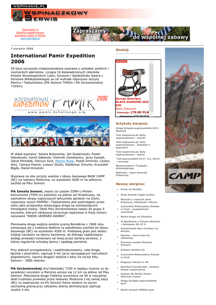 Zapraszam w Sokoliki,najpiękniejsze granitowe skały w Polsce www.blondas.pl 7 sierpnia 2006 Szukaj: International Pamir Expedition 2006 28 lipca wyruszyła międzynarodowa wyprawa z udziałem polskich i niemieckich alpinistów. Licząca 16 doświadczonych członków Klubów Wysokogórskich Lubin, Szczecin i Speleoklubu Gawra z Gorzowa Wielkopolskiegop za cel wybrała najwyższe szczyty Pamiru i Tadżykistanu (Pik Somoni 7495m i Pik Korżeniewskiej 7105m). Uprząż dziecięca BLACK DIAMOND WIZ KID Black Diamond Promocja: 179.00 PLN Stara cena: 199.00 PLN Artykuły sierpnia: Kinga Ociepka poprowadziła 8c!!! Wywiad Test wspinania.pl: Buty wspinaczkowe - wyniki Test wspinania.pl, buty wspinaczkowe - Dodatek o asymetrii W skład wyprawy: Sylwia Bukowicka, Jan Dudarowski, Paweł Sokołowski, Kamil Gabarski, Dominik Ziembowicz, Jerzy Kawiak, Jakub Michalak, Dariusz Szut, Marcin Miotk, Paweł Zimnicki, Cezary Woś, Tomasz Pawski, Łukasz Stocki, Waldemar Żmurko, Krzysztof Bigda, Daniel Kreutzer. Wyprawa na oba szczyty wiedzie z obozu bazowego BASE CAMP (BC) na lodowcu Moskvina, na wysokości 4200 m na północny zachód od Piku Somoni. Test wspinania.pl, Buty wspinaczkowe - opinie "Jak poprowadzić VI.4", E.J. Hörst - recenzja Wspomnienia z Tryptyku Himalajskiego McKinley - dach Ameryki Północnej Newsy sierpnia: · Prace na Polniku · Siula Grande ciągle trudna · Nowości z naszych skał: Kobylany, Półrzeczki i Wrzos · Juniorskie Mistrzostwa Świata w Imst - uzupełnienie czasówek · Nowa droga na Chojniku · II Spotkania z Filmem Górskim - Zakopane 20-22 X · Powtórzenie Max Cavalery na Mnichu · Manolo - stara buła nie rdzewieje · Pierwsza polska Śnieżna Pantera Przy dobrym przygotowaniu i zaaklimatyzowaniu, cała droga, łącznie z powrotem, zajmuje 6 dni (przy sprzyjających warunkach pogodowych). Łączna długość wejścia z bazy na szczyt Piku Somoni - 2900 metrów. · Kolejne włoskie 9a · Juniorskie Mistrzostwa Świata w Imst · Magazyn Górski nr 40 Pik Korżeniewskiej (Kul-Santalak) 7105 m będący trzecim co do wysokości szczytem w Pamirze wznosi się 12 km na północ od Piku Somoni. Planowana droga Tsetkina wyceniana na 5A w rosyjskiej skali trudności prowadzi przez lodowiec Moskvina z tej samej bazy (BC) co wspinaczka na Pik Somoni Samo wejście na szczyt zachodnią granią przy założeniu dobrej aklimatyzacji zajmuje zwykle 4 dni. · Manifest Czystej Siły - kolejny klasyk wyposażony · Kolejne 8c Maćka Oczko (Marmot Team) · Kinga Ociepka poprowadziła 8c!!! · Garść nowych DDSów pod Pik Ismaila Somoni, zwany za czasów ZSRR-u Pikiem Komunizma (7495 m) położony na północ od Hindukuszu, na zachodnim skraju najwyższych łańcuchów górskich na Ziemi, najwyższy szczyt PAMIRU i Tadżykistanu jest postrzegany przez wielu jako przepustka otwierająca drogę na ośmiotysięczne himalajskie kolosy. Obok Piku Korżeniewskiej należy do grupy 5 szczytów, których zdobywca otrzymuje najwyższe w Rosji honory nazywane "SNOW LEOPARD AWARD". Planowana droga wejścia wiedzie granią Borodkina z 1968 roku wznoszącą się z Lodowca Waltera na południowy wschód od obozu bazowego (BC) na wysokości 4200 m. Podstawą grani jest skalny trójkąt narażony na lawiny kamienne, do którego najłatwiejszy dostęp prowadzi trawersem od lewej przez barierę seraków, z której regularnie schodzą lawiny i spadają kamienie. Dokładny opis ekspedycji, członków, poszczególnych dróg i obozów a takżę relacje z wyprawy dostępne na oficjalnej stronie internetowej www.pamir.4challenge.org. Komentarze: Brak komentarzy Dodaj swój wątek Krakowem i nie tylko · Saduś - trzecie powtórzenie · Max Cavalera - zrównoważona kombinacja na Mnichu · Góry 146 - numer specjalny fotoedycja · Arco Rock Legends nominacje · David Lama w Yosemitach · Solówki Deana Pottera · Ekipa Polish Karakoram Expedition - Pakistan 2006 już w Islamabadzie · Ryszard Bocian na Piku Lenina · Ekstremy z Antypodów · Sylwia Bukowicka zdobyła Pik Korżeniewskiej · Jacek Teler o tragedii na K2 · Marcin Miotk i Jerzy Kawiak na Piku Kommunizma · Kilian Fischhuber ekstremalnie z liną i crashpadem · Nowości na Kołoczku · Tragedia na K2 · Lurgorri - nowa droga braci Pou · Jacek Teler - żywioł to nie automat do Coca-Coli · Wypadek Anny Czerwińskiej · Rodellar - stary czy młody, każdy orze jak może... · Mateusz Haładaj na Frankenjurze · Puchar Świata na trudność w Kuala Lumpur · 10-latek na Chińskim Maharadży! · Anna i Jacek jeszcze walczą · Lois i Ondra trzymają poziom · Smoleń, Udórz - nowości · Yeti na północnej ścianie Eigeru · Marcin Miotk i Jerzy Kawiak na Piku Korżeniewskiej · Nowości w Tyńcu i Dolinie Wrzosy · Kolejna droga w masywie Huanstan · Burzowe Dolomity Moniki i Pawła · Deep Water Flowera · Escalada Marmot Junior Team w Céüse i Orpierre · Rodellar 2006 - cz. I · Nowe 9a Alexa Chabot < International Pamir Expedition 2006 · Nowa droga na Longmum Tower · Puchar Świata na trudność w Singapurze · Ukraińska niespodzianka · Jacek Teler walczy na K2 · Włosi na dziewiczych ścianach Peru · Cho Oyu Expedition 2006 Jastrzębski Klub Wysokogórski · Jacek Teler atakuje K2 · Włosi na K2 - kolejny ośmiotysięcznik dla Meroi · Reticent Wall najszybciej