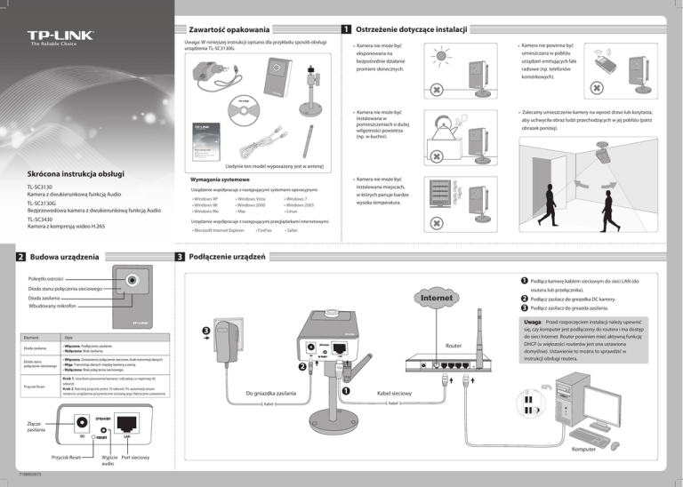 1 Ostrzeżenie dotyczące instalacji Zawartość opakowania Uwaga: W niniejszej instrukcji opisano dla przykładu sposób obsługi urządzenia TL-SC3130G. • Kamera nie powinna być • Kamera nie może być eksponowana na umieszczana w pobliżu bezpośrednie działanie urządzeń emitujących fale promieni słonecznych. radiowe (np. telefonów komórkowych). • Zalecamy umieszczenie kamery na wprost drzwi lub korytarza, • Kamera nie może być instalowana w pomieszczeniach o dużej wilgotności powietrza (np. w kuchni). aby uchwyciła obraz ludzi przechodzących w jej pobliżu (patrz obrazek poniżej). Skrócona instrukcja obsługi TL-SC3130 Kamera z dwukierunkową funkcją Audio TL-SC3130G Bezprzewodowa kamera z dwukierunkową funkcją Audio TL-SC3430 Kamera z kompresją wideo H.265 (Jedynie ten model wyposażony jest w antenę) Skrócona instrukcja obsługi TL-SC3130 Kamera z dwukierunkową funkcją Audio Wymagania systemowe • Kamera nie może być instalowana miejscach, Urządzenie współpracuje z następującymi systemami operacyjnymi: • Windows Vista • Windows 2000 • Mac w których panuje bardzo TL-SC3130G Bezprzewodowa kamera z dwukierunkową funkcją Audio • Windows XP • Windows 98 • Windows Me TL-SC3430 Kamera z kompresją wideo H.265 Urządzenie współpracuje z następującymi przeglądarkami internetowymi: • Microsoft Internet Explorer 2 Budowa urządzenia • FireFox • Windows 7 • Windows 2003 • Linux wysoka temperatura. • Safari 3 Podłączenie urządzeń Pokrętło ostrości 1 Dioda stanu połączenia sieciowego routera lub przełącznika). Internet Dioda zasilania Wbudowany mikrofon 3 Element Opis DC Dioda stanu połączenia sieciowego Przycisk Reset Router SPEAKER • Włączona. Podłączono zasilanie. • Wyłączona. Brak zasilania. Dioda zasilania Podłącz kamerę kablem sieciowym do sieci LAN (do • Włączona. Zestawiono połączenie sieciowe, brak transmisji danych. LAN Podłącz zasilacz do gniazdka DC kamery. Podłącz zasilacz do gniazda zasilania. Uwaga:Przed rozpoczęciem instalacji należy upewnić się, czy komputer jest podłączony do routera i ma dostęp do sieci Internet. Router powinien mieć aktywną funkcję DHCP (u większości routerów jest ona ustawiona domyślnie). Ustawienie to można to sprawdzić w instrukcji obsługi routera. 2 • Miga. Transmisja danych między kamerą a siecią. • Wyłączona. Brak połączenia sieciowego. Krok 1. Uruchom ponownie kamerę i odczekaj co najmniej 45 sekund. Krok 2. Naciśnij przycisk przez 10 sekund. Po automatycznym restarcie urządzenia przywrócone zostaną jego fabryczne ustawienia. RESET 2 3 Do gniazdka zasilania Kabel 1 Kabel sieciowy Kabel SPEAKER Złącze zasilania DC RESET LAN Komputer Przycisk Reset 7106503573 Wyjście Port sieciowy audio 4 Instalacja oprogramowania 5 Konfiguracja komputera 33 Pojawi się okno kreatora Intelligent IP Installer. 1 Włóż do napędu CD-ROM płytę CD znajdującą się w opakowaniu Aby kontynuować, naciśnij przycisk "Next". produktu. Dla przykładu opisano konfigurację z wykorzystaniem przeglądarki IE w systemie Windows XP. W podobny sposób przeprowadza się instalację w systemie Windows Vista/Windows 7. 1 Otwórz przeglądarkę IE. Kliknij opcję “Tools”, a następnie 33 Wybierz opcję "Security" -> "Local Intranet"->" Custom Level…". Znajdź element "Download signed ActiveX controls" i upewnij się, czy jest zaznaczona opcja "Prompt", następnie kliknij przycisk "OK".3 “Internet Options…”. 4 Wybierz opcjonalny program wspierający 2 Pojawi się automatycznie okno kreatora instalacji. Wybierz opcję innowacyjną funkcję MSN, zalecamy pozostawić ustawienia domyślne. Następnie naciśnij przycisk “ Next”.2 "Intelligent IP Installer" (opis zaawansowanych opcji znajduje się w instrukcji instalacji).1 2 Wybierz opcję "Security" -> "Internet" -> "Custom Level…" Znajdź element "Download signed ActiveX controls" i upewnij się, czy jest zaznaczona opcja "Prompt", następnie kliknij przycisk "OK".3 2 Komentarz: 1. Jeżeli po włożeniu płyty CD do napędu, okno kreatora instalacji nie uruchomi się automatycznie, należy odnaleźć i uruchomić plik bezpośrednio w oknie “My Computer”. 2. Jeżeli program MSN nie jest zainstalowany, pojawi się okno z ostrzeżeniem. Po zainstalowaniu programu MSN możliwa jest reinstalacja pluginu MSN z płyty. 3. Opcja “Prompt" elementu “Download signed ActiveX controls" zaznaczona jest domyślnie, po ukończeniu instalacji może być ona zmieniona. Instalacja została zakończona. Naciśnij przycisk “Finish”. 6 Dostęp do kamery z wykorzystaniem program IP Installer 1 Kliknij na ikonę Intelligent IP Installer znajdującą się na pulpicie. 3 Następnie wybierz opcję “Search”. Pojawi się główna strona program z listą aktywnych kamer TP-LINK. Wybierz właściwe urządzenie z listy i kliknij opcję “Link to IE”. 2 Aby się zalogować, wprowadź nazwę użytkownika (Username) i hasło (Password). Domyślne ustawienia to: admin / admin. W przypadku instalacji kamery IP po raz pierwszy, pod paskiem adresu pojawi się żółty pasek informacyjny. Kliknij na niego i wybierz opcję “Install ActiveX Control...“. 5 Na środku okna przeglądarki internetowej pojawi się obraz z kamery. Wsparcie techniczne Więcej informacji pomocnych w rozwiązywaniu problemów znajduje się na stronie: www.tp-link.com/support/faq.asp Najnowszy firmware, sterowniki, oprogramowanie oraz instrukcje obsługi można pobrać ze strony: www.tp-link.com/support/download.asp 4 Naciśnij przycisk “Install“. UWAGA Więcej szczegółowych informacji znajduje się w podręczniku użytkownika na płycie CD. Ponadto, znajdująca się na płycie instrukcja pomoże krok po kroku przeprowadzić dane operacje i umożliwi szybkie zapoznanie się z wszystkimi funkcjami kamery. Sposób rozwiązywania problemów z użytkowaniem urządzenia oraz informacje kontaktowe do Działu Wsparcia Technic