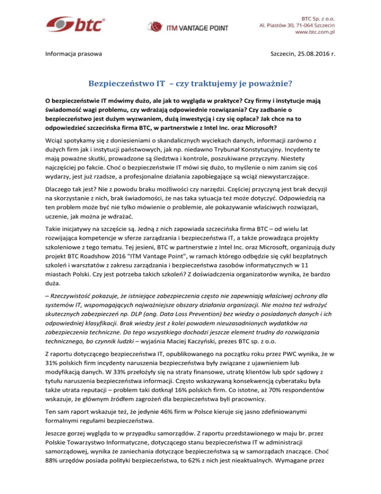 Informacja prasowa Szczecin, 25.08.2016 r. Bezpieczeństwo IT – czy traktujemy je poważnie? O bezpieczeństwie IT mówimy dużo, ale jak to wygląda w praktyce? Czy firmy i instytucje mają świadomość wagi problemu, czy wdrażają odpowiednie rozwiązania? Czy zadbanie o bezpieczeństwo jest dużym wyzwaniem, dużą inwestycją i czy się opłaca? Jak chce na to odpowiedzieć szczecińska firma BTC, w partnerstwie z Intel Inc. oraz Microsoft? Wciąż spotykamy się z doniesieniami o skandalicznych wyciekach danych, informacji zarówno z dużych firm jak i instytucji państwowych, jak np. niedawno Trybunał Konstytucyjny. Incydenty te mają poważne skutki, prowadzone są śledztwa i kontrole, poszukiwane przyczyny. Niestety najczęściej po fakcie. Choć o bezpieczeństwie IT mówi się dużo, to myślenie o nim zanim się coś wydarzy, jest już rzadsze, a profesjonalne działania zapobiegające są wciąż niewystarczające. Dlaczego tak jest? Nie z powodu braku możliwości czy narzędzi. Częściej przyczyną jest brak decyzji na skorzystanie z nich, brak świadomości, że nas taka sytuacja też może dotyczyć. Odpowiedzią na ten problem może być nie tylko mówienie o problemie, ale pokazywanie właściwych rozwiązań, uczenie, jak można je wdrażać. Takie inicjatywy na szczęście są. Jedną z nich zapowiada szczecińska firma BTC – od wielu lat rozwijająca kompetencje w sferze zarządzania i bezpieczeństwa IT, a także prowadząca projekty szkoleniowe z tego tematu. Tej jesieni, BTC w partnerstwie z Intel Inc. oraz Microsoft, organizują duży projekt BTC Roadshow 2016 "ITM Vantage Point", w ramach którego odbędzie się cykl bezpłatnych szkoleń i warsztatów z zakresu zarządzania i bezpieczeństwa zasobów informatycznych w 11 miastach Polski. Czy jest potrzeba takich szkoleń? Z doświadczenia organizatorów wynika, że bardzo duża. – Rzeczywistość pokazuje, że istniejące zabezpieczenia często nie zapewniają właściwej ochrony dla systemów IT, wspomagających najważniejsze obszary działania organizacji. Nie można też wdrożyć skutecznych zabezpieczeń np. DLP (ang. Data Loss Prevention) bez wiedzy o posiadanych danych i ich odpowiedniej klasyfikacji. Brak wiedzy jest z kolei powodem nieuzasadnionych wydatków na zabezpieczenia techniczne. Do tego wszystkiego dochodzi jeszcze element trudny do rozwiązania technicznego, bo czynnik ludzki – wyjaśnia Maciej Kaczyński, prezes BTC sp. z o.o. Z raportu dotyczącego bezpieczeństwa IT, opublikowanego na początku roku przez PWC wynika, że w 31% polskich firm incydenty naruszenia bezpieczeństwa były związane z ujawnieniem lub modyfikacją danych. W 33% przełożyły się na straty finansowe, utratę klientów lub spór sądowy z tytułu naruszenia bezpieczeństwa informacji. Często wskazywaną konsekwencją cyberataku była także utrata reputacji – problem taki dotknął 16% polskich firm. Co istotne, aż 70% respondentów wskazuje, że głównym źródłem zagrożeń dla bezpieczeństwa byli pracownicy. Ten sam raport wskazuje też, że jedynie 46% firm w Polsce kieruje się jasno zdefiniowanymi formalnymi regułami bezpieczeństwa. Jeszcze gorzej wygląda to w przypadku samorządów. Z raportu przedstawionego w maju br. przez Polskie Towarzystwo Informatyczne, dotyczącego stanu bezpieczeństwa IT w administracji samorządowej, wynika że zaniechania dotyczące bezpieczeństwa są w samorządach znaczące. Choć 88% urzędów posiada polityki bezpieczeństwa, to 62% z nich jest nieaktualnych. Wymagane przez Krajowe Ramy Interoperacyjności, raportowanie incydentów naruszenia bezpieczeństwa informacji, choć prowadzone przez 53,69% badanych jednostek samorządowych, to w 39% przypadkach były puste, gdyż nie odnotowano w nich żadnego incydentu. Aktualny rejestr posiadało tylko 14% urzędów. Jak więc widać, najczęstszą przyczyną wycieku informacji czy danych z firmy jest czynnik ludzki. Dlatego samym zabezpieczeniem przed atakiem zewnętrznym na zasoby IT nie powstrzymamy działań wewnętrznych, czy to umyślnych czy nieświadomych. Wyniesienie z firmy komputera czy pendrive'a, jest w zasadzie codziennością i często nie zastanawiamy się, co na takim sprzęcie mamy. Podobnie z wysyłaniem plików mailem lub do chmury. Niedawny raport analityczny Kaspersky Lab dotyczący branży komunikacyjnej wykazał, że nawet cyberprzestępcy najczęściej wykorzystują pracowników w celu wykradzenia danych. Jak można zabezpieczyć się przed atakiem? Na pewno można zminimalizować ryzyko wycieku danych. Systemy klasy DLP (Data Loss Prevention) nowej generacji są już w naszym zasięgu, o czym między innymi dowiedzą się szczegółowo uczestnicy spotkań warsztatowych BTC Roadshow 2016. Więcej szczegółów na temat szkoleń BTC Roadshow "ITM Vantage Point" organizator zapowiada na koniec sierpnia. Poznamy też ekspertów, którzy podzielą się swoim doświadczeniem z uczestnikami. – Mamy dużą nadzieję, że naszą inicjatywą uruchomimy poważne myślenie o bezpieczeństwie IT, a także pokażemy, że to nie jest taki duży wysiłek dla organizacji. Dlatego uczestnicy będą mogli bezpłatnie korzystać przez rok (wraz z pełnym wsparciem) z profesjonalnych narzędzi, żeby samemu przekonać się o tym. – podsumowuje Maciej Kaczyński, prezes BTC. BTC sp. z o.o. działa na rynku usług IT od 2003 roku. Swoją działalność rozpoczynała od audytów i usług doradczych w obszarze legalności oprogramowania, konsekwentnie rozwijając kompetencje i zakres usług w sferze zarządzania i bezpieczeństwa IT. BTC oferuje pełen zakres oprogramowania do zarządzania infrastrukturą IT oraz zarządzania bezpieczeństwem informacji (DLP - ang. Data Loss Prevention). BTC ściśle współpracuje z firmami INTEL Inc. oraz Microsoft. Wśród klientów BTC znajdują się przedsiębiorstwa z wielu różnych branż, jak również organizacje czy samorządy, m.in. (Polska Agencja Żeglugi