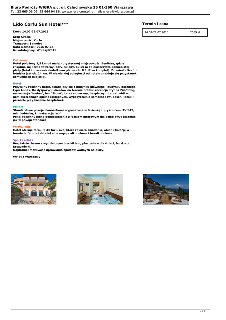 Biuro Podróży WIGRA s.c. ul. Człuchowska 25 01-360 Warszawa Tel. 22 665 06 06, 22 664 94 86, www.wigra.com.pl, e-mail: [email protected] Lido Corfu Sun Hotel*** Korfu 14.07-22.07.2015 Termin i cena 14.07-22.07.2015 2589 zł Kraj: Grecja Miejscowość: Korfu Transport: Samolot Data ważności: 2015-07-14 Nr katalogowy: Wczasy/2015 Położenie Hotel położony 1,5 km od małej turystycznej miejscowości Benitses, gdzie znajdują się liczne tawerny, bary, sklepy, ok.50 m od piaszczysto-kamienistej plaży (leżaki i parasole dodatkowo płatne ok. 8 EUR za komplet). Do miasta Korfu i lotniska jest ok. 14 km. W niewielkiej odległości od hotelu znajduje się przystanek komunikacji miejskiej. Hotel Przytulny rodzinny hotel, składający się z budynku głównego i budynku bocznego typu Annex. Do dyspozycji klientów na terenie hotelu: recepcja czynna 24h/dobę, restauracja "Ionion", bar "Stone", taras słoneczny, bezpłatny Internet wi-fi w pomieszczeniach ogólnodostępnych, wypożyczalnia samochodów, basen (leżaki i parasole przy basenie bezpłatne). Pokoje Standardowe pokoje dwuosobowe wyposażone w łazienkę z prysznicem, TV SAT, mini lodówkę, klimatyzację, Wifi. Pokój rodzinny jedno pomieszczenie z łóżkiem piętrowym dla dzieci (wyposażenie jak w pokoju standard). Wyżywienie Hotel oferuje formułę All Inclusive, która zawiera śniadania, obiad i kolację w formie bufetu, a także lokalne napoje alkoholowe i bezalkoholowe. Sport i relaks Bezpłatnie: basen z wydzielonym brodzikiem, plac zabaw dla dzieci, boisko do koszykówki. Odpłatnie: możliwość uprawiania sportów wodnych na plaży. Wylot z Warszawy 1/1 Powered by TCPDF (www.tcpdf.org)