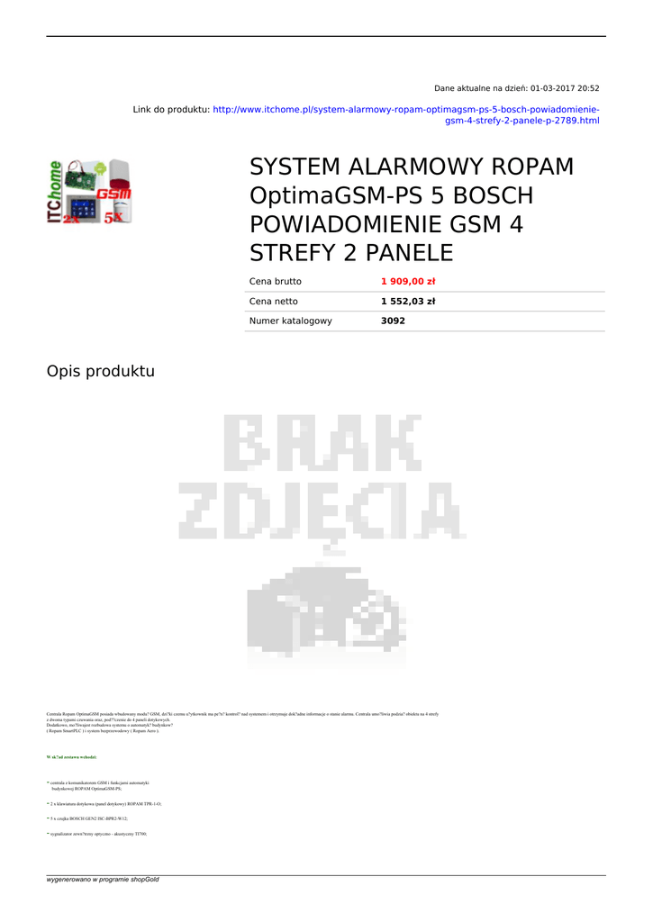Dane aktualne na dzień: 01-03-2017 20:52 Link do produktu: http://www.itchome.pl/system-alarmowy-ropam-optimagsm-ps-5-bosch-powiadomieniegsm-4-strefy-2-panele-p-2789.html SYSTEM ALARMOWY ROPAM OptimaGSM-PS 5 BOSCH POWIADOMIENIE GSM 4 STREFY 2 PANELE Cena brutto 1 909,00 zł Cena netto 1 552,03 zł Numer katalogowy 3092 Opis produktu Centrala Ropam OptimaGSM posiada wbudowany modu? GSM, dzi?ki czemu u?ytkownik ma pe?n? kontrol? nad systemem i otrzymuje dok?adne informacje o stanie alarmu. Centrala umo?liwia podzia? obiektu na 4 strefy z dwoma typami czuwania oraz, pod??czenie do 4 paneli dotykowych. Dodatkowo, mo?liwajest rozbudowa systemu o automatyk? budynkow? ( Ropam SmartPLC ) i system bezprzewodowy ( Ropam Aero ). W sk?ad zestawu wchodzi: - centrala z komunikatorem GSM i funkcjami automatyki budynkowej ROPAM OptimaGSM-PS; - 2 x klawiatura dotykowa (panel dotykowy) ROPAM TPR-1-O; - 5 x czujka BOSCH GEN2 ISC-BPR2-W12; - sygnalizator zewn?trzny optyczno - akustyczny TI700; wygenerowano w programie shopGold - antena ROPAM AT-GSM-MAG; - obudowa z transformatorem MPL220; - akumulator bezobs?ugowy 7Ah 12V; - instrukcja; - oprogramowanie. Uwaga . Central? alarmow? programuje si? za pomoc? komputera. Wymagany jest przewód do programowania MGSM-USB lub MGSM-RS232, który jest dost?pny na naszych pozosta?ych aukcjach. Po zakupie oferujemy bezp?atn? zdaln? pomoc przy pod??czeniu i zaprogramowaniu systemu alarmowego. wygenerowano w programie shopGold Centrala z komunikatorem GSM i funkcjami automatyki budynkowej ROPAM OptimaGSM-PS wraz z anten? ANT-MAG W?a?ciwo?ci: - czterostrefowa kompaktowa centrala alrmowa SMS/VOICE/CLIP/GPRS/MMS; - zasilacz buforowy 12V/2A; - 8 numerów powiadomienia; - 4 strefy z dwoma typami czuwania; - od 8 do 32 wej?? ( rozbudowa za pomoc? ekspanderów EXP-I8); - od 8 do 32 wyj??; wygenerowano w programie shopGold - wej?cie analogowe; - mo?lowo?? pod??czenia do 4 czujników temperatury; - obs?uga do 4 paneli dotykowych TPR-xx; - monitoring GPRS, TermostatGSM, KeyGSM; - TerminalSMS, LoggerTemp, LogicProcessor. Zasilanie: 17÷20V/AC lub 20÷30V/DC (II klasa izolacji). Uwaga. Central? programuje si? poprzez kabel MGSM-USB lub MGSM-RS232 (brak w zestawie) Centrala alarmowa OPTIMAGSM wraz z urz?dzeniami peryferyjnymi to rozwi?zanie integruj?ce elektroniczny system sygnalizacji w?amania i automatyk? budynkow? z wykorzystaniem technologii SmartPLC. Wbudowany komunikator GSM pozwala na zdaln? kontrol? i sterowanie systemem. Dzi?ki modu?owej konstrukcji system mo?e by? rozbudowany i dostosowywany do zmieniaj?cych si? potrzeb u?ytkownika. Zobacz pe?ny opis. Program do konfiguracji OptimaGSM Manager 2 x klawiatura dotykowa (panel dotykowy) ROPAM TPR-1-O wygenerowano w programie shopGold - wydajny i energooszcz?dny procesor ARM Cortex--M3, 32-bitowy; - wbudowany stabilny i wydajny system czasu rzeczywistego RTOS; - kolorowy wy?wietlacz 3,5- TFT LCD, 65 tys. kolorów; - panel dotykowy -TouchPanel-, bez mechanicznych styków; - interaktywne graficzne menu z piktogramy (ikony); - funkcja losowego uk?adu klawiatury numerycznej; - tekstowe podpowiedzi dla danych funkcji; - intuicyjne kontrola i sterowanie systemem; - sterowanie wyj?ciami modu?u; - szybkie sterowanie wyj?ciem przeka?nikowym w TPR-1; - diody LED statusu systemu; - pasek dodatkowych informacji o stanie systemu; - sygnalizacja akustyczna; - wygaszacz ekranu z funkcj? kalendarza i zegara; - wbudowany czujnik temperatury; - dwa wej?cia alarmowe; - magistrala EIA 485 protokó? ROPAMNet; - lokalny port RS232TTL; - funkcja uaktualnienia oprogramowania; - rejestracja historii temperatury z dwóch czujników i wej?cia analogowego na karcie SD; - histogram temperatury T1 i T2 w menu stanu systemu; - obs?uga karty SD: plan budynku (tablica synoptyczna) oraz cyfrowa ramka zdj??; - regulacja jasno?ci wy?wietlacza TFT w trybie wygaszacza ekranu; - estetyczna i solidna obudowa z matowej stali nierdzewnej -INOX-; - wymiary:102x82x20 mm (WxHxD); - klasa ?rodowiskowa: II (T:-10+55°C/RH:20-90%, bez kondensacji); - trwa?o?? panelu dotykowego: ok. 2,5 mln dotkni?? ka?dego punktu znormalizowanym stylusem @150g; - zabezpieczenie antysabota?owe obudowy; - roz??czne listwy zaciskowe; - wspó?praca z central? OptimaGSM. 5 x czujka BOSCH GEN2 ISC-BPR2-W12 wygenerowano w programie shopGold Czujki ruchu Blue Line Gen2 PIR (ISC-BPR2) wykorzystuj? dwie soczewki Fresnela zapewniaj?ce ostry obraz w ca?ym polu widzenia oraz wysok? skuteczno?? wykrywania intruzów. Soczewki te charakteryzuj? si? wysok? g?sto?ci?(77 stref) w uk?adzie 7-warstwowym, a regulowana soczewka obszaru bezpo?rednio pod urz?dzeniem umo?liwia skonfigurowanie trzech dodatkowych stref kontrolowanych. ?atwa instalacja, ró?norodne opcje monta?u oraz nowoczesne technologie wykrywania gwarantuj? ochron? na najwy?szym poziomie. Przetwarzanie FSP (First Step Processing) umo?liwia niemal natychmiastow? reakcj? na obecno?? cz?owieka bez generowania fa?szywych alarmów z innych ?róde?. Czu?o?? zale?y od analizowanych parametrów sygna?u: amplitudy, polaryzacji, nachylenia i czasu. Eliminuje to konieczno?? wyboru poziomu czu?o?ci przez instalatora, co przyczynia si? do zwi?kszenia ?atwo?ci monta?u i niezawodno?ci. Dynamiczna kompensacja temperaturowa. Czujka samodzielnie dostosowuje swoj? czu?o??, dzi?ki czemu mo?e identyfikowa? intruzów przy praktycznie dowolnych temperaturach. Posiada zasi?g na ca?ej powierzchni. Udoskonalone parametry monitorowania strefy bezpo?rednio pod urz?dzeniem oraz obszaru monitorowania rz?du 12 m x 12 m pozwoli?y na uzyskanie zasi?gu na ca?ej powierzchni. wygenerowano w programie shopGold Sygnalizator zewn?trzny optyczno-akustyczny TI700 wygenerowano w programie shopGold TI 700 to zewn?trzny, optyczno-akustyczny sygnalizator do zastosowa? w systemie alarmowych. Sygnalizator wyposa?ono w przetwornik piezoelektryczny emituj?cy d?wi?k o maksymalnym nat??eniu 120dB. Sygnalizacja optyczna realizowana jest za pomoc? diód LED. Urz?dzenie wyposa?ono w trzy systemy antysab